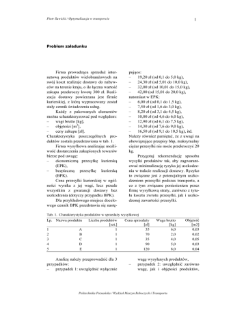Piotr Sawicki / Optymalizacja w transporcie 1 Problem załadunku Firma prowadząca sprzedaż internetową produktów wielobranżowych na swój koszt realizuje dostawy do nabywców na terenie kraju, o ile łączna wartość zakupu przekroczy kwotę 300 zł. Realizacja dostawy powierzana jest firmie kurierskiej, z którą wypracowany został stały cennik świadczenia usług. Każdy z pakowanych elementów można scharakteryzować pod względem: – wagi brutto [kg], – objętości [m3], – ceny zakupu [zł]. Charakterystyka poszczególnych produktów została przedstawiona w tab. 1. Firma wysyłkowa analizując możliwość dostarczenia zakupionych towarów bierze pod uwagę: – ekonomiczną przesyłkę kurierską (EPK), – bezpieczną przesyłkę kurierską (BPK). Cena przesyłki kurierskiej w ogólności wynika z jej wagi, lecz przede wszystkim z gwarancji dostawy bez uszkodzenia (dotyczy przypadku BPK). Dla przykładowego miejsca docelowego cennik BPK przedstawia się nastę- pująco: – 19,20 zł (od 0,1 do 5,0 kg), – 24,30 zł (od 5,01 do 10,0 kg), – 32,00 zł (od 10,01 do 15,0 kg), – 42,00 (od 15,01 do 20,0 kg), natomiast w EPK: – 6,00 zł (od 0,1 do 1,5 kg), – 7,50 zł (od 1,6 do 3,0 kg), – 8,20 zł (od 3,1 do 4,5 kg), – 10,00 zł (od 4,6 do 6,0 kg), – 12,90 zł (od 6,1 do 7,5 kg), – 14,30 zł (od 7,6 do 9,0 kg), – 16,50 zł (od 9,1 do 10,5 kg), itd. Należy również pamiętać, że z uwagi na obowiązujące przepisy bhp, maksymalny ciężar przesyłki nie może przekroczyć 20 kg. Przygotuj rekomendację sposobu wysyłki produktów tak, aby zagwarantować minimalizację ryzyka jej uszkodzenia w trakcie realizacji dostawy. Ryzyko to związane jest z potencjalnym uszkodzeniem przesyłki podczas transportu, a co z tym związane poniesieniem przez firmę wysyłkową straty, zarówno z tytułu kosztu zwrotu przesyłki, jak i uszkodzonej zawartości przesyłki. Tab. 1. Charakterystyka produktów w sprzedaży wysyłkowej Lp. Nazwa produktu 1 2 3 4 5 A B C D E Liczba produktów [szt.] 1 1 1 1 1 Analizę należy przeprowadzić dla 3 przypadków: – przypadek 1: uwzględnić wyłącznie Cena sprzedaży [zł] 35 70 35 90 120 – Waga brutto [kg] 6,0 2,0 4,0 5,0 8,0 Objętość [m3] 0,03 0,02 0,05 0,03 0,04 wagę wysyłanych produktów, przypadek 2: uwzględnić zarówno wagę, jak i objętości produktów, Politechnika Poznańska / Wydział Maszyn Roboczych i Transportu Piotr Sawicki / Optymalizacja w transporcie – przy czym pojemności poszczególnych paczek znajdują się w tab. 2, przypadek 3: uwzględnić wagę oraz objętości produktów, a także zróżnicowaną liczbę każdego produktu (A: 2 szt., B: 2 szt., C-E: po 3 szt.), przy czym za opłacalne przyjmuje się wysłanie maksymalnie 3 BPK. 2 Tab. 2. Charakterystyka paczek stosowanych w usłudze – bezpieczna przesyłka kurierska Lp. 1 2 3 4 Rodzaj paczki [kg] 0,1 – 5,0 5,1 – 10,0 10,1 – 15,0 15,1 – 20,0 Politechnika Poznańska / Wydział Maszyn Roboczych i Transportu Objętość paczki [m3] 0,01 0,06 0,10 0,15