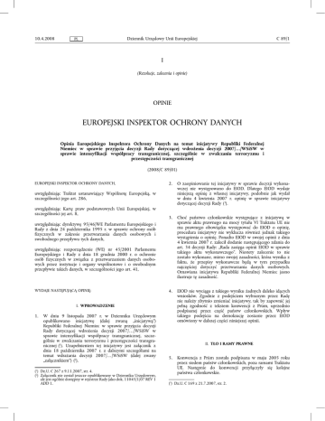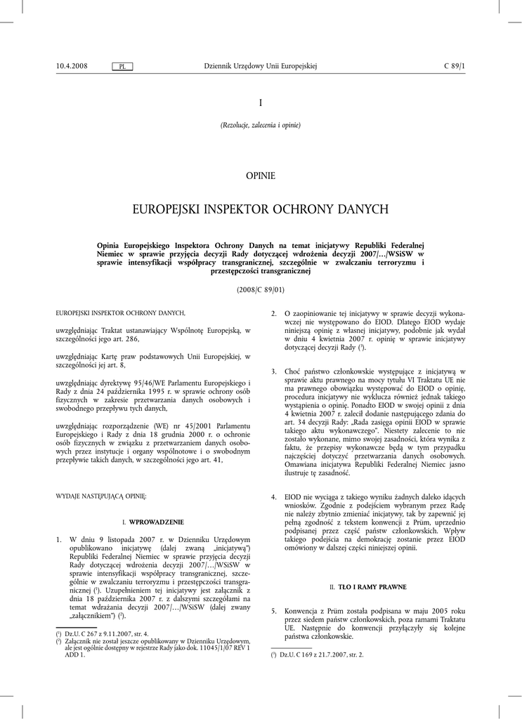 10.4.2008 Dziennik Urzędowy Unii Europejskiej PL C 89/1 I (Rezolucje, zalecenia i opinie) OPINIE EUROPEJSKI INSPEKTOR OCHRONY DANYCH Opinia Europejskiego Inspektora Ochrony Danych na temat inicjatywy Republiki Federalnej Niemiec w sprawie przyjęcia decyzji Rady dotyczącej wdrożenia decyzji 2007/…/WSiSW w sprawie intensyfikacji współpracy transgranicznej, szczególnie w zwalczaniu terroryzmu i przestępczości transgranicznej (2008/C 89/01) EUROPEJSKI INSPEKTOR OCHRONY DANYCH, 2. O zaopiniowanie tej inicjatywy w sprawie decyzji wykonawczej nie występowano do EIOD. Dlatego EIOD wydaje niniejszą opinię z własnej inicjatywy, podobnie jak wydał w dniu 4 kwietnia 2007 r. opinię w sprawie inicjatywy dotyczącej decyzji Rady (3). 3. Choć państwo członkowskie występujące z inicjatywą w sprawie aktu prawnego na mocy tytułu VI Traktatu UE nie ma prawnego obowiązku występować do EIOD o opinię, procedura inicjatywy nie wyklucza również jednak takiego wystąpienia o opinię. Ponadto EIOD w swojej opinii z dnia 4 kwietnia 2007 r. zalecił dodanie następującego zdania do art. 34 decyzji Rady: „Rada zasięga opinii EIOD w sprawie takiego aktu wykonawczego”. Niestety zalecenie to nie zostało wykonane, mimo swojej zasadności, która wynika z faktu, że przepisy wykonawcze będą w tym przypadku najczęściej dotyczyć przetwarzania danych osobowych. Omawiana inicjatywa Republiki Federalnej Niemiec jasno ilustruje tę zasadność. 4. EIOD nie wyciąga z takiego wyniku żadnych daleko idących wniosków. Zgodnie z podejściem wybranym przez Radę nie należy zbytnio zmieniać inicjatywy, tak by zapewnić jej pełną zgodność z tekstem konwencji z Prüm, uprzednio podpisanej przez część państw członkowskich. Wpływ takiego podejścia na demokrację zostanie przez EIOD omówiony w dalszej części niniejszej opinii. uwzględniając Traktat ustanawiający Wspólnotę Europejską, w szczególności jego art. 286, uwzględniając Kartę praw podstawowych Unii Europejskiej, w szczególności jej art. 8, uwzględniając dyrektywę 95/46/WE Parlamentu Europejskiego i Rady z dnia 24 października 1995 r. w sprawie ochrony osób fizycznych w zakresie przetwarzania danych osobowych i swobodnego przepływu tych danych, uwzględniając rozporządzenie (WE) nr 45/2001 Parlamentu Europejskiego i Rady z dnia 18 grudnia 2000 r. o ochronie osób fizycznych w związku z przetwarzaniem danych osobowych przez instytucje i organy wspólnotowe i o swobodnym przepływie takich danych, w szczególności jego art. 41, WYDAJE NASTĘPUJĄCĄ OPINIĘ: I. WPROWADZENIE 1. W dniu 9 listopada 2007 r. w Dzienniku Urzędowym opublikowano inicjatywę (dalej zwaną „inicjatywą”) Republiki Federalnej Niemiec w sprawie przyjęcia decyzji Rady dotyczącej wdrożenia decyzji 2007/…/WSiSW w sprawie intensyfikacji współpracy transgranicznej, szczególnie w zwalczaniu terroryzmu i przestępczości transgranicznej (1). Uzupełnieniem tej inicjatywy jest załącznik z dnia 18 października 2007 r. z dalszymi szczegółami na temat wdrażania decyzji 2007/…/WSiSW (dalej zwany „załącznikiem”) (2). (1) Dz.U. C 267 z 9.11.2007, str. 4. (2) Załącznik nie został jeszcze opublikowany w Dzienniku Urzędowym, ale jest ogólnie dostępny w rejestrze Rady jako dok. 11045/1/07 REV 1 ADD 1. II. TŁO I RAMY PRAWNE 5. Konwencja z Prüm została podpisana w maju 2005 roku przez siedem państw członkowskich, poza ramami Traktatu UE. Następnie do konwencji przyłączyły się kolejne państwa członkowskie. (3) Dz.U. C 169 z 21.7.2007, str. 2. C 89/2 PL Dziennik Urzędowy Unii Europejskiej 6. Uzupełnieniem konwencji z Prüm jest porozumienie wykonawcze, oparte na art. 44 konwencji i zawarte w dniu 5 grudnia 2006 r. To porozumienie wykonawcze jest konieczne, żeby konwencja z Prüm mogła działać. 7. Gdy zostanie przyjęta decyzja Rady 2007/…/WSiSW w sprawie inicjatywy 15 państw członkowskich (dalej zwanej „inicjatywą prümską”), co do której Rada osiągnęła już porozumienie polityczne, główne elementy konwencji z Prüm zostaną włączone do porządku prawnego Unii Europejskiej. Od samego początku włączenie ich było zamiarem umawiających się stron Traktatu UE, co potwierdza preambuła konwencji z Prüm. 8. Chodziło o to, by w procedurze legislacyjnej prowadzącej do przyjęcia decyzji Rady nie dyskutować już istotnych spraw, tylko osiągnąć porozumienie co do gotowego tekstu konwencji z Prüm. Zamiar ten miał tym większą wagę, że w czasie tej procedury legislacyjnej trwała ratyfikacja konwencji w niektórych państwach członkowskich, a sama konwencja weszła w życie. III. PRZEDMIOT NINIEJSZEJ OPINII I JEGO UJĘCIE 9. Niniejsza opinia skupi się na projekcie decyzji Rady w sprawie przepisów wykonawczych. Uwagi poczynione w poprzedniej opinii EIOD na temat decyzji Rady w sprawie inicjatywy prümskiej zachowują aktualność, i nie będą tu powtarzane, chyba że będzie to konieczne do uwypuklenia kwestii, które prawodawca mógłby jeszcze rozwiązać dzięki przepisom wykonawczym. 10. Przy okazji należy zaznaczyć, że przepisy wykonawcze są szczególnie ważne, gdyż oprócz niektórych kwestii administracyjnych i technicznych określają kluczowe aspekty i narzędzia samego systemu i jego działania. Na przykład w rozdziale 1 przepisów wykonawczych ustala się definicje terminów stosowanych w decyzji Rady w sprawie Prüm. Ponadto w przepisach wykonawczych ustanawia się wspólne przepisy dotyczące wymiany danych (rozdział 2), a potem określa się konkretne cechy wymiany danych DNA (rozdział 3), danych daktyloskopijnych (rozdział 4) i danych rejestracyjnych pojazdów (rozdział 5). Końcowe przepisy rozdziału 6 zawierają istotne dyspozycje na temat przyjmowania kolejnych przepisów wykonawczych w instrukcjach oraz na temat oceny stosowania decyzji. 11. Ponadto omówiony zostanie załącznik w stopniu, w jakim pomaga on — lub powinien pomóc — określić