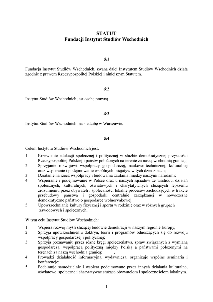 STATUT Fundacji Instytut Studiów Wschodnich &1 Fundacja Instytut Studiów Wschodnich, zwana dalej Instytutem Studiów Wschodnich działa zgodnie z prawem Rzeczypospolitej Polskiej i niniejszym Statutem. &2 Instytut Studiów Wschodnich jest osobą prawną. &3 Instytut Studiów Wschodnich ma siedzibę w Warszawie. &4 Celem Instytutu Studiów Wschodnich jest: 1. 2. 3. 4. 5. Krzewienie edukacji społecznej i politycznej w służbie demokratycznej przyszłości Rzeczypospolitej Polskiej i państw położonych na terenie za naszą wschodnią granicą; Sprzyjanie rozwojowi współpracy gospodarczej, naukowo-technicznej, kulturalnej oraz wspieranie i podejmowanie wspólnych inicjatyw w tych dziedzinach; Działanie na rzecz współpracy i budowania zaufania między naszymi narodami; Wspieranie i podejmowanie w Polsce oraz u naszych sąsiadów ze wschodu, działań społecznych, kulturalnych, oświatowych i charytatywnych służących lepszemu zrozumieniu przez obywateli i społeczności lokalne procesów zachodzących w trakcie przebudowy państwa i gospodarki centralnie zarządzanej w nowoczesne demokratyczne państwo o gospodarce wolnorynkowej. Upowszechnianie kultury fizycznej i sportu w rodzinie oraz w różnych grupach zawodowych i społecznych, W tym celu Instytut Studiów Wschodnich: 1. 2. 3. 4. 5. Wspiera rozwój myśli służącej budowie demokracji w naszym regionie Europy; Sprzyja upowszechnieniu doktryn, teorii i programów odnoszących się do rozwoju współpracy gospodarczej i politycznej; Sprzyja poznawaniu przez różne kręgi społeczeństwa, spraw związanych z wymianą gospodarczą, współpracą polityczną między Polską a państwami położonymi na , terenach za naszą wschodnią granicą; Prowadzi działalność informacyjną, wydawniczą, organizuje wspólne seminaria i konferencje; Podejmuje samodzielnie i wspiera podejmowane przez innych działania kulturalne, oświatowe, społeczne i charytatywne służące obywatelom i społecznościom lokalnym. 1 &5 Zadania określone w &4 Instytut Studiów Wschodnich realizuje przez: 1. 2. 3. 4. 5. 6. 7. 8. 9. 10. 11. 12. Organizowanie dorocznego Forum Ekonomicznego z udziałem przedstawicieli polityki i życia gospodarczego z kraju i zagranicy, a także organizowanie lub wspomaganie odczytów, sympozjów, kursów, spotkań dyskusyjnych i innych podobnych imprez; Prowadzenie lub wspieranie prac badawczych i dokumentacyjnych; Fundowanie stypendiów służących wspieraniu pracy twórczej i procesów dydaktycznych; Przyznawanie nagród za osiągnięcia w działalności naukowej, oświatowej, kulturalnej i społecznej; Wydawanie książek i rozpowszechnianie oraz wspomaganie wydawania i rozpowszechniania książek, biuletynów i tym podobnych publikacji; Prowadzenie i wspieranie akcji informacyjnych i propagandowych w zakresie szeroko rozumianej edukacji obywatelskiej Współpracę z instytucjami i organizacjami, których cele i zasady są zbieżne z ideałami przyświecającymi Instytutowi Studiów Wschodnich oraz z osobami zainteresowanymi uczestnictwem w realizacji zadań Instytutu Studiów Wschodnich; Współfinansowanie działań podejmowanych przez inne podmioty w zakresie określonym w&4 i &5; Organizowanie olimpiad tematycznych, konkursów wiedzy poświęconych problematyce związanej z przebudową struktur państwa i gospodarki; Przygotowywanie i finansowanie praktyk wakacyjnych oraz obozów językowych dla młodzieży akademickiej z Białorusi, Rosji i Ukrainy i pomoc innym organizacjom realizującym te cele. Organizowanie imprez sportowych (biegi, turnieje piłkarskie, zawody rowerowe, pływackie itp) promujących systematyczną aktywność sportową i jej prozdrowotne, społeczne edukacyjne i wychowawcze wartości. Organizowanie imprez kulturalnych (koncerty, festiwale, wystawy, wernisaże itp) promujących kulturę regionu oraz kraju. &6 Instytut Studiów Wschodnich może prowadzić działalność gospodarczą na własny rachunek bądź przez udział w spółkach i spółdzielniach w następującym zakresie: 1. Wytwarzania i rozpowszechniania publikacji dotyczących spraw objętych statutowymi zadaniami Instytutu Studiów Wschodnich; 2. Organizowania targów, kiermaszy oraz imprez promocyjnych. &7 Majątek Instytutu Studiów Wschodnich tworzy się z: 1. Kwoty pieniężnej przeznaczonej przez fundatora w akcie ustanowienia Instytutu Studiów Wschodnich; 2 2. 3. 4. 5. 6. Darowizn, spadków i zapisów; Dotacji; Datków uzyskiwanych w ramach zbiórek publicznych; Dochodów z działalności gospodarczej; Dochodów z majątku Instytutu Studiów Wschodnich. &8 Organami Instytutu Studiów Wschodnich są: 1. 2. Rada Fundacji Instytutu Studiów Wschodnich. Zarząd Fundacji. &9 1. 2. 3. 4. W skład Rady Fundacji Instytutu Studiów Wschodnich wchodzi fundator, a nadto mogą wchodzić osoby przez niego dokooptowane w myśl ust.2; Rada Fundacji może w drodze jednomyślnej uchwały podjętej przez wszystkich jej członków dokooptować do swego składu osoby fizyczne. Ogólna liczba członków Rady Fundacji nie może jednak przekraczać pięciu; W przypadku dokooptowania Rada Fundacji podejmuje uchwały, z zastrzeżeniem ust.2 i 4 oraz &15, &16 i &17, bezwzględną większością głosów w obecności co najmniej połowy ogólnej liczby jej członków; Członkostwo w Radzie Fundacji jest niezbywalne i nie dziedziczne. Członek Rady Fundacji może być przez nią odwołany w drodze uchwały podjętej zgodnie z ust.2. &10 Rada Fundacji: 1. 2. 3. 4. Określa zasady i sposób prowadzenia gospodarki finansowej Instytutu Studiów Wschodnich; Powołuje i odwołuje członków Zarządu oraz ustala zasady i stawki ich wynagrodzenia; Nadzoruje pracę zarządu; Podejmuje uchwały w innych sprawach określonych w niniejszym statucie. &11 1. Zarząd składa się od 1 - 3 osób powoływanych i odwoływanych przez Radę Fundacji. 2. Zarząd składa się z Prezesa Zarządu, który przewodniczy pracom Zarządu, a w przypadku Zarządu wieloosobowego tak