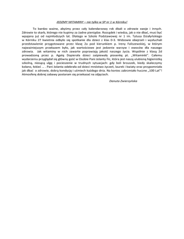 JEDZMY WITAMINY – nie tylko w SP nr 1 w Kórniku! To bardzo ważne, abyśmy przez cały kalendarzowy rok dbali o zdrowie swoje i innych. Zdrowie to skarb, którego nie kupimy za żadne pieniądze. Rozsądek i wiedza, jak o nie dbać, musi być wpajana już od najmłodszych lat. Dlatego w Szkole Podstawowej nr 1 im. Tytusa Działyńskiego w Kórniku 27 kwietnia odbyło się spotkanie dla dzieci z klas 0-3. Widzowie obejrzeli i wysłuchali przedstawienie przygotowane przez klasę 2a pod kierunkiem p. Ireny Faliszewskiej, w którym najważniejszym przekazem było, jak wartościowe jest jedzenie warzyw i owoców dla naszego zdrowia. Jak witaminy w nich zawarte poprawiają jakość naszego życia. Wspólnie z klasą 2d prowadzoną przez p. Agatę Dopierała dzieci zaśpiewały piosenkę pt. „Witaminki”. Całemu wydarzeniu przyglądał się główny gość w Osobie Pani Jolanty Fic, która jest naszą ulubioną higienistką szkolną, niosącą ulgę i pocieszenie w trudnych sytuacjach: gdy boli brzuszek, kiedy skaleczymy kolano, łokieć … . Pani Jolanta odebrała od dzieci mnóstwo życzeń, laurek i kwiaty oraz przypomniała jak dbać o zdrowie, dobrą kondycję i uśmiech każdego dnia. Na koniec zabrzmiało huczne „100 Lat”! Atmosferę dobrej zabawy postaram się przekazać na zdjęciach. Danuta Zwierzyńska