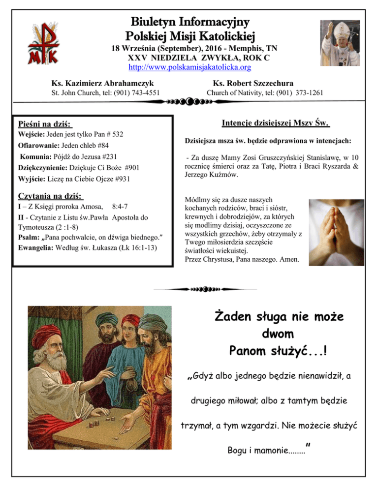 Biuletyn Informacyjny Polskiej Misji Katolickiej 18 Września (September), 2016 - Memphis, TN XXV NIEDZIELA ZWYKŁA, ROK C http://www.polskamisjakatolicka.org Ks. Kazimierz Abrahamczyk St. John Church, tel: (901) 743-4551 Pieśni na dziś: Wejście: Jeden jest tylko Pan # 532 Ofiarowanie: Jeden chleb #84 Komunia: Pójdź do Jezusa #231 Dziękczynienie: Dziękuje Ci Boże #901 Wyjście: Liczę na Ciebie Ojcze #931 Czytania na dziś: I – Z Księgi proroka Amosa, 8:4-7 II - Czytanie z Listu św.Pawła Apostoła do Tymoteusza (2 :1-8) Psalm: „Pana pochwalcie, on dźwiga biednego.” Ewangelia: Według św. Łukasza (Łk 16:1-13) Ks. Robert Szczechura Church of Nativity, tel: (901) 373-1261 Intencje dzisiejszej Mszy Św. Dzisiejsza msza św. będzie odprawiona w intencjach: - Za duszę Mamy Zosi Gruszczyńskiej Stanislawę, w 10 rocznicę śmierci oraz za Tatę, Piotra i Braci Ryszarda & Jerzego Kuźmów. Módlmy się za dusze naszych kochanych rodziców, braci i sióstr, krewnych i dobrodziejów, za których się modlimy dzisiaj, oczyszczone ze wszystkich grzechów, żeby otrzymały z Twego miłosierdzia szczęście światłości wiekuistej. Przez Chrystusa, Pana naszego. Amen. Żaden sługa nie może dwom Panom służyć...! „Gdyż albo jednego będzie nienawidził, a drugiego miłował; albo z tamtym będzie trzymał, a tym wzgardzi. Nie możecie służyć Bogu i mamonie........” Wolność od mamony Jezus Chrystus wskazuje uczniom w Ewangelii: „Nie możecie służyć Bogu i Mamonie!”. Wydaje się, że ta przestroga odnosi się najpierw do pierwotnego znaczenia tego słowa, które oznaczało zabezpieczenie, oparcie, pewność. Z czasem słowo „mamona” zaczęło bożka pieniędzy i bogactwa. Słowo Boże daje nam jednak także i inną przestrogę. Chodzi o to, że nad pieniądzem trzeba panować. W innym wypadku on zapanuje nad człowiekiem. I wtedy stanie się ów człowiek konsumentem rozrywek, przyjemności zmysłowych, hazardu, a nawet sławy czy kariery. A bożek będzie domagał się wciąż nowych ofiar, wynikających z coraz większego nienasycenia. W zachowaniu ludzkim możemy dostrzec dziwną zależność: człowiek podejmuje logiczne, refleksyjne, a i uczciwe działanie dopiero wtedy, gdy zostaje postawiony w jednoznacznych sytuacjach z których wynika, że wcześniej zachowywał się nieuczciwie. Podobnie jak w przypowieści o nieuczciwym zarządcy, który ma świadomość, że jego zwolnienie jest nieuniknione. Dopiero wtedy tak naprawdę otwiera oczy i dostrzega dramat swojego położenia. W świetle pytania właściciela widzi nieuczciwość w swoim zachowaniu. Dotychczas korzystał bowiem ze swojego stanowiska, aby trwonić dla własnych celów majątek swojego pana. Teraz wie, że stracił zaufanie i posiadane stanowisko. Jezus chwali jednak nieuczciwego zarządcę. Ale wcale nie za to, że przywłaszcza sobie bezprawnie dobra innych i pozyskuje sobie przyjaciół kosztem właściciela. Nie chwali jednak sama postawa zarządcy, ale tylko jego przezorność; pomysłowość, z jaką rozwiązał trudną sytuację i nie poddał się zwątpieniu. Zarządca wybiera sposób wyjścia z trudnej sytuacji. Dotąd prawie nie zauważał istnienia innych, myślał tylko o sobie i o swoich interesach. Teraz odkrywa wartość przyjaźni. Ocalenie siebie dokonuje się przez otwarcie na innych. I właśnie ta jego zapobiegliwość, otwartość na drugiego człowieka, zostaje pochwalona, a nie sposoby, których używa, aby zapewnić sobie przyszłość. Ważnym środkiem do panowania nad sobą, nad pragnieniami woli i poruszeniami serca, jest asceza, której przejawem staje wewnętrzna samodyscyplina. Pomaga ona realizować życie duchowe, zdobywać świętość. Dyscyplina pomaga też zmniejszyć stawianie siebie w centrum, by skoncentrować się na Jezusie i życiu zgodnym z Jego duchem oraz na miłości bliźniego, która chroni przed samolubstwem. Jako uczniowie Jezusa powinniśmy działać z taką samą przezornością, zręcznością i otwarciem na drugiego człowieka, jak tego dokonał ewangeliczny zarządca. Często zdarza się jednak, że kiedy w naszym życiu chodzi o wzniosłe sprawy naszego zbawienia, to wówczas my, „synowie światłości”, nie podejmujemy radykalnych i zdecydowanych decyzji. Stajemy się wówczas opieszali, leniwi i zrezygnowani. Nie ma w nas odpowiedniej energii i motywacji do odważnych zmian. Zaufajmy dziś na nowo Bożej opatrzności. Pamiętajmy, że w jeżeli w naszym życiu za cel wybieramy wieczność – musimy nauczyć się traktować doczesność wyłącznie w kategoriach przygotowania, próby, drogi czy środka, ale nigdy – celu. ks. Leszek Smoliński Kącik Fin ansow y Ofiara zebrana na ostatniej mszy św. w czerwcu wynosiła $198.00. Za kościół zapłacono $100.00 Dla wszystkich ofiarodawców - Bóg Zapłać! Ostatnie Pożegnanie Okres dwumiesięcznej przerwy wakacyjnej był dla wielu rodzin smutny i pełen żałobny. W sobotę 18 czerwca, 2016 roku, odeszła od nas nagle do domu Ojca, Pani Maria Golińska (73). Ciało Pani Marii zostało przewiezione do ukochanej Polski na wieczny spoczynek w pobliżu rodziny i rodzinnych stron. Będzie nam wszystkim brakowało Jej życzliwości i uśmiechu a także smakołyków, sałatek którymi nas „rozpuszczala” na naszych polskich spotkaniach. Jeszcze raz skadamy serdeczne wyrazy współczucia dla Siostry, Córek, Syna i całej Rodziny. Z wielkim smutkiem dowiedzieliśmy się, że 30go sierpnia zmarł po kilkutetniej chorobie nasz amerykanski kolega, który uwielbiał Polskę i wszystko co polskie, Mike Meeks (53). Kilkakrotnie podróżował do Polski, zachwycony jej pięknem myślal nawet o zamieszkaniu w Krakowie. Pierwsza i najwiekszą Jego miłością była muzyka, uwielbiał dobrą muzykę i potrafił ją pięknie grać. Dziękujemy ci Mike za akompaniament do naszych polskich mszy przez kilka lat, za czas spędzony z nami na próbach i przygotowaniach. Serdeczne wyrazy pamięc