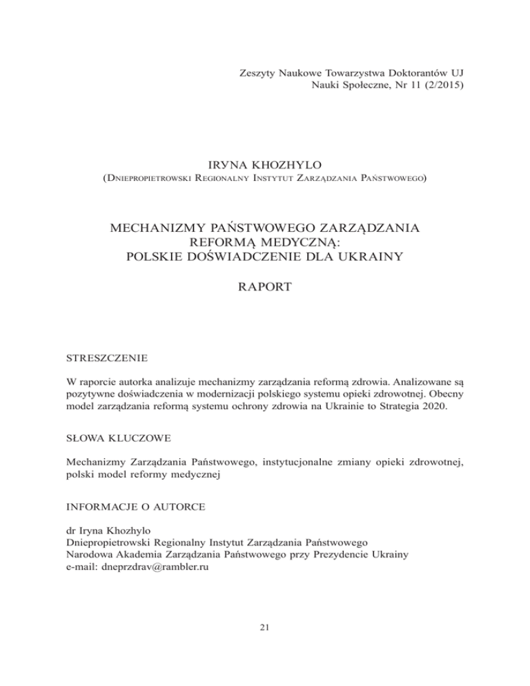 Zeszyty Naukowe Towarzystwa Doktorantów UJ Nauki Społeczne, Nr 11 (2/2015) IRУNA KHOZHYLO (Dniepropietrowski R egionalny Instytut Zarządzania Państwowego) MECHANIZMY PAŃSTWOWEGO ZARZĄDZANIA REFORMĄ MEDYCZNĄ: POLSKIE DOŚWIADCZENIE DLA UKRAINY RAPORT STRESZCZENIE W raporcie autorka analizuje mechanizmy zarządzania reformą zdrowia. Analizowane są pozytywne doświadczenia w modernizacji polskiego systemu opieki zdrowotnej. Obecny model zarządzania reformą systemu ochrony zdrowia na Ukrainie to Strategia 2020. SŁOWA KLUCZOWE Mechanizmy Zarządzania Państwowego, instytucjonalne zmiany opieki zdrowotnej, polski model reformy medycznej INFORMACJE O AUTORCE dr Irуna Khozhylo Dniepropietrowski Regionalny Instytut Zarządzania Państwowego Narodowa Akademia Zarządzania Państwowego przy Prezydencie Ukrainy e-mail: [email protected] 21 Irуna Khozhylo Stan zdrowia ludności jest głównym priorytetem dla każdego kraju na świecie. Ukraina jako niezależne, demokratyczne, prawne, socjalne państwo w najnowszej historii potrafiła nie tylko zachować sieć leczniczo-profilaktycznych zakładów opieki zdrowotnej, ale i zaczęła w 2010 roku aktywnie przebudowywać narodowy system lecznictwa odpowiednio do współczesnych światowych wymogów na podstawie wprowadzenia mechanizmu pilotowego projektowania1. Pierwsze doświadczenie budowy nowego systemu kierowania w zakresie opieki zdrowotnej okazało się zbyt skomplikowane. Należy przede wszystkim podkreślić, że prowadzone w poszczególnych regionach pilotowe projekty zostały opracowane na poziomie centralnego organu zarządzania, czyli w Ministerstwie Zdrowia Ukrainy, i przekazane do regionów zgodnie z procedurą minimalnej publicznej dyskusji. Obecnie Prezydent Ukrainy Petro Poroszenko zainicjował „Strategię rozwoju Ukrainy 2020”2. Celem reform jest osiągnięcie europejskich standardów życia i godnego miejsca Ukrainy w świecie. Zaprezentowana przez prezydenta Ukrainy „Strategia rozwoju Ukrainy 2020” przewiduje realizację sześćdziesięciu reform. Podstawowe z nich to odnowienie władzy i reforma antykorupcyjna, reforma sądowa, decentralizacja i reforma administracji publicznej, deregulacja i rozwój przedsiębiorczości, reforma systemu ochrony porządku prawnego, systemu obrony i bezpieczeństwa narodowego, reforma podatkowa i reforma systemu opieki zdrowotnej. Głównym wskaźnikiem udanej realizacji reformy medycznej w ramach Strategii jest średnia długość życia. W trakcie realizacji reformy medycznej wskaźnik ten powinien wzrosnąć z 71 lat (według danych Banku Światowego, 2013) do 74 lat (wzrost o trzy lata w całym okresie reformowania). Inicjując przeprowadzenie reformy medycznej w ramach pierwszoplanowych zadań „Strategii rozwoju Ukrainy 2020”, Prezydent Ukrainy podkreśla, że zasadniczym wyróżnikiem nowego modelu zarządzania w zakresie opieki zdrowotnej jest społeczna i solidarna podstawa. Prezydent zainicjował uzgodnienie „Strategii rozwoju Ukrainy” na szczeblu narodowym, co oznacza, że nie jest ona narzucona z góry. Każdy może dołączyć się do jej kształtowania, dodać swoje propozycje. W ten sposób władza demonstruje społeczeństwu obywatelskiemu na Ukrainie, ale także społeczności światowej swoją otwartość i gotowość do dialogu. Polska swego czasu przeszła taką drogę realizacji reform. Najbardziej skomplikowane okazały się reformy sfery społecznej – reforma 1 O kolejności przeprowadzenia reformy systemu opieki zdrowotnej w obwodach winnickim, dniepropietrowskim, donieckim i w mieście Kijowie: Ustawa Ukrainy z dnia 07.07.2011, Nr 3612-VI, [online] http://www.zakon1.rada.gov.ua. 2 Strategia rozwoju Ukrainy 2020, [online] http://www.reforms.in.ua/2020. 22 Mechanizmy państwowego zarządzania reformą medyczną... edukacji, reforma systemu emerytalnego i reforma systemu opieki zdrowotnej3. Ich skuteczna realizacja możliwa jest dzięki dialogowi społecznemu i wsparciu informacyjnemu. Powodzenie reformy medycznej zależy, jak twierdzą polscy koledzy, od tego, kto jest podmiotem polityki w zakresie opieki zdrowotnej oraz jakie podmioty są odpowiedzialne za stan zdrowia społeczeństwa. Istotny jest problem prywatyzacji placówek służby zdrowia i jej rola w procesach instytucjonalnej przebudowy, określenie dodatkowych (z wyjątkiem budżetowych i ubezpieczeniowych) źródeł finansowania opieki zdrowotnej, analiza celowości natychmiastowego wdrożenia decentralizacji i integracji instytucji medycznych z punktu widzenia przyszłych korzyści ekonomicznych całej branży4. Oznacza to, że realizacja celów rozwojowych nowej Ukrainy (osiągnięcie europejskich standardów życia i wyznaczenie godnego miejsca Ukrainy w świecie) stanowi wyzwanie dla systemu opieki zdrowotnej i wymaga instytucjonalnej przebudowy na wzór systemów medycznych krajów europejskich. Doświadczenia międzynarodowe pokazują, że osiągnięcie sukcesu w przebudowie systemu opieki zdrowotnej wymaga zachowania zasady społecznej odpowiedzialności za realizację przyjętej reformy medycznej. Właśnie dlatego reforma medyczna jako jedna z ośmiu pierwszoplanowych została włączona do nowej strategii w wektorze ruchu „Odpowiedzialność”. Głównym założeniem tej pracy powinna być nowa umowa społeczna między społeczeństwem obywatelskim, władzą i biznesem. Odpowiedzialność władzy mierzy się sukcesem wprowadzenia reform, służbą wobec społeczeństwa ukraińskiego i oddaną pracą zgodnie z zasadami uczciwości, przejrzystości i prostoty. Odpowiedzialność biznesu to wspieranie rozwoju kraju, środowiska biznesu, społeczeństwa, płacenie podatków, inwestycje w gospodarkę narodową, uczciwa konkurencja i odpowiedzialność społeczna. Odpowiedzialność społeczeństwa ukraińskiego to z kolei kontrolowanie władzy oraz organizacja życia odpowiednio do zasad godności i sumiennego wykonywania swojej pracy. Narodowy model zarządzania reformą medyc