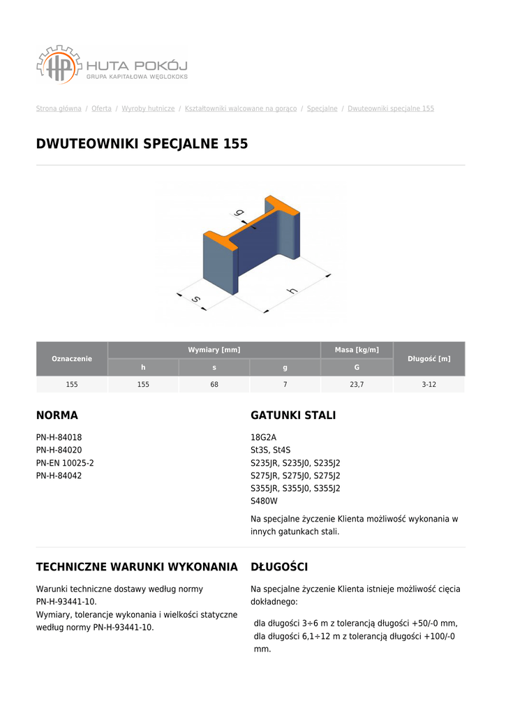 Strona główna / Oferta / Wyroby hutnicze / Kształtowniki walcowane na gorąco / Specjalne / Dwuteowniki specjalne 155 DWUTEOWNIKI SPECJALNE 155 Wymiary [mm] Masa [kg/m] Oznaczenie 155 Długość [m] h s g G 155 68 7 23,7 NORMA GATUNKI STALI PN-H-84018 PN-H-84020 PN-EN 10025-2 PN-H-84042 18G2A St3S, St4S S235JR, S235J0, S235J2 S275JR, S275J0, S275J2 S355JR, S355J0, S355J2 S480W 3-12 Na specjalne życzenie Klienta możliwość wykonania w innych gatunkach stali. TECHNICZNE WARUNKI WYKONANIA DŁUGOŚCI Warunki techniczne dostawy według normy PN-H-93441-10. Wymiary, tolerancje wykonania i wielkości statyczne według normy PN-H-93441-10. Na specjalne życzenie Klienta istnieje możliwość cięcia dokładnego: dla długości 3÷6 m z tolerancją długości +50/-0 mm, dla długości 6,1÷12 m z tolerancją długości +100/-0 mm.