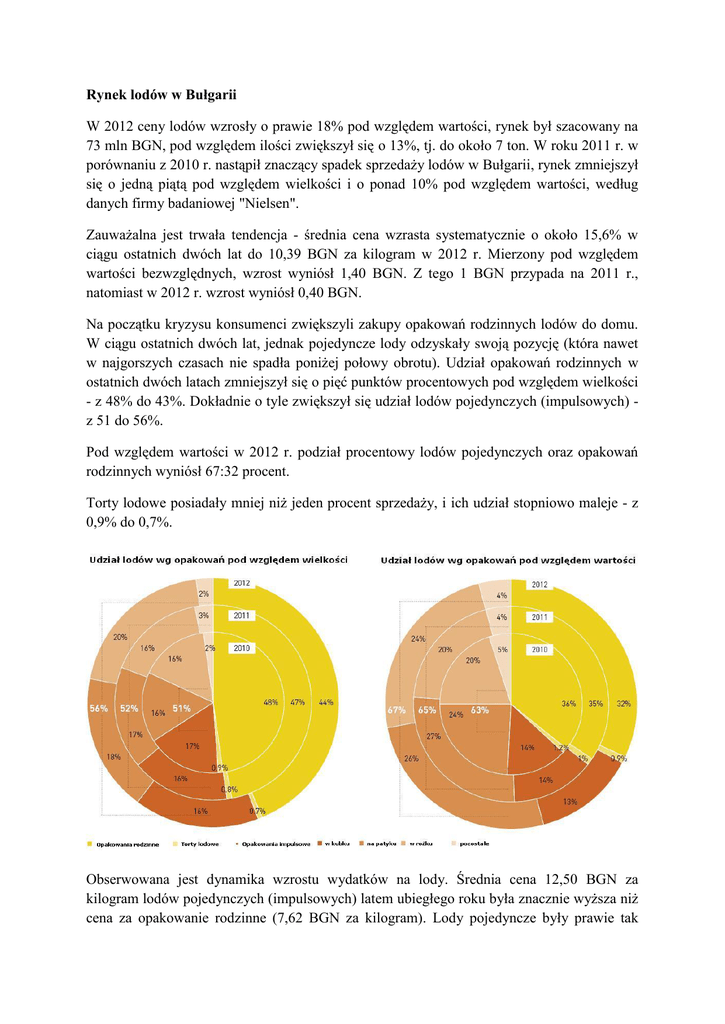 Rynek lodów w Bułgarii W 2012 ceny lodów wzrosły o prawie 18% pod względem wartości, rynek był szacowany na 73 mln BGN, pod względem ilości zwiększył się o 13%, tj. do około 7 ton. W roku 2011 r. w porównaniu z 2010 r. nastąpił znaczący spadek sprzedaży lodów w Bułgarii, rynek zmniejszył się o jedną piątą pod względem wielkości i o ponad 10% pod względem wartości, według danych firmy badaniowej "Nielsen". Zauważalna jest trwała tendencja - średnia cena wzrasta systematycznie o około 15,6% w ciągu ostatnich dwóch lat do 10,39 BGN za kilogram w 2012 r. Mierzony pod względem wartości bezwzględnych, wzrost wyniósł 1,40 BGN. Z tego 1 BGN przypada na 2011 r., natomiast w 2012 r. wzrost wyniósł 0,40 BGN. Na początku kryzysu konsumenci zwiększyli zakupy opakowań rodzinnych lodów do domu. W ciągu ostatnich dwóch lat, jednak pojedyncze lody odzyskały swoją pozycję (która nawet w najgorszych czasach nie spadła poniżej połowy obrotu). Udział opakowań rodzinnych w ostatnich dwóch latach zmniejszył się o pięć punktów procentowych pod względem wielkości - z 48% do 43%. Dokładnie o tyle zwiększył się udział lodów pojedynczych (impulsowych) z 51 do 56%. Pod względem wartości w 2012 r. podział procentowy lodów pojedynczych oraz opakowań rodzinnych wyniósł 67:32 procent. Torty lodowe posiadały mniej niż jeden procent sprzedaży, i ich udział stopniowo maleje - z 0,9% do 0,7%. Obserwowana jest dynamika wzrostu wydatków na lody. Średnia cena 12,50 BGN za kilogram lodów pojedynczych (impulsowych) latem ubiegłego roku była znacznie wyższa niż cena za opakowanie rodzinne (7,62 BGN za kilogram). Lody pojedyncze były prawie tak drogie, jak torty lodowe (13,46 BGN za kilogram). Cena lodów impulsowych wzrosła o 1,53 BGN za kilogram w ciągu ostatnich dwóch lat, cena lodów w opakowaniach rodzinnych wzrosła o 0,84 BGN, a tortów lodowych o 0,57 BGN. W ciągu ostatnich trzech lat, trzy główne rodzaje lodów w opakowaniach pojedynczych wymieniały się pozycją lidera na rynku pod względem wielkości sprzedaży. Latem 2010 r. liderem na rynku w segmencie były lody w kubku z 17% udziałem (w całym rynku). W 2011 r. ich miejsce zajęły lody na patyku z 17% udziałem. A w 2012 r. bezapelacyjnym liderem na rynku były lody w rożku z 20% udziałem w rynku. Ogólny udział w rynku trzech subsegmentów lodów pojedynczych był bardzo podobny i wahał się między 15% a 20% całkowitej wielkości rynku dla każdego z nich. Pod względem wartości jednak ich pozycje są stabilne. W ciągu trzech lat największy udział w rynku miały lody na patyku, następnie lody w rożku. Udział lodów w kubku był prawie połowę mniejszy. Interesującym jest fakt, iż w ubiegłym roku ówczesnemu faworytowi pod względem wartości sprzedaży – lodom w rożku, spadła cena o 0,31 BGN w porównaniu z poprzednim rokiem. Jednak w ciągu ostatnich dwóch lat wzrosła o 0,85 BGN do poziomu 12,47 BGN za kilogram w 2012 r. Ceny lodów w kubku w ciągu ostatnich dwóch lat wzrosły o 1,18 BGN do poziomu 8,48 BGN za kilogram. A ceny lodów na patyku - o około 1,70 BGN do 15,56 BGN za kilogram. Głównym kanałem dystrybucji lodów pozostają małe sklepy spożywcze (do 40 m kw.). Ich udział pozostał na poziomie około 42% pod względem wielkości na rynku w ciągu ostatnich trzech lat. Udział supermarketów (sklepy o powierzchni 41-300 m kw.) zwiększył się. W 2010 r. stanowił 29%, a w 2012 r. osiągnął poziom 34%. Wynika to głównie ze zmniejszeniem się w tym samym okresie z 18 do 14% udziału dużych super i hipermarketów. Prawdopodobnie ilość czasu, który spędza się na zakupach w nich, a także większych "koszyków" z zakupami, nie sprzyjają, aby brać produkty o szybkim topnieniu, takie jak lody, niezależnie czy to są lody impulsowe lub w opakowaniach rodzinnych. Udziały dogodnych punktów sprzedaży, tj. kawiarni i bufetów stanowiły po 5% każdy, a stacje benzynowe miały zaledwie 1% sprzedaży pod względem wielkości. Pod względem wartości, udział trzech formatów sklepów spożywczych był nieco mniejszy niż pod względem wielkości, a w punktach dogodnych, kawiarniach i bufetach oraz stacjach benzynowych większy. Najwyższe średnie ceny odnotowano na stacjach benzynowych - 20,59 BGN za kg przy 10,39 BGN za kg średnio na rynku. Źródło: Regal Opracowano w Wydziale Promocji Handlu i Inwestycji Ambasady RP w Sofii (www.sofia.trade.gov.pl)