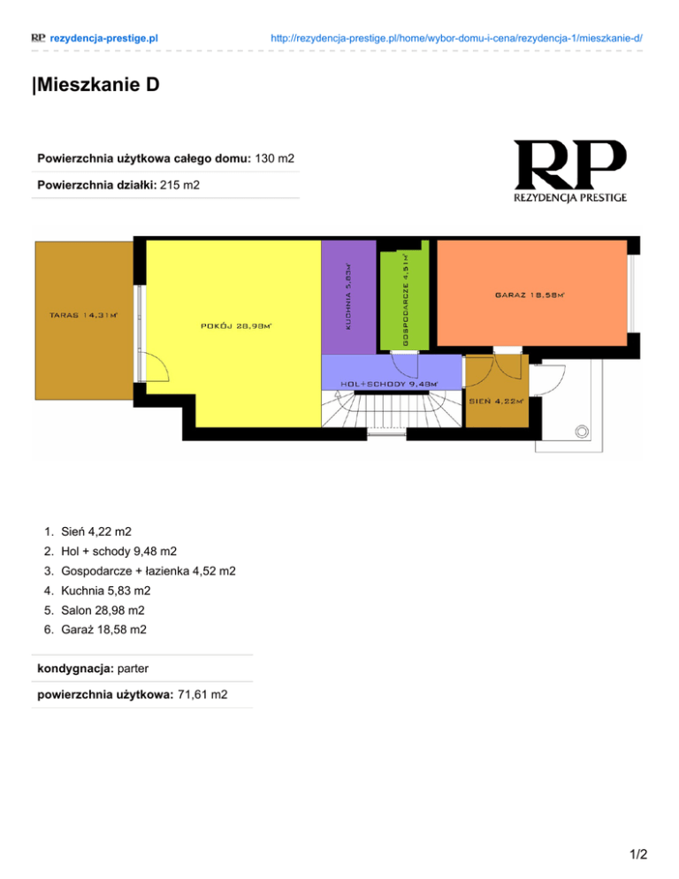 rezydencja-prestige.pl http://rezydencja-prestige.pl/home/wybor-domu-i-cena/rezydencja-1/mieszkanie-d/ |Mieszkanie D Powierzchnia użytkowa całego domu: 130 m2 Powierzchnia działki: 215 m2 1. Sień 4,22 m2 2. Hol + schody 9,48 m2 3. Gospodarcze + łazienka 4,52 m2 4. Kuchnia 5,83 m2 5. Salon 28,98 m2 6. Garaż 18,58 m2 kondygnacja: parter powierzchnia użytkowa: 71,61 m2 1/2 1. Przedpokój 5,12 m2 2. Pokój 10,30 m2 3. Pokój 16,03 m2 4. Łazienka 7,49 m2 5. Pokój 19,45 m2 kondygnacja: 1 Poziom powierzchnia użytkowa: 58,39 m2 Podana na karcie powierzchnia pomieszczeń jest powierzchnią projektową i może się nieznacznie różnić od powierzchni w wybudowanym budynku. Umeblowanie oraz zagospodarowanie terenu jest tylko wizualizacją i nie stanowi oferty handlowej – ma jedynie charakter poglądowy, przybliżający wielkość mieszkania. 2/2