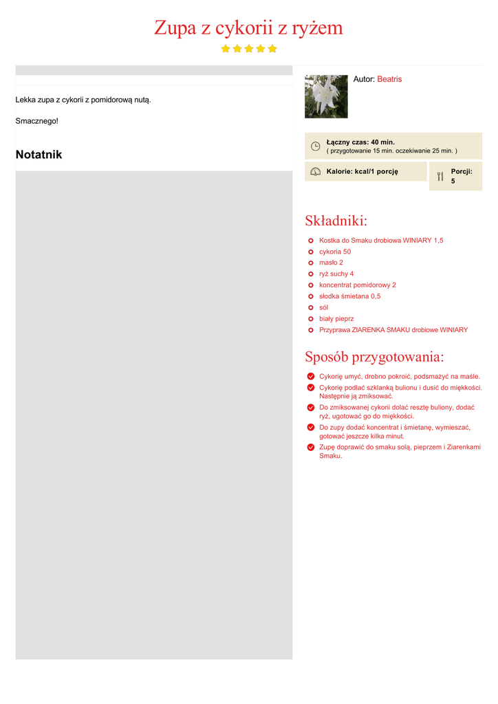 Zupa z cykorii z ryżem Autor: Beatris Lekka zupa z cykorii z pomidorową nutą. Smacznego! Łączny czas: 40 min. Notatnik ( przygotowanie 15 min. oczekiwanie 25 min. ) Kalorie: kcal/1 porcję Porcji: 5 Składniki: Kostka do Smaku drobiowa WINIARY 1,5 cykoria 50 masło 2 ryż suchy 4 koncentrat pomidorowy 2 słodka śmietana 0,5 sól biały pieprz Przyprawa ZIARENKA SMAKU drobiowe WINIARY Sposób przygotowania: Cykorię umyć, drobno pokroić, podsmażyć na maśle. Cykorię podlać szklanką bulionu i dusić do miękkości. Następnie ją zmiksować. Do zmiksowanej cykorii dolać resztę buliony, dodać ryż, ugotować go do miękkości. Do zupy dodać koncentrat i śmietanę, wymieszać, gotować jeszcze kilka minut. Zupę doprawić do smaku solą, pieprzem i Ziarenkami Smaku.