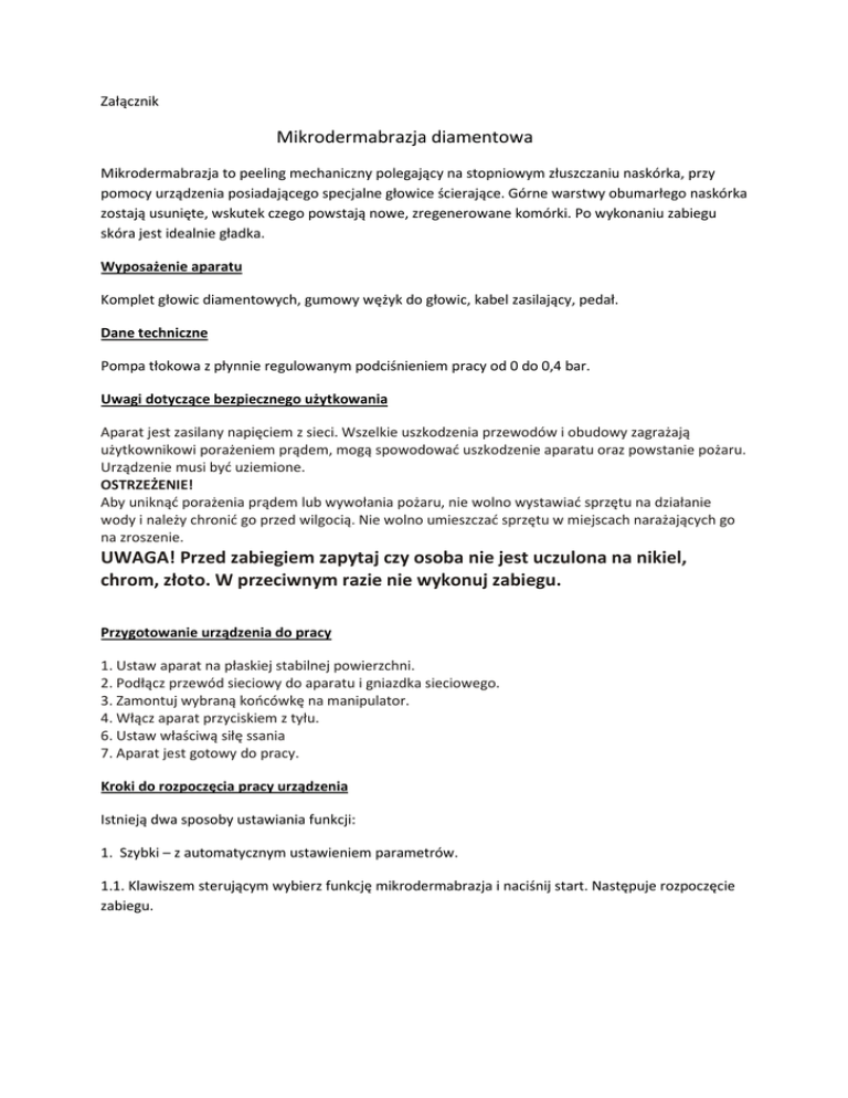 Załącznik Mikrodermabrazja diamentowa Mikrodermabrazja to peeling mechaniczny polegający na stopniowym złuszczaniu naskórka, przy pomocy urządzenia posiadającego specjalne głowice ścierające. Górne warstwy obumarłego naskórka zostają usunięte, wskutek czego powstają nowe, zregenerowane komórki. Po wykonaniu zabiegu skóra jest idealnie gładka. Wyposażenie aparatu Komplet głowic diamentowych, gumowy wężyk do głowic, kabel zasilający, pedał. Dane techniczne Pompa tłokowa z płynnie regulowanym podciśnieniem pracy od 0 do 0,4 bar. Uwagi dotyczące bezpiecznego użytkowania Aparat jest zasilany napięciem z sieci. Wszelkie uszkodzenia przewodów i obudowy zagrażają użytkownikowi porażeniem prądem, mogą spowodować uszkodzenie aparatu oraz powstanie pożaru. Urządzenie musi być uziemione. OSTRZEŻENIE! Aby uniknąć porażenia prądem lub wywołania pożaru, nie wolno wystawiać sprzętu na działanie wody i należy chronić go przed wilgocią. Nie wolno umieszczać sprzętu w miejscach narażających go na zroszenie. UWAGA! Przed zabiegiem zapytaj czy osoba nie jest uczulona na nikiel, chrom, złoto. W przeciwnym razie nie wykonuj zabiegu. Przygotowanie urządzenia do pracy 1. Ustaw aparat na płaskiej stabilnej powierzchni. 2. Podłącz przewód sieciowy do aparatu i gniazdka sieciowego. 3. Zamontuj wybraną końcówkę na manipulator. 4. Włącz aparat przyciskiem z tyłu. 6. Ustaw właściwą siłę ssania 7. Aparat jest gotowy do pracy. Kroki do rozpoczęcia pracy urządzenia Istnieją dwa sposoby ustawiania funkcji: 1. Szybki – z automatycznym ustawieniem parametrów. 1.1. Klawiszem sterującym wybierz funkcję mikrodermabrazja i naciśnij start. Następuje rozpoczęcie zabiegu. 2. Ręczne ustawienie parametrów. 2.1. Klawiszem sterującym wybierz funkcję mikrodermabrazja i zatwierdź klawiszem menu. 2.2. Klawiszem sterującym ustaw czas - zatwierdź klawiszem menu. 2.3. Ekran roboczy. 2.4. W celu rozpoczęcia zabiegu naciśnij start. W dowolnym momencie możesz przerwać zabieg włączając klawisz stop. Zegar zatrzyma się, a po ponownym włączeniu start możesz kontynuować pracę bez konieczności regulacji parametrów. W trakcie trwania zabiegu klawiszami sterującymi możesz regulować wysokość podciśnienia. Konserwacja urządzenia Z chwilą kiedy urządzenie przestaje prawidłowo zasysać powietrze należy wymienić filtr na nowy. W tym celu wyciągnij filtr znajdujący się z tyłu kombajnu i włóż nowy. Jeżeli w Twój kombajn zawiera funkcję dermomasagera filtr mikrodermabrazji należy czyścić wg opisu czyszczenia filtra dermomasagera. Przed podjęciem jakichkolwiek innych czynności konserwacyjnych należy wyjąć wtyczkę zasilacza z gniazda sieciowego. Obudowę można czyścić nawilżoną szmatką, uważając by woda nie dostała się do wnętrza.