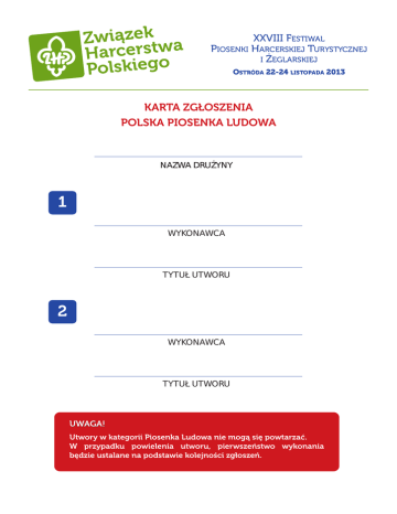 XXVIII FESTIWAL PIOSENKI HARCERSKIEJ TURYSTYCZNEJ I ŻEGLARSKIEJ OSTRÓDA 2224 LISTOPADA 2013 KARTA ZGŁOSZENIA POLSKA PIOSENKA LUDOWA NAZWA DRUŻYNY 1 WYKONAWCA TYTUŁ UTWORU 2 WYKONAWCA TYTUŁ UTWORU UWAGA! Utwory w kategorii Piosenka Ludowa nie mogą się powtarzać. W przypadku powielenia utworu, pierwszeństwo wykonania będzie ustalane na podstawie kolejności zgłoszeń. XXVIII FESTIWAL PIOSENKI HARCERSKIEJ TURYSTYCZNEJ I ŻEGLARSKIEJ OSTRÓDA 2224 LISTOPADA 2013 KARTA ZGŁOSZENIA PIOSENKA ŻEGLARSKA NAZWA DRUŻYNY 1 WYKONAWCA TYTUŁ UTWORU 2 WYKONAWCA TYTUŁ UTWORU 3 WYKONAWCA TYTUŁ UTWORU XXVIII FESTIWAL PIOSENKI HARCERSKIEJ TURYSTYCZNEJ I ŻEGLARSKIEJ OSTRÓDA 2224 LISTOPADA 2013 KARTA ZGŁOSZENIA PIOSENKA HARCERSKA I TURYSTYCZNA NAZWA DRUŻYNY 1 WYKONAWCA TYTUŁ UTWORU 2 WYKONAWCA S O L I Ś C I TYTUŁ UTWORU 1 WYKONAWCA TYTUŁ UTWORU 2 WYKONAWCA D U E T Y TYTUŁ UTWORU 1 WYKONAWCA TYTUŁ UTWORU 2 WYKONAWCA TYTUŁ UTWORU Z E S P O Ł Y