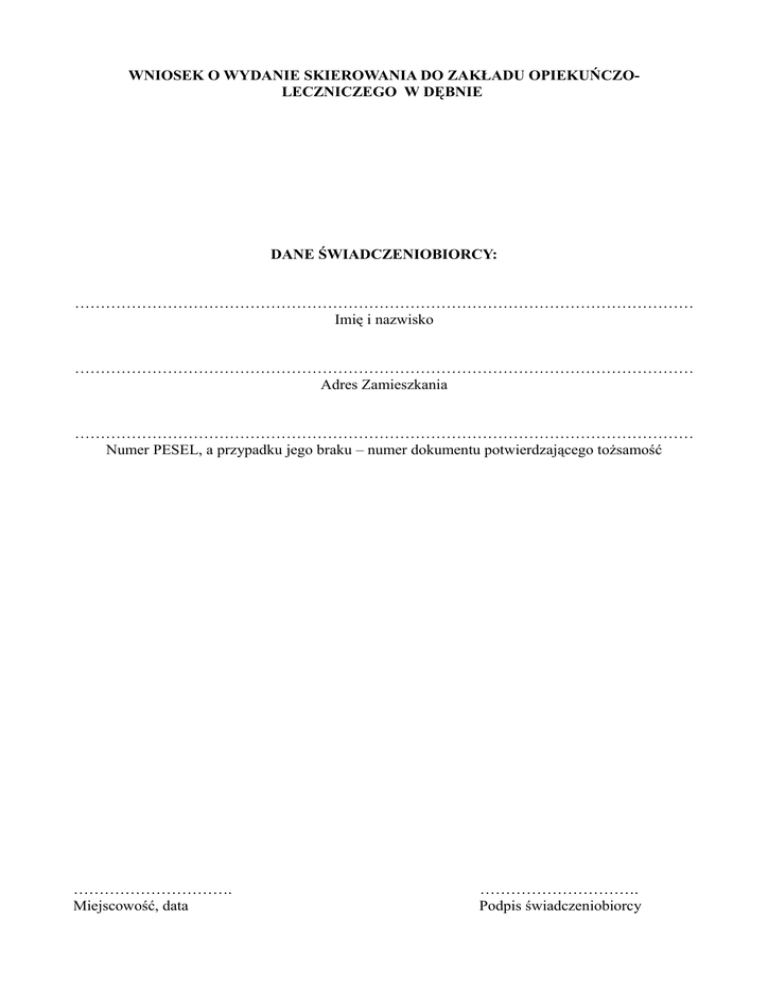 WNIOSEK O WYDANIE SKIEROWANIA DO ZAKŁADU OPIEKUŃCZOLECZNICZEGO W DĘBNIE DANE ŚWIADCZENIOBIORCY: ………………………………………………………………………………………………………… Imię i nazwisko ………………………………………………………………………………………………………… Adres Zamieszkania ………………………………………………………………………………………………………… Numer PESEL, a przypadku jego braku – numer dokumentu potwierdzającego tożsamość …………………………. Miejscowość, data …………………………. Podpis świadczeniobiorcy WYWIAD PIELĘGNIARSKI I ZAŚWIADCZENIE LEKARSKIE WYWIAD PIELĘGNIARSKI Dane świadczeniobiorcy ……………………………………………………………………………………………………………………………… Imię i nazwisko ………………………………………………………………………………………………………................................. Adres Zamieszkania ……………………………………………………………………………………………………………………………… Numer PESEL, a przypadku jego braku – numer dokumentu potwierdzającego tożsamość Rozpoznanie problemów z zakresu pielęgnacji (zaznaczyć właściwe, ewentualnie opisać): a) Odżywianie - samodzielny/przy pomocy/utrudnienia* b) W przypadku pacjenta wentylowanego mechanicznie – toaleta jamy ustnej lub toaleta drzewa oskrzelowego oraz wymiana rurki tracheotomijnej………………………………………………… Inne niewymienione…………………………………………………………………………………… Cewnik………………………………………………………………………………………………….. Inne niewymienione…………………………………………………………………………………… Pielęgnacja stomii……………………………………………………………………………………... Wykonywanie lewatyw i irygacji……………………………………………………………………… Inne niewymienione…………………………………………………………………………………… Przemieszczanie pacjenta - samodzielny/przy pomocy/utrudnienia* f) Inne niewymienione…………………………………………………………………………………… Oddawanie stolca - samodzielny/przy pomocy/utrudnienia* e) Zakładanie zgłębnika………………………………………………………………………………….. Oddawanie moczu - samodzielny/przy pomocy/utrudnienia* d) Karmienie pacjenta z zaburzonym połykaniem…………………………………………………….. Higiena ciała - samodzielny/przy pomocy/utrudnienia* c) Karmienie przez gastrostomię lub zgłębnik………………………………………………………… Z zaawansowaną osteoporozą……………………………………………………………………..... Którego stan wymaga szczególnej ostrożności……………………………………………………. Inne niewymienione…………………………………………………………………………………… Rany przewlekłe Odleżyny………………………………………………………………………………………………… Rany cukrzycowe………………………………………………………………………………………………….. Inne niewymienione……………………………………………………………………………………………… g) Oddychanie wspomagane………………………………………………………………………………………………… h) Świadomość pacjenta: tak/nie/z przerwami*………………………………………………………………………… i) Inne…………………………………………………………………………………………………………………………….. Liczba punktów uzyskanych w skali Barthel **/***…………………………………………………………………… ……………………………….. Miejscowość, data ………………………………………...................... Podpis oraz pieczęć pielęgniarki ZAŚWIADCZENIE LEKARSKIE Stwierdzam, że wyżej wymieniona osoba wymaga/nie wymaga* skierowania do zakładu opiekuńczo-leczniczego/ zakładu pielęgnacyjno-opiekuńczego* ………………………………………….. Miejscowość, data ……………………………………… Podpis oraz pieczęć lekarza *Niepotrzebne skreślić **w przypadkach określonych w art. 25 ustawy z dnia 19 sierpnia 2011 r. o weteranach działań poza granicami państwa (Dz. U. Nr 205 poz. 1203) opinia konsultanta ochrony zdrowia, o którym mowa w art. 5 ustawy z dnia 6 listopada 2008 r. o konsultantach w ochronie zdrowia (Dz. U. z Nr 52, poz. 419 z poźn. Zm.) zastępuje ocenę skalą Barthel. ***W przypadku dzieci do ukończenia 3 roku życia wpisywać „nie ma zastosowania” SKIEROWANIE DO ZAKŁADU OPIEKUŃCZO-LECZNICZEGO/ZAKŁADU PIELĘGNACYJNO-OPIEKUŃCZEGO Niniejszym kieruję: …………………………………………………………………………………………………………………………………………… Imię i nazwisko ……………………………………………………………………………………………………….................................................... Adres Zamieszkania …………………………………………………………………………………………………………………………………………… Adres do korespondencji (jeżeli jest inny niż adres zamie