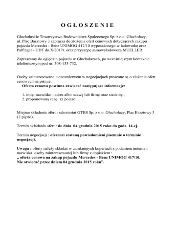 OGŁOSZENIE Głuchołaskie Towarzystwo Budownictwa Społecznego Sp. z o.o. Głuchołazy, ul. Plac Basztowy 3 zaprasza do złożenia ofert cenowych dotyczących zakupu pojazdu Mercedes - Benz UNIMOG 417/10 wyposażonego w ładowarkę oraz Palfinger - UDT do X/2017r. oraz przyczepę samowyładowczą MUELLER. Zapraszamy do oględzin pojazdu w Głuchołazach, po wcześniejszym kontakcie telefonicznym pod nr. 508-153-732. Osoby zainteresowane uczestnictwem w negocjacjach proszone są o złożenie ofert cenowych na piśmie. Oferta cenowa powinna zawierać następujące informacje: 1. imię, nazwisko i adres albo nazwę lub firmę oraz siedzibę . 2. proponowaną cenę za pojazd. Miejsce składania ofert : sekretariat GTBS Sp. z o.o. Głuchołazy, Plac Basztowy 3 ( I piętro). Termin składania ofert : do dnia 04 grudnia 2015 roku do godz. 14-ej. Termin negocjacji : oferenci zostaną powiadomieni pisemnie o terminie negocjacji. Uwaga : oferty należy składać w zamkniętych kopertach z podaniem imienia i nazwiska osoby zainteresowanej lub firmy z dopiskiem : „ oferta cenowa na zakup pojazdu Mercedes - Benz UNIMOG 417/10. Nie otwierać przez dniem 04 grudnia 2015 roku”.