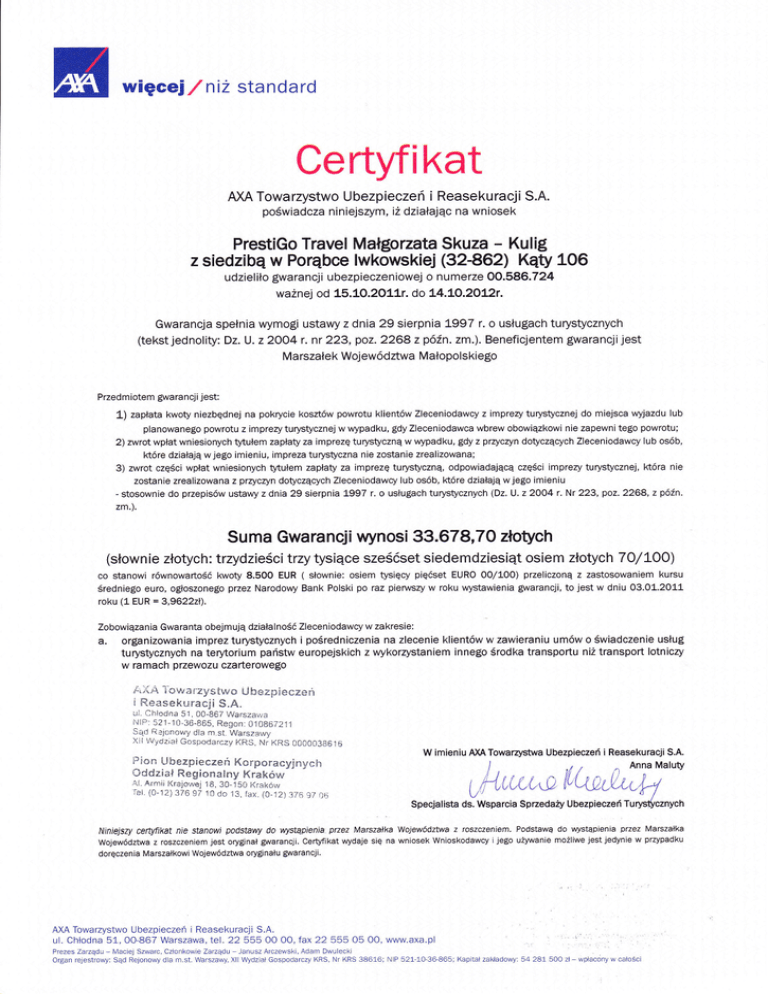 więcej / nlŻ standard Certyfi kat AXA Towarzystwo Ubezpieczeń i Reasekuracji S.A. poświ adcza n in i ejszym, iż działaJąc na wn iosek PrestiGo Trave! Małgorzata Skuza - Kulig z sledzlbą w Porąbce lwkowskiej (32-862) Kąty 106 udziel iło gwa ra ncj i u bezpieczen iowej o nu me rze 00.586.7 24 ważnej od 15.1o.2o11r. do t+.to.2ot2r. Gwarancja spełnia wymogi ustawy zdnia29 sierpnia 1997 r' o usługach turystycznych (tekst jednolity: Dz. U.z2oo4r'nr223,poz.2268zpóźn. zm.). Beneficjentem gwarancjijest Marszałek Województwa Małopolskiego Przedm iotem gwarancji jest: 1) zapłata kwoty niezbędnej na pokrycie kosłów powrotu klientóW Zleceniodawcy zimprezy turystycznej do miejsca wyjazdu lub planowanego powrotu z impreryturystycznej WWypadku, gdyZleceniodawca Wbrew obowiązkowi nie zapewni tego powrotu; 2) zwrot wpłat wniesionych q^ułem zapłaty za imprezę turystyczną w wypadku, gdy z plzyczyn dotyczących Zleceniodawcy lub osób' Kóre dziaĘą w jego imieniu, impreza turystyczna nie zostanie zrealizowana; 3) zwrot częściWpłat wniesionych Mułem zapłaty za imprezę turystyczną, odpowiadającą częściimprezy turystycznej, Kóra nie zostanie zrealizowana zprzyczyn dotyczących Zleceniodawcy lub osób, Kóre działają w jego imieniu - stosownie do przepisóW ustawy z dnia 29 sierpnia 1997 r. o usługach turystycznych (Dz' U' z 2004 r. Nr 223, poz' 2268, z późn. zm.). Suma Gwarancji wynosi 33.678'70 złotych (słownie złotych: trzydzieści trzy tysiące sześóset siedemdziesiąt osiem złotych 7o/Ioo) co stanowi równowańość kwoV 8'500 EUR ( słownie: osiem tysięcy pięćset EURo 00/100) przeliczoną z zastosowaniem kursu średniego euro, ogłoszonego pzez Narodowy Bank Polski po raz pierwszy W roku Wystawienia gwarancji, to jest W dniu 03.01'2011 roku (1 EUR = 3,9622zł)' zobowiązania GWaranta obejm ują działalnośóZleceniodawcy a' W zakresie: organizowania imprez turyStycznych i pośredniczenia na zlecenie klientów w zawieraniu umów o świadczenie usług turystycznych na terytorium państw europejskich z wykorzystaniem innego środkatransportu niż transport lotnicry w ramach przewozu czarterowego AXA l'owarzystwo Ubezpieczeń i Reasekuracji $.A. ul. Chłodna 51' 00-867 Warszawa NIP: 521-1 0-36-865, Regon: 010867211 Sąd R3jonowy dla m'st' Warszawy Xil Wydział GosPodarczy xRs' r'ti KRS 00oo038616 W imieniu $GTowar4/stwa Ubezpieczeń i Reasekuracji S.A. Pion Ubezpieczeń Korporacyjnych oddział Regionalny Kraków 4fur*oWĄp, Spzedał Ąl' Armii Krajowej 18. 30-150 Kraków -rel' (0_12) 376 97 10 do 13, fax. (o_.12) 376 97 0łi Specjalista ds. Wsparcia Ubezpieczeń Turysfcznych Niniejszy ceft/tiĘat nje stanowi podstaw do Wstąpjenia przez Marczałka wojew'dztwa z roszczenjem. Podstawą do \ł/ystapjenia przez Marszałka jest jedynie W przypadku Województwa z roszczeniem jest oryginał gwarancji. ceMkat wydaje się na Wniosek Wnioskodawcy i jego Używanie możliwe doręczenia Marszałkowi Województwa oryginału gwarancji. AXA Towarzystwo Ubezpieczeń i Reasekuracji S'A. ul. Chłodna 51, 00-867 Warszawa,Iel' 22 555 oo oo,fax22 555 05 OO, www.axa.p| . ': ' l" ' , ' Prezes Zaządu _ Maciej SzWarc, czlonk owie zarządu - JanuSZ Arczewski, Adam DWuleck] organ rejestrowy| Sąd Rejonowy dla m'st. Warszawy, Xll Wydzia] Gospodarczy KRS, Nr KRs 3a616; N P 521-10-36-865; Kapital Zakładowy; 54 2B1 5oo zl _ Wplacony W calości