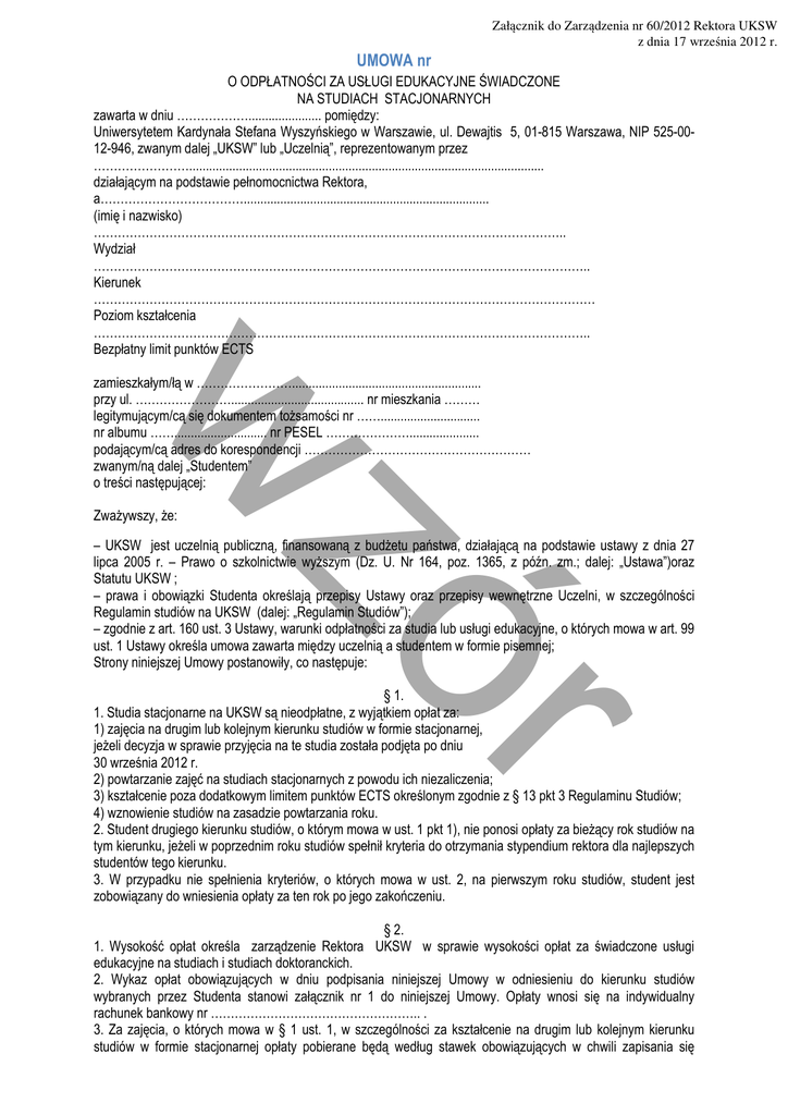 Załącznik do Zarządzenia nr 60/2012 Rektora UKSW z dnia 17 września 2012 r. UMOWA nr O ODPŁATNOŚCI ZA USŁUGI EDUKACYJNE ŚWIADCZONE NA STUDIACH STACJONARNYCH zawarta w dniu ………………...................... pomiędzy: Uniwersytetem Kardynała Stefana Wyszyńskiego w Warszawie, ul. Dewajtis 5, 01-815 Warszawa, NIP 525-0012-946, zwanym dalej „UKSW” lub „Uczelnią”, reprezentowanym przez ……………………........................................................................................................... działającym na podstawie pełnomocnictwa Rektora, a……………………………….......................................................................... (imię i nazwisko) ……………………………………………………………………………………………………….. Wydział …………………………………………………………………………………………………………….. Kierunek ……………………………………………………………………………………………………………… Poziom kształcenia …………………………………………………………………………………………………………….. Bezpłatny limit punktów ECTS w zamieszkałym/łą w ……………………......................................................... przy ul. ……………………........................................ nr mieszkania ……… legitymującym/cą się dokumentem tożsamości nr …….............................. nr albumu ……............................ nr PESEL …………………..................... podającym/cą adres do korespondencji ………………………………………………… zwanym/ną dalej „Studentem” o treści następującej: Zważywszy, że: zó – UKSW jest uczelnią publiczną, finansowaną z budżetu państwa, działającą na podstawie ustawy z dnia 27 lipca 2005 r. – Prawo o szkolnictwie wyższym (Dz. U. Nr 164, poz. 1365, z późn. zm.; dalej: „Ustawa”)oraz Statutu UKSW ; – prawa i obowiązki Studenta określają przepisy Ustawy oraz przepisy wewnętrzne Uczelni, w szczególności Regulamin studiów na UKSW (dalej: „Regulamin Studiów”); – zgodnie z art. 160 ust. 3 Ustawy, warunki odpłatności za studia lub usługi edukacyjne, o których mowa w art. 99 ust. 1 Ustawy określa umowa zawarta między uczelnią a studentem w formie pisemnej; Strony niniejszej Umowy postanowiły, co następuje: r § 1. 1. Studia stacjonarne na UKSW są nieodpłatne, z wyjątkiem opłat za: 1) zajęcia na drugim lub kolejnym kierunku studiów w formie stacjonarnej, jeżeli decyzja w sprawie przyjęcia na te studia została podjęta po dniu 30 września 2012 r. 2) powtarzanie zajęć na studiach stacjonarnych z powodu ich niezaliczenia; 3) kształcenie poza dodatkowym limitem punktów ECTS określonym zgodnie z § 13 pkt 3 Regulaminu Studiów; 4) wznowienie studiów na zasadzie powtarzania roku. 2. Student drugiego kierunku studiów, o którym mowa w ust. 1 pkt 1), nie ponosi opłaty za bieżący rok studiów na tym kierunku, jeżeli w poprzednim roku studiów spełnił kryteria do otrzymania stypendium rektora dla najlepszych studentów tego kierunku. 3. W przypadku nie spełnienia kryteriów, o których mowa w ust. 2, na pierwszym roku studiów, student jest zobowiązany do wniesienia opłaty za ten rok po jego zakończeniu. § 2. 1. Wysokość opłat określa zarządzenie Rektora UKSW w sprawie wysokości opłat za świadczone usługi edukacyjne na studiach i studiach doktoranckich. 2. Wykaz opłat obowiązujących w dniu podpisania niniejszej Umowy w odniesieniu do kierunku studiów wybranych przez Studenta stanowi załącznik nr 1 do niniejszej Umowy. Opłaty wnosi się na indywidualny rachunek bankowy nr …………………………………………….. . 3. Za zajęcia, o których mowa w § 1 ust. 1, w szczególności za kształcenie na drugim lub kolejnym kierunku studiów w formie stacjonarnej opłaty pobierane będą według stawek obowiązujących w chwili zapisania się Studenta na te zajęcia. Wysokość opłat z tytułu powtarzania zajęć z powodu ich niezaliczenia jest zależna od liczby punktów ECTS przypisanych powtarzanym zajęciom. 4. Podwyższenie opłat, bądź wprowadzenie dodatkowych opłat w kolejnym roku akademickim może nastąpić w przypadku zmian w programie studiów, powodujących wzrost kosztów prowadzonych zajęć albo w przypadku zmian kosztów ponoszonych w zakresie niezbędnym do uruchomienia i prowadzenia studiów lub zajęć na studiach, z uwzględnieniem kosztów amortyzacji i remontów lub zmiany przepisów prawnych rzutujących na wysokość opłat. 5. O zmianie wysokości opłaty uczelnia zobowiązuje się powiadomić Studenta pisemnie przed rozpoczęciem roku akademickiego wraz z propozycją w tym zakresie treści aneksu do niniejszej umowy, a także informacją o przysługującym mu prawie odstąpienia od umowy. Zawiadomienie będzie przekazane listem poleconym na adres studenta wskazany w niniejszej umowie lub przekazany w stosownym dziekanacie za pisemnym potwierdzeniem odbioru. §3 Student zobowiązuje się również wnosić w terminach ustalonych przez kierownika właściwej jednostki organizacyjnej prowadzącej studia (dziekana)dotyczące go opłaty, przewidziane przepisami prawa powszechnie obowiązującego, w szczególności za: wydanie legitymacji studenckiej, indeksu, dyplomu, oraz ich duplikatów określonych w Zarządzeniu Rektora UKSW w sprawie pobierania opłat za wydanie dokumentów związanych z tokiem studiów lub uzyskaniem stopnia naukowego . w § 4. 1. Student może ubiegać się o zwolnienie z opłat na zasadach określonych w uchwale Senatu Uniwersytetu Kardynała Stefana Wyszyńskiego w Warszawie w sprawie szczegółowych zasad pobierania opłat za świadczone usługi edukacyjne. 2. W przypadku gdy Student opóźni się z wniesieniem opła