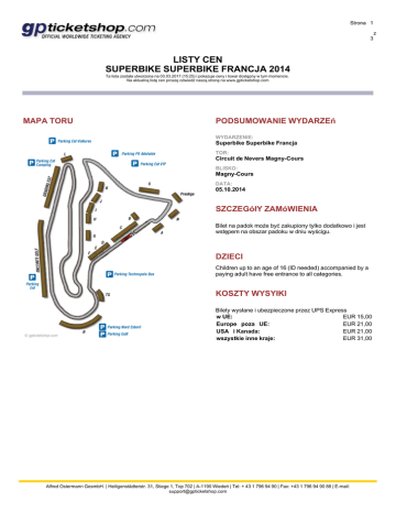 Strona 1 3 LISTY CEN SUPERBIKE SUPERBIKE FRANCJA 2014 Ta lista została utworzona na 03.03.2017 (15:25) i pokazuje ceny i towar dostępny w tym momencie. Na aktualną listę cen proszę odwiedź naszą stronę na www.gpticketshop.com MAPA TORU PODSUMOWANIE WYDARZEń WYDARZENIE: Superbike Superbike Francja TOR: Circuit de Nevers Magny-Cours BLISKO: Magny-Cours DATA: 05.10.2014 SZCZEGółY ZAMóWIENIA Bilet na padok może być zakupiony tylko dodatkowo i jest wstępem na obszar padoku w dniu wyścigu. DZIECI Children up to an age of 16 (ID needed) accompanied by a paying adult have free entrance to all categories. KOSZTY WYSYłKI Bilety wysłane i ubezpieczone przez UPS Express w UE: EUR 15,00 Europe poza UE: EUR 21,00 USA i Kanada: EUR 21,00 wszystkie inne kraje: EUR 31,00 Alfred Ostermann GesmbH. | Heiligenstädterstr. 31, Stiege 1, Top 702 | A-1190 Wiedeń | Tel: + 43 1 796 94 90 | Fax: +43 1 796 94 90 88 | E-mail: [email protected] z Strona 2 3 FORMULARZ ZAMóWIENIA FAX FAX NR: +43 1 7969490-88 Proszę wypełnij ten formularz w całości i DRUKOWANYMI LITERAMI. Imię i nazwisko: firma: adres: Kraj / Kod pocztowy / Miasto: E-Mail: Tel: Zamawiam bilety na Superbike Superbike Francja (2014-10-05) Przeczytałem i zaakceptowałem ogólne warunki firmy Ilość Cena za sztukę EUR Total EUR plus 5% opłaty manipulacyjne z kosztami wysyłki Suma Metoda płatności Przelew bankowy Karta kredytowa: VISA | Mastercard | Diners Club Posiadacz karty: Numer karty: Ważna do: Kod CVV: OGóLNE WARUNKI FIRMY Ważne od: 01. 01. 2010 1.Ogólne Warunki Sprzedaży Ogólne warunki firmy są ważne na sprzedaż przez przedsiębiorstwo A. Ostermann Gmbh (dalej określone jako gpticketshop.com). Wszelkie różniące się warunki klientów mogą być tylko ustalone na piśmie. Zaznaczając pole przy końcu zamówienia “Z moim zamówieniem akceptuję warunki sprzedaży firmy gpticketshop.com”, kupujący akceptuje nasze warunki sprzedaży i jest do nich zobowiązany. Kupując bilet, klient akceptuje warunki organizatora. Nasz wybór artykułów w sprzedaży nie jest zobowiązujący i może ulec zmianom bez uprzedniego powiadomienia. Zamówenie dokonane przez kogokolwiek w wieku od 18 lat tworzy umowę sprzedaży na ogólnych warunkach sprzedaży naszej firmy. Automatyczne potwierdzenie przyjęcia twojego zamówienia, wysłane przez pocztę elektroniczną nie oznacza zawarcia kontraktu między sprzedającym i kupującym. Umowa sprzedaży staje się ważna po wysłaniu rachunku do klienta. Klient musi w pełni i poprawnie wypełnić formularz. Jakakolwiek szkowa wynikająca z błędnego lub niekompletnego wypełnienia formularza nie zostanie pokryta przez gpticketshop.com. Jako, że od naszej firmy nie zależą wszystkie elementy usługi, którą osobiście dostrczamy do klienta, jesteśmy zmuszeni współpracować z innymi kompetentnymi trzecimi firmami. 2. Zamówienie Umowa sprzedaży upoważnia się w następujący sposób: 1)Na stronie proszę wybierz bilety i ich ilość (+/-), którą życzysz sobie kupić i kliknij na przycisk obok “Zamów” . 2) Następnie wybierz swój region i określ metodę płatniczą i kliknij na przycisk “Kontynuuj zamówienie” . 3)Proszę sprawdź zawartość swojej karty zakupowej. 4)Następnie wprowadź wymagane dane w polu “Szczegóły zamówienia”. Proszę pamiętaj, że wyślemy zamówione i opłacone bilety na adres wskazany tutaj. 5)Kiedy przeczytasz i zaakceptujesz Ogólne Warunki Sprzedaży Firmy i zgodę na przetwarzanie danych osobowych, zaznacz odpowiednie pole i wyślij zamówienie, będące dla nas ofertą kontraktu. 6)Następnie kontrakt zostanie ostatecznie zawarty przez nasze potwierdzenie emailem. W pełni opłacone bilety zostaną wysłane przez UPS, na około 2 tygodnie przed wydażeniem. Alfred Ostermann GesmbH. | Heiligenstädterstr. 31, Stiege 1, Top 702 | A-1190 Wiedeń | Tel: + 43 1 796 94 90 | Fax: +43 1 796 94 90 88 | E-mail: [email protected] z Strona 3 3 6)Następnie kontrakt zostanie ostatecznie zawarty przez nasze potwierdzenie emailem. W pełni opłacone bilety zostaną wysłane przez UPS, na około 2 tygodnie przed wydażeniem. Czasami z powodów nieprzewidzianych wypadków będziesz musiał odebrać bilety na torze. Oczywiście opłata za przesyłkę zostanie zwrócona. 3. Język kontraktu Językami kontraktu są niemiecki i angielski. Informacja, serwis obsługi i skargi będą także załatwiane po angielsku i po niemiecku. 4. Ceny Nasza usługa rozpocznie się kiedy otrzymamy pełną płatność za usługi opisane w umowie. Faktury muszą być regulowane w Euro lub Dolarach Amerykańskich, USD, jak wskazane na fakturze. Wszystkie ceny zawierają VAT. Wszystkie ceny są ważne tylko w momencie składania zamówienia. W dodatku do wskazanej ceny biletów, zostaniesz obciążony opłatą manipulacyjną i kosztami wysyłki. Opłata manipulacyjna i koszty wysyłki będą dokładnie pokazane w koszyku i w potwierdzeniu zamówienia przez email. Jeżeli pojawią się jakiekolwiek opłaty w związku z eksportem lub importem towaru z powodu przesyłki, spadają one na klienta (możesz znaleść więcej informacji w biurze podatkowym). Jako, że być może będziemy musieli kupić wiele biletów od pośrednika, mogą być różnice na cenie na fakturze i tej wydrukowanej na biletach. W przypadku anulowania wydarzenia, bilety są refundowane, ale bez opłaty manipulacyjnej. 5. Prawo do wystąpienia z umowy As Jako że zakupione dobra są związanie z nieodnawialną usługą w ustalonym czasie, klient nie ma prawa do odstąpienia z umowy jak wskazuje § 18 Abs. 1 Z 10 FAGG prawa Austrii. Nieodnawialne usługi są zdefiniowane jako przedsięwzęcia w konkretnym zdefiniowanym czasie i/lub dacie i kontraktor musi dostarczyć zgodne usługi. Jeżeli klient to kontraktor według przepisu §1 KSCHG (lub § 14 BGB) prawa Austrii, on/ona nie mają prawa odstąpienia od umowy. Jeżeli konkretna kategoria biletów jest wyprzedana, gpticketshop.com has ma 