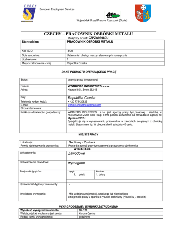 European Employment Services Wojewódzki Urząd Pracy w Rzeszowie (Opole) CZECHY – PRACOWNIK OBRÓBKI METALU Krajowy nr ref: CZPZA93980U Stanowisko: PRACOWNIK OBRÓBKI METALU Kod ISCO: 3123 Opis stanowiska: Ustawianie i obsługa maszyn sterowanych numerycznie Liczba etatów: Miejsce zatrudnienia – kraj: 1 Republika Czeska DANE PODMIOTU OFERUJĄCEGO PRACĘ Status: agencja pracy tymczasowej Nazwa: Adres: WORKERS INDUSTRIES s.r.o. Kraj: Republika Czeska Telefon (z kodem kraju): E-mail: Strona internetowa: Krótki opis działalności gospodarczej: + 420 775420825 [email protected] Havraní 801, Zvole, 252 45 WORKERS INDUSTRIES s.r.o. jest agencją pracy tym,czasowej z siedzibą w miejscowości Zvole koło Pragi. Firma posiada zezwolenie na prowadzenie agencji od stycznia 2012 r. Specjalizuje się w wynajmowaniu pracowników w zawodach związanych z obróbką metali, ślusarstwem itp. W obecnej chwili zatrudnia 40 osób. MIEJSCE PRACY Lokalizacja: Powód oddelegowania pracownika: Sedlčany - Žamberk Praca dla agencji pracy tymczasowej u pracodawcy użytkownika WYMAGANIA Wykształcenie: Zawodowe Doświadczenie zawodowe: wymagane Znajomość języków: Język 1. polski Poziom 1. dobry Uprawnienia/ dyplomy/ dokumenty: - Inne istotne wymagania: Mile widziana znajomość j. czeskiego lub niemieckiego umiejętność pracy w oparciu o rysunek techniczny (rysunki w j. czeskim) WYNAGRODZENIE I WARUNKI ZATRUDNIENIA Wysokość wynagrodzenia brutto: Waluta, w jakiej wypłacana jest pensja: Rodzaj stawki wynagrodzenia: 80- 120 Korona Czeska godzinowa Dodatkowe świadczenia: zakwaterowanie podróż wyżywienie Nazwa firmy, z którą zostanie podpisana umowa: Rodzaj umowy: Wymiar czasu pracy Tak – płacone przez pracodawcę (koszt ok 2000-3000 Kc miesięcznie) Tak – 1 w miesiącu podróż do Polski i z powrotem Tak – dodatek do wyżywienia – 165 KC dziennie wyżywienie w kantynie WORKERS INDUSTRIES s.r.o. Umowa z agencją pracy tymczasowej Pełen etat Czas trwania umowy: 3 miesiące – okres próbny Liczba godzin tygodniowo: codziennie 12 godz. od 6-18 przez 10 dni, możliwe nadgodziny, następnie 10 dni - wolne Praca zmianowa – 3 zmiany Zmiany i praca w dni wolne: Data rozpoczęcia: Od zaraz SPOSÓB SKŁADANIA DOKUMENTÓW APLIKACYJNYCH Wymagane dokumenty CV Język, w którym muszą być sporządzone przedkładane dokumenty: Do kogo należy wysłać dokumenty: polski Gdzie należy wysłać dokumenty: [email protected] Dane teleadresowe doradcy EURES lub przedstawiciela pracodawcy: Waniek Dariusz Krzysztof + 420 775420825 – j. polski Dmitrij Kuzičkin +420 602293532 – j. czeski do pracodawcy KOORDYNATOR Wojewódzki Urząd Pracy w Opolu WAŻNOŚĆ Data publikacji: 30.04.2012 Termin przedkładania podań o pracę / zakończenia ważności oferty: Do odwołania Agencja pracy tymczasowej WORKERS INDUSTRIES s.r.o. świadczyła, że prowadzi działalność zgodnie z przepisami obowiązującymi w Republice Czeskiej. Uprzejmie informujemy, że skontaktujemy się wyłącznie z wybranymi kandydatami. UWAGA: 1. Umowa z zagranicznym pracodawcą zostanie zawarta zgodnie z prawem kraju zatrudnienia. Oznacza to, że wszystkie roszczenia odnośnie do warunków, które obejmuje umowa, można kierować wyłącznie do odpowiedniego sądu w kraju zatrudnienia. Publiczne służby zatrudnienia (EURES) nie mogą pośredniczyć ani reprezentować pracownika w sądzie kraju zatrudnienia w przypadku sporu z pracodawcą. 2. Publiczne służby zatrudnienia (EURES) dokładają wszelkich starań, aby zapewnić rzetelność i wiarygodność ofert pracy zgłoszonych w lokalnym urzędzie pracy. Należy wyjaśnić, że oferta pracy została zgłoszona przez stronę trzecią i EURES nie odpowiada za ewentualne rozbieżności między warunkami pracy określonymi w ofercie pracy i warunkami oferowanymi przez potencjalnego pracodawcę. 3. Publiczne służby zatrudnienia (EURES) informują, że będą zbierać, przetwarzać i przekazywać potencjalnym pracodawcom zgodnie z przepisami dotyczącymi ochrony danych osobowych wszystkie dane osobowe dostarczone przez osoby poszukujące pracy.