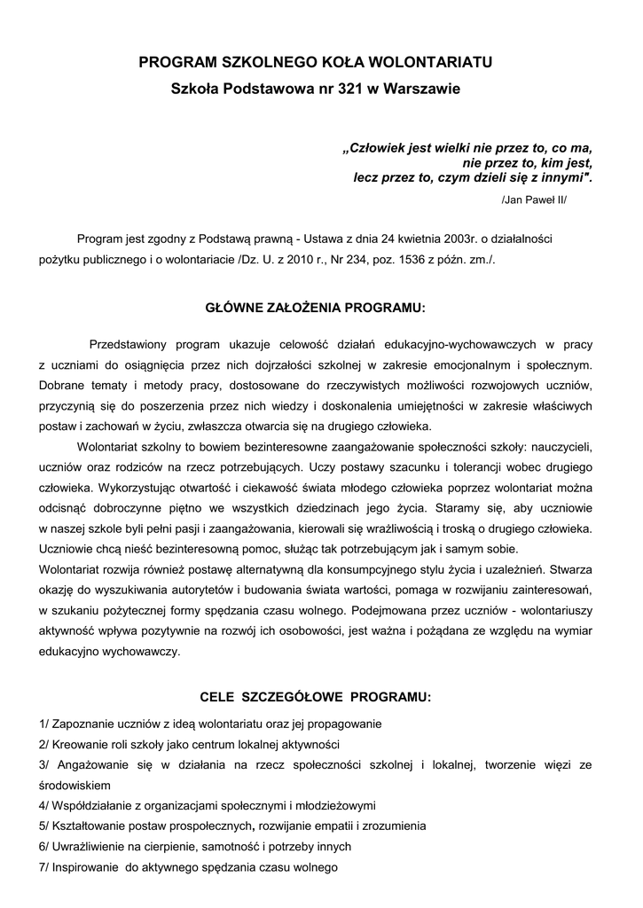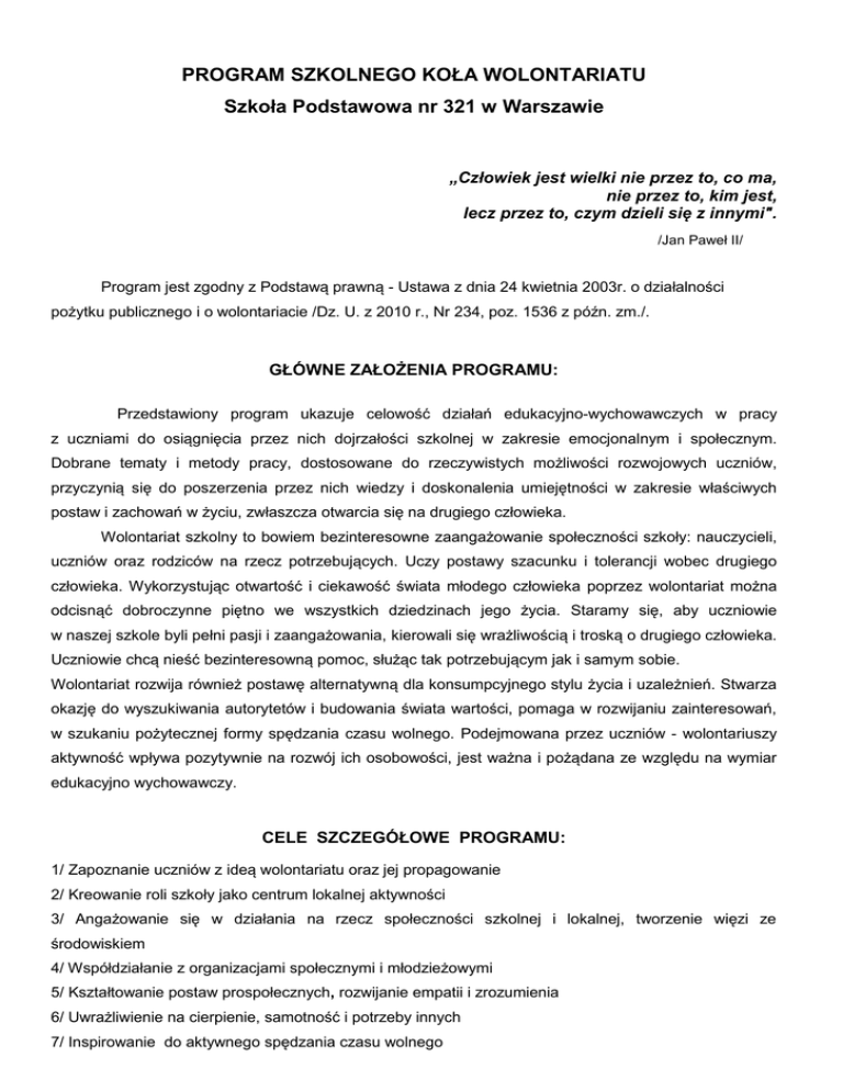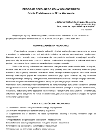 PROGRAM SZKOLNEGO KOŁA WOLONTARIATU Szkoła Podstawowa nr 321 w Warszawie „Człowiek jest wielki nie przez to, co ma, nie przez to, kim jest, lecz przez to, czym dzieli się z innymi". /Jan Paweł II/ Program jest zgodny z Podstawą prawną - Ustawa z dnia 24 kwietnia 2003r. o działalności pożytku publicznego i o wolontariacie /Dz. U. z 2010 r., Nr 234, poz. 1536 z późn. zm./. GŁÓWNE ZAŁOŻENIA PROGRAMU: Przedstawiony program ukazuje celowość działań edukacyjno-wychowawczych w pracy z uczniami do osiągnięcia przez nich dojrzałości szkolnej w zakresie emocjonalnym i społecznym. Dobrane tematy i metody pracy, dostosowane do rzeczywistych możliwości rozwojowych uczniów, przyczynią się do poszerzenia przez nich wiedzy i doskonalenia umiejętności w zakresie właściwych postaw i zachowań w życiu, zwłaszcza otwarcia się na drugiego człowieka. Wolontariat szkolny to bowiem bezinteresowne zaangażowanie społeczności szkoły: nauczycieli, uczniów oraz rodziców na rzecz potrzebujących. Uczy postawy szacunku i tolerancji wobec drugiego człowieka. Wykorzystując otwartość i ciekawość świata młodego człowieka poprzez wolontariat można odcisnąć dobroczynne piętno we wszystkich dziedzinach jego życia. Staramy się, aby uczniowie w naszej szkole byli pełni pasji i zaangażowania, kierowali się wrażliwością i troską o drugiego człowieka. Uczniowie chcą nieść bezinteresowną pomoc, służąc tak potrzebującym jak i samym sobie. Wolontariat rozwija również postawę alternatywną dla konsumpcyjnego stylu życia i uzależnień. Stwarza okazję do wyszukiwania autorytetów i budowania świata wartości, pomaga w rozwijaniu zainteresowań, w szukaniu pożytecznej formy spędzania czasu wolnego. Podejmowana przez uczniów - wolontariuszy aktywność wpływa pozytywnie na rozwój ich osobowości, jest ważna i pożądana ze względu na wymiar edukacyjno wychowawczy. CELE SZCZEGÓŁOWE PROGRAMU: 1/ Zapoznanie uczniów z ideą wolontariatu oraz jej propagowanie 2/ Kreowanie roli szkoły jako centrum lokalnej aktywności 3/ Angażowanie się w działania na rzecz społeczności szkolnej i lokalnej, tworzenie więzi ze środowiskiem 4/ Współdziałanie z organizacjami społecznymi i młodzieżowymi 5/ Kształtowanie postaw prospołecznych, rozwijanie empatii i zrozumienia 6/ Uwrażliwienie na cierpienie, samotność i potrzeby innych 7/ Inspirowanie do aktywnego spędzania czasu wolnego 8/ Stwarzanie możliwości wykorzystania własnych umiejętności i doświadczeń oraz zdobywanie nowych 9/ Rozwijanie zainteresowań 10/ Kształtowanie umiejętności działania zespołowego 11/ Uczenie młodego człowieka podejmowania decyzji oraz realizacji zamierzeń 12/ Wyzwalanie dążenia do samorozwoju, poszukiwanie własnego miejsca w życiu 13/ Opowiadanie się za określonymi wartościami 14/ Wspieranie ciekawych inicjatyw młodzieży szkolnej. OBSZARY DZIAŁANIA: Aktywność wolontariuszy ukierunkowana jest na dwa zasadnicze obszary: środowisko szkolne oraz środowisko pozaszkolne. ŚRODOWISKO SZKOLNE 1/ Udział w akcji „Czytanie dzieciom - przedszkolakom oraz pierwszoklasistom”. 2/ Zorganizowanie dla przedszkolaków zabaw konkursowych z okazji Światowego Dnia Pluszowego Misia. 3/ Organizowanie pomocy uczniom osiągającym słabsze wyniki w nauce w ramach koleżeńskich korepetycji. 3/ Zaangażowanie we współorganizowanie imprez szkolnych, m. in. z okazji Dnia Światowego Jedzenia oraz Międzynarodowego Dnia Tolerancji. ŚRODOWISKO POZASZKOLNE 1/ Akcje charytatywne wspierające: a/ instytucje, tj.: *Dom Dziecka - wizyta w Domu Dziecka z upominkami, zebranymi wcześniej przez wolontariuszy na terenie szkoły, w ramach akcji świątecznej „I Ty możesz zostać Świętym Mikołajem”; *Schronisko dla Zwierząt w Józefowie - współpraca ze schroniskiem polegająca na opiece nad zwierzętami, w ramach akcji „Wpieranie zwierząt w schroniskach” poprzez zorganizowanie zbiórki żywności na terenie szkoły; *Dom Seniora - wizyta w okresie Świąt Bożego Narodzenia z przedstawieniem „Jasełka” celem utrzymania przyjaznych kontaktów z podopiecznymi placówki b/ fundacje i stowarzyszenia, tj.: *zorganizowanie na terenie szkoły zbiórki pieniędzy w ramach ogólnopolskiej akcji „Góra Grosza”; *zaangażowanie w ogólnopolską akcję Wieka Orkiestra Świątecznej Pomocy poprzez zbiórkę pieniędzy przez wolontariuszy naszej szkoły dla najmłodszych, chorych dzieci; Inne działania wolontariuszy: *nawiązanie współpracy z Klubem Ośmiu Wspaniałych; *zaangażowanie w ogólnopolski projekt „Europejska wymiana ozdób choinkowych”; *opieka nad opuszczonymi pomnikami i grobami na pobliskim cmentarzu w ramach akcji „Znicz”; *przeprowadzenie zbiórki makulatury przez wolontariuszy na terenie naszej szkoły; *nawiązanie współpracy z PCK; *wspomaganie programu społecznego „Bezpieczna i przyjazna szkoła”; Inne realizowane przez wolontariuszy działania będą dopisywane w ciągu roku szkolnego. REALIZOWANE ZADANIA: 1/ Przybliżenie młodzieży idei wolontariatu podczas spotkań i godzin wychowawczych. 2/ Umożliwianie rozpoznania własnych motywacji do pracy. 3/ Poznanie obszarów pomocy. 4/ Poznanie zasad pracy i etyki działalności woluntarystycznej. 5/ Zapoznanie z prawami i obowiązkami wolontariuszy. 6/ Wywieszanie plakatów zachęcających młodzież do włączenia się w pracę wolontariatu. 7/ Zamieszczanie informacji o działalności Szkolnego Koła Wolontariatu na stronie internetowej szkoły. 8/ Zachęcanie uczniów do działań w szkolnym wolontariacie podczas rozmów prowadzonych przez nauczycieli i doświadczonych wolontariuszy. 9/ Udział w Finale WOŚP. 10/ Spotkanie z przedstawicielem PCK. 11/ Szkolenia członków wolontariatu w zakresie udzielania pierwszej pomocy przedmedycznej 12/ Systematyczne zebrania członków wolontariatu. 13/ Pomoc najuboższym rodzinom, samotnym, chorym i osobom starszym przy współpracy