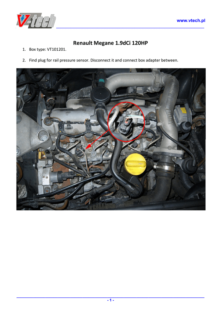 www.vtech.pl ____________________________________________________________________________ Renault Megane 1.9dCi 120HP 1. Box type: VT101201. 2. Find plug for rail pressure sensor. Disconnect it and connect box adapter between. ___________________________________________________________________________________________ -1-