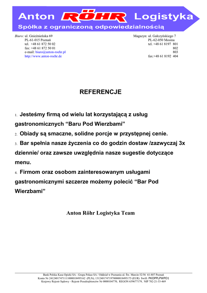 Anton Logistyka Spółka z ograniczoną odpowiedzialnością Biuro: ul. Gnieźnieńska 69 PL-61-015 Poznań tel. +48 61 872 50 02 fax: +48 61 872 50 01 e-mail: [email protected] http://www.anton-roehr.de Magazyn: ul. Gałczyńskiego 7 PL-62-050 Mosina tel. +48 61 8197 801 802 803 fax:+48 61 8192 404 REFERENCJE 1. Jesteśmy firmą od wielu lat korzystającą z usług gastronomicznych “Baru Pod Wierzbami” 2. Obiady są smaczne, solidne porcje w przystępnej cenie. 3. Bar spełnia nasze życzenia co do godzin dostaw /zazwyczaj 3x dziennie/ oraz zawsze uwzględnia nasze sugestie dotyczące menu. 4. Firmom oraz osobom zainteresowanym usługami gastronomicznymi szczerze możemy polecić “Bar Pod Wierzbami” Anton Röhr Logistyka Team Bank Polska Kasa Opieki SA - Grupa Pekao SA / Oddział w Poznaniu ul. Św. Marcin 52/56 61-807 Poznań Konto Nr 24124017471111000018495162 (PLN); 13124017471978000018495175 (EUR) Swift: PKOPPLPWPO1 Krajowy Rejestr Sądowy - Rejestr Przedsiębiorców Nr 0000104770, REGON 639677179, NIP 782-21-33-469