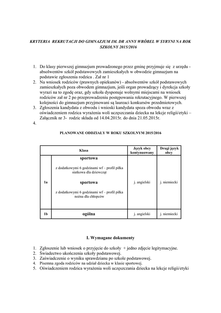 KRYTERIA REKRUTACJI DO GIMNAZJUM IM. DR ANNY WRÓBEL W SYRYNI NA ROK SZKOLNY 2015/2016 1. Do klasy pierwszej gimnazjum prowadzonego przez gminę przyjmuje się z urzędu absolwentów szkół podstawowych zamieszkałych w obwodzie gimnazjum na podstawie zgłoszenia rodzica . Zał nr 1 2. Na wniosek rodziców (prawnych opiekunów) - absolwentów szkół podstawowych zamieszkałych poza obwodem gimnazjum, jeśli organ prowadzący i dyrekcja szkoły wyrazi na to zgodę oraz, gdy szkoła dysponuje wolnymi miejscami na wniosek rodziców zał nr 2 po przeprowadzeniu postępowania rekrutacyjnego. W pierwszej kolejności do gimnazjum przyjmowani są laureaci konkursów przedmiotowych. 3. Zgłoszenia kandydata z obwodu i wnioski kandydata spoza obwodu wraz z oświadczeniem rodzica wyrażenia woli uczęszczania dziecka na lekcje religii/etyki – Załącznik nr 3- rodzic składa od 14.04.2015r. do dnia 21.05.2015r. 4. PLANOWANE ODDZIAŁY W ROKU SZKOLNYM 2015/2016 Klasa Język obcy kontynuowany Drugi język obcy j. angielski j. niemiecki j. angielski j. niemiecki sportowa z dodatkowymi 6 godzinami wf – profil piłka siatkowa dla dziewcząt 1a sportowa z dodatkowymi 6 godzinami wf – profil piłka nożna dla chłopców 1b ogólna I. Wymagane dokumenty 1. Zgłoszenie lub wniosek o przyjęcie do szkoły + jedno zdjęcie legitymacyjne. 2. Świadectwo ukończenia szkoły podstawowej. 3. Zaświadczenie o wyniku sprawdzianu po szkole podstawowej. 4. Pisemna zgoda rodziców na udział dziecka w klasie sportowej. 5. Oświadczeniem rodzica wyrażenia woli uczęszczania dziecka na lekcje religii/etyki II Terminarz rekrutacji Ustala się następujący terminarz rekrutacji: Terminy składania dokumentów przez kandydatów: od 14 kwietnia do 21 maja 2015 r. II. Terminy rekrutacji: 1. do klas pierwszych gimnazjów (w tym dwujęzycznych, z oddziałami dwujęzycznymi, sportowymi, sportowych oraz mistrzostwa sportowego): 03 marca 2015 r. – Zebranie informacyjne dla rodziców i uczniów kandydatów do klas pierwszych – lekcja otwarta uczniów klasy sportowej. 14 – 30 kwietnia 2015 Składanie podań (wraz ze zgodą rodziców) chętnych do klasy sportowej 14 kwietnia do 21 maja 2015 r. Składania dokumentów przez kandydatów do klasy pierwszej gimnazjum. 27 maja 2015 r. godz. 15. 30 Sprawdzian predyspozycji sportowych kandydatów do klasy sportowej. 29 maja 2015 r. Ogłoszenie listy uczniów zakwalifikowanych do klasy sportowej. Do 30 czerwca 2015 r. do godz. 15.00 dostarczenie kopii świadectwa szkoły podstawowej oraz zaświadczenia o przystąpieniu do sprawdzianu zewnętrznego; 2 lipca 2015 r. godz.15.00 podanie do publicznej wiadomości listy kandydatów zakwalifikowanych i niezakwalifikowanych 6 lipca 2014 r. do godz. 15.00 – potwierdzenie przez kandydata woli przyjęcia poprzez dostarczenie oryginału świadectwa i zaświadczenia 7 lipca 2014 r. godz. 15 podanie do publicznej wiadomości listy kandydatów przyjętych i nieprzyjętych do gimnazjum REGULAMIN NABORU DO KLASY SPORTOWEJ ORAZ KLASY OGÓLNEJ W GIMNAZJUM IM. DR ANNY WRÓBEL W SYRYNI NA ROK SZKOLNY 2015/2016 Do klasy pierwszej sportowej gimnazjum o specjalności piłki siatkowej dla dziewcząt oraz piłki nożnej dla chłopców przyjmuje się absolwentów szkół podstawowych. O przyjęciu decydują: 1. Wynik sprawdzianu predyspozycji sportowych, 2. Złożenie w terminie zgłoszenia lub wniosku rodziców. Wstępne kryteria doboru kandydatów : O zakwalifikowaniu ucznia do klasy sportowej w Gimnazjum im. dr Anny Wróbel w Syryni decyduje powołana przez Dyrektora Komisja Rekrutacyjna. Warunki przyjęcia ucznia do klasy sportowej są następujące: 1. Do klasy pierwszej oddziału sportowego Gimnazjum im. dr Anny Wróbel w Syryni przyjmuje się kandydatów, którzy: 1) posiadają bardzo dobry stan zdrowia, potwierdzony orzeczeniem lekarskim o zdolności do uprawiania danego sportu wydanym przez lekarza specjalistę w dziedzinie medycyny sportowej lub innego uprawnionego lekarza. 2) posiadają pisemną zgodę rodziców na uczęszczanie kandydata do oddziału sportowego; 3) uzyskali pozytywne wyniki prób sprawności fizycznej, na warunkach ustalonych przez polski związek sportowy właściwy dla danego sportu, w którym jest prowadzone szkolenie sportowe w sportowym oddziale. 2. W przypadku większej liczby kandydatów spełniających warunki, o których mowa w ust. 1, niż liczba wolnych miejsc w oddziale, na pierwszym etapie postępowania rekrutacyjnego są brane pod uwagę wyniki prób sprawności fizycznej, o których mowa w ust. 1 pkt 3. 3. W przypadku równorzędnych wyników uzyskanych na pierwszym etapie postępowania rekrutacyjnego, na drugim etapie postępowania rekrutacyjnego są brane pod uwagę łącznie odpowiednio następujące kryteria: 1) wyniki sprawdzianu po szkole podstawowej; 2)świadectwo ukończenia szkoły podstawowej z wyróżnieniem; 3)szczególne osiągnięcia wymienione na świadectwie ukończenia szkoły podstawowej: a) uzyskanie wysokiego miejsca nagrodzonego lub uhonorowanego zwycięskim tytułem w zawodach sportowych, organizowanych co najmniej na szczeblu powiatowym przez inne podmioty działające na terenie szkoły; b) osiągnięcia w zakresie aktywności społecznej, w tym na rzecz środowiska szkolnego, w szczególności w formie wolontariatu. 4.Zasady przyznawania punktów za oceny uzyskane w szkole podstawowej i szczególne osiągnięcia ucznia: Zagadnienie Punktacja maksymalna Świadectwo ukończenia szkoły podstawowej z 5 punktów wyróżnieniem Uzyskanie tytułu finalisty w wojewódzkim konkursie przedmiotowym organizowanym przez kuratora oświaty: - za jeden tytuł - 10 punktów 12 punktów - za dwa i więcej tytułów – dodatkowo 2 punkty Inne szczególne osiągnięcia - w zawodach wiedzy, artystycznych i sportowych (indywidualne lub zespołowe, co najmniej na szczeblu powiatowym wymienione na świadectwie ukończenia szkoły podstawowej, zgodnie z wykazem Śląskiego Kuratora Oświaty. Kandydat może 