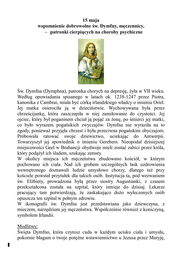 15 maja wspomnienie dobrowolne św. Dymfny, męczennicy, patronki cierpiących na choroby psychiczne Św. Dymfna (Dymphna), patronka chorych na depresję, żyła w VII wieku. Według opowiadania spisanego w latach ok. 1238-1247 przez Piotra, kanonika z Cambrai, miała być córką irlandzkiego władcy o imieniu Oriel. Jej matka osierociła ją w dzieciństwie. Wychowywana była przez chrześcijankę, która zaszczepiła w niej zamiłowanie do czystości. Jej ojciec, który był poganinem chciał ją pojąć za żonę, po śmierci jej matki, co było wyrazem pogańskich zwyczajów. Dymfna nie wyraziła na to zgody, ponieważ przyjęła chrzest i była przeciwna pogańskim obyczajom. Próbowała ratować swoje dziewictwo, uciekając do Antwerpii. Towarzyszył jej spowiednik o imieniu Gerebern. Nieopodal dzisiejszej miejscowości Geel w Brabancji obydwoje mieli zostać zabici przez króla, który podążył ich śladem, szukając zemsty. W okolicy miejsca ich męczeństwa zbudowano kościół, w którym pochowano ich ciała. Nad ich grobem szczególnych łask uzdrowienia wewnętrznego doznawali ludzie umysłowo chorzy, dlatego też przy kościele powstał przytułek dla takich osób. Instytucja ta, pod wezwaniem św. Elżbiety, prowadzona byłą przez siostry Augustianki, z czasem przekształcona została na szpital, który istnieje do dzisiaj. Lekarze pracujący tam potwierdzają, że zaskakująco dużo wyleczonych osób opuszcza ten szpital w pełnym zdrowiu. W ikonografii św. Dymfna jest przedstawiana jako dziewczyna, z mieczem, narzędziem jej męczeństwa. Współcześnie również z koniczyną, symbolem Irlandii. Modlitwy: Święta Dymfno, która czynisz cuda w każdym ucisku ciała i umysłu, pokornie błagam o twoje potężne wstawiennictwo u Jezusa przez Maryję, 1 o uzdrowienie z choroby, w mojej obecnej potrzebie … . Święta Dymfno, męczenniczko czystości, patronko tych, którzy cierpią z powodu nerwowych i psychicznych dolegliwości, ukochane dziecka Jezusa i Maryi, przyczyniaj się za mną u Boga. (Ojcze nasz, Zdrowaś Maryjo i Chwała Ojcu) Pełna współczucia święta Dymfno, która mocą Bożą przywróciłaś tak wielu ludziom zdrowie i jasność umysłu, wejrzyj na mnie … (lub wymień imię osoby chorej …) w moim cierpieniu. Ufny w Twoje potężne wstawiennictwo, błagam Cię, byś prosiła Jezusa, miłosiernego Uzdrowiciela chorych, o zdrowienie mnie (lub wspomnianej wcześniej osoby). Spraw, abym dzięki Jego miłości, otrzymał wielką łaskę zdrowia psychicznego. Amen. Święta Dymfno, dziewico i męczennico, módl się za nami. Koronka do św. Dymfny: Na medaliku ze św. Dymfną: Intencje… Na pierwszym paciorku: Ojcze nasz… Na drugim paciorku: Zdrowaś Maryjo… Na 15 paciorkach: Chwała Ojcu… *** Koronka na cześć św. Dymfny składa się z 17 paciorków. Piętnaście paciorków symbolizuje 15 lat życia świętej. Dwa paciorki są w intencji Ojca Świętego. Kolor czerwony oznacza jej męczeństwo, kolor biały oznacza jej dziewictwo, a kolor zielony oznacza osoby dotknięte chorobami nerwowymi czy emocjonalnymi. Święta Dymfna cieszy się od setek lat czcią i miłością tysięcy ludzi, którzy wyzdrowieli z tych chorób za jej wstawiennictwem. 2