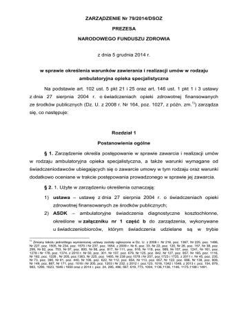 ZARZĄDZENIE Nr 79/2014/DSOZ PREZESA NARODOWEGO FUNDUSZU ZDROWIA z dnia 5 grudnia 2014 r. w sprawie określenia warunków zawierania i realizacji umów w rodzaju ambulatoryjna opieka specjalistyczna Na podstawie art. 102 ust. 5 pkt 21 i 25 oraz art. 146 ust. 1 pkt 1 i 3 ustawy z dnia 27 sierpnia 2004 r. o świadczeniach opieki zdrowotnej finansowanych ze środków publicznych (Dz. U. z 2008 r. Nr 164, poz. 1027, z późn. zm.1)) zarządza się, co następuje: Rozdział 1 Postanowienia ogólne § 1. Zarządzenie określa postępowanie w sprawie zawarcia i realizacji umów w rodzaju ambulatoryjna opieka specjalistyczna, a także warunki wymagane od świadczeniodawców ubiegających się o zawarcie umowy w tym rodzaju oraz warunki dodatkowo oceniane w trakcie postępowania prowadzonego w sprawie jej zawarcia. § 2. 1. Użyte w zarządzeniu określenia oznaczają: 1) ustawa – ustawę z dnia 27 sierpnia 2004 r. o świadczeniach opieki zdrowotnej finansowanych ze środków publicznych; 2) ASDK – ambulatoryjne świadczenia diagnostyczne kosztochłonne, określone w załączniku nr 1 część b do zarządzenia, wykonywane u świadczeniobiorców, 1) którym świadczenia udzielane są w trybie Zmiany tekstu jednolitego wymienionej ustawy zostały ogłoszone w Dz. U. z 2008 r. Nr 216, poz. 1367, Nr 225, poz. 1486, Nr 227, poz. 1505, Nr 234, poz. 1570 i Nr 237, poz. 1654, z 2009 r. Nr 6, poz. 33, Nr 22, poz. 120, Nr 26, poz. 157, Nr 38, poz. 299, Nr 92, poz. 753, Nr 97, poz. 800, Nr 98, poz. 817, Nr 111, poz. 918, Nr 118, poz. 989, Nr 157, poz. 1241, Nr 161, poz. 1278 i Nr 178, poz. 1374, z 2010 r. Nr 50, poz. 301, Nr 107, poz. 679, Nr 125, poz. 842, Nr 127, poz. 857, Nr 165, poz. 1116, Nr 182, poz. 1228 , Nr 205, poz.1363, Nr 225, poz. 1465, Nr 238 poz.1578 i Nr 257, poz.1723 i 1725, z 2011 r. Nr 45, poz. 235, Nr 73, poz. 390, Nr 81, poz. 440, Nr 106, poz. 622, Nr 112, poz. 654, Nr 113, poz. 657, Nr 122, poz. 696, Nr 138, poz. 808, Nr 149, poz. 887, Nr 171, poz. 1016 i Nr 205, poz. 1203 i Nr 232, z 2012 r. poz.123, 1016, 1342 i 1548, z 2013 r. poz. 154, 879, 983, 1290, 1623, 1646 i 1650 oraz z 2014 r. poz. 24, 295, 496, 567, 619, 773, 1004, 1136,1138, 1146, 1175,1188 i 1491. ambulatoryjnym, laboratoriach, przedmiotem realizowane zakładach odrębnego w odpowiednich diagnostycznych, pracowniach, poradniach, będące kontraktowania przez Narodowy Fundusz Zdrowia; 3) charakterystyka grup ambulatoryjnych świadczeń specjalistycznych – zbiór parametrów służących do wyznaczenia ambulatoryjnej grupy świadczeń specjalistycznych, określonych w załączniku nr 7 do zarządzenia; 4) decyzja – diagnostyczna ustalenie rozpoznania na podstawie przeprowadzonego postępowania diagnostycznego, określonego zgodnie z klasyfikacją ICD-10; 5) decyzja terapeutyczna – ustalenie postępowania zmierzającego do rozwiązania problemu zdrowotnego świadczeniobiorcy – określenie procedury medycznej zgodnie z klasyfikacją ICD-9, zalecenia, wskazówki, instrukcje udzielone świadczeniobiorcy, wystawienie recepty, a także określenie zasad realizowania przyjmowania leczenia w leków, wskazanie szczególności w konieczności innych poradniach specjalistycznych lub u lekarza podstawowej opieki zdrowotnej; 6) dostęp – dostęp, o którym mowa w rozporządzeniu Ministra Zdrowia z dnia 6 listopada 2013 r. w sprawie świadczeń gwarantowanych z zakresu ambulatoryjnej opieki specjalistycznej (Dz. U. poz. 1413 i 1442); 7) Fundusz – Narodowy Fundusz Zdrowia; 8) gabinet diagnostyczno-zabiegowy wykonywane są świadczenia – pomieszczenie, zabiegowe, spełniające w którym wymagania określone w rozporządzeniu Ministra Zdrowia z dnia 26 czerwca 2012 r. w sprawie szczegółowych wymagań, jakim powinny odpowiadać pomieszczenia i urządzenia podmiotu wykonującego działalność leczniczą (Dz. U. poz. 739); 9) KAOS – kompleksową ambulatoryjną opiekę specjalistyczną nad świadczeniobiorcą z chorobą przewlekłą, rozliczaną przy pomocy kapitacyjnej stawki rocznej, odrębnie kontraktowaną, wykonywaną w trybie ambulatoryjnym. Kompleksowa opieka zdrowotna nad świadczeniobiorcą 2 spełniającym określone kryteria jest realizowana zgodnie z zasadami określonymi w załączniku nr 3 część c i d do zarządzenia; 10) diagnostyka onkologiczna – diagnostykę, o której mowa w art. 20 ust. 12 ustawy; 11) karta diagnostyki i leczenia onkologicznego – dokument, o którym mowa w art. 32a ust. 1 ustawy; 12) katalog ambulatoryjnych grup świadczeń specjalistycznych – zbiór kategorii specjalistycznych świadczeń o charakterze zabiegowym lub zachowawczym, określonych w załączniku nr 5a do zarządzenia; 13) katalog specjalistycznych świadczeń odrębnych – zbiór specjalistycznych świadczeń ambulatoryjnych, określony w załączniku nr 5b do zarządzenia; 14) diagnostyczny pakiet onkologiczny – zestaw finansowanych ryczałtowo badań w diagnostycznych, szczególności spośród wskazanych w załączniku nr 5c do zarządzenia, które powinny być wykonane u świadczeniobiorcy posiadającego kartę diagnostyki i leczenia onkologicznego, zgodnie z indywidualnymi wskazaniami klinicznymi, w celu wstępnej przeprowadzenia lub pogłębionej diagnostyki onkologicznej; 15) katalog diagnostycznych pakietów onkologicznych – zbiór diagnostycznych pakietów onkologicznych, wykonywanych w ramach wstępnej lub pogłębionej diagnostyki onkologicznej, wykazywanych do rozliczania ryczałtowo za dany pakiet, określony w załączniku nr 5c do zarządzenia; 16) wstępna diagnostyka onkologiczna – świadczenie obejmujące badanie podmiotowe i przedmiotowe rozliczanych w ramach odpowiadającego posiadającego mające zestaw badań diagnostycznego wstępnemu u świadczeniobiorcy onkologicznego, oraz na celu pakietu diagnostycznych onkologicznego rozpoznaniu, kartę wykonywane diagnostyki potwierdzenie lub i leczenia wykluczenie nowotworu złośliwego; 3 17) pogłębiona diagnostyka onkologiczna – świadcz