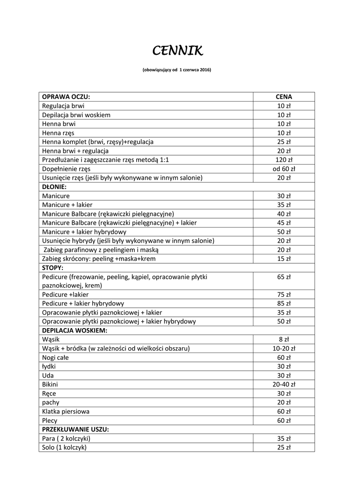 CENNIK (obowiązujący od 1 czerwca 2016) OPRAWA OCZU: Regulacja brwi Depilacja brwi woskiem Henna brwi Henna rzęs Henna komplet (brwi, rzęsy)+regulacja Henna brwi + regulacja Przedłużanie i zagęszczanie rzęs metodą 1:1 Dopełnienie rzęs Usunięcie rzęs (jeśli były wykonywane w innym salonie) DŁONIE: Manicure Manicure + lakier Manicure Balbcare (rękawiczki pielęgnacyjne) Manicure Balbcare (rękawiczki pielęgnacyjne) + lakier Manicure + lakier hybrydowy Usunięcie hybrydy (jeśli były wykonywane w innym salonie) Zabieg parafinowy z peelingiem i maską Zabieg skrócony: peeling +maska+krem STOPY: Pedicure (frezowanie, peeling, kąpiel, opracowanie płytki paznokciowej, krem) Pedicure +lakier Pedicure + lakier hybrydowy Opracowanie płytki paznokciowej + lakier Opracowanie płytki paznokciowej + lakier hybrydowy DEPILACJA WOSKIEM: Wąsik Wąsik + bródka (w zależności od wielkości obszaru) Nogi całe łydki Uda Bikini Ręce pachy Klatka piersiowa Plecy PRZEKŁUWANIE USZU: Para ( 2 kolczyki) Solo (1 kolczyk) CENA 10 zł 10 zł 10 zł 10 zł 25 zł 20 zł 120 zł od 60 zł 20 zł 30 zł 35 zł 40 zł 45 zł 50 zł 20 zł 20 zł 15 zł 65 zł 75 zł 85 zł 35 zł 50 zł 8 zł 10-20 zł 60 zł 30 zł 30 zł 20-40 zł 30 zł 20 zł 60 zł 60 zł 35 zł 25 zł MAKIJAŻ: Panny młodej Dzienny Wieczorowy Rzęsy kępki ZABIEGI (twarz, szyja, dekolt): OCZYSZCZAJĄCO – NORMALIZUJĄCY WYCISZAJĄCY NAWILŻAJĄCY 40 zł 40 zł 40 zł 15-20 zł PROBLEM Cera mieszana, tłusta, trądzikowa, rozszerzone pory, zanieczyszczenia, świecenie Cera naczyniowa, wrażliwa ze skłonnością do rumienia, objawy trądziku różowatego Cera sucha, łuszcząca się, odwodniona, wrażliwa, dojrzała z utratą jędrności Cera przesuszona, zmęczona, utrata napięcia, pierwsze oznaki starzenia, zmarszczki mimiczne STYMULUJĄCY na pierwsze oznaki starzenia Maska w tabletce Maska w płacie Cera dojrzałą, utrata elastyczności i jędrności, zmarszczki, PRZECIWZMARSZCZKOWY brak witalności ODMŁADZAJĄCY Zabieg pielęgnacyjny Zabieg bankietowy Dla cer atopowych, wrażliwych, fotostarzenie, utrata ZABIEG ŁAGODZĄCO jędrności i gęstości skóry REGENERUJĄCY Peeling kawitacyjny (pełny zabieg) Mikrodermabrazja (pełny zabieg) Sonoforeza (przy peelingu kawitacyjnym lub mikrodermabrazji) EKSFOLIACJA KWASAMI: Anti – Acne 50% Hyperpigmentation 50% Anti – Age 45% 100 - 115 zł 110 zł 100 zł 110 zł 120 zł 110 zł 120 zł 100 zł 100 zł 100 zł 15 zł 110 zł Multi Fruit 35% TERAPIA MIKROIGŁOWA: zabieg przeciwzmarszczkowy dla cery dojrzałej Zabieg dla cery suchej, łuszczącej się, odwodnionej 1 zabieg+roller kolejne zabiegi (max do 4.) 150 zł 130 zł