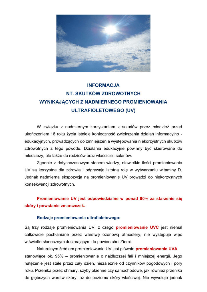 INFORMACJA NT. SKUTKÓW ZDROWOTNYCH WYNIKAJĄCYCH Z NADMIERNEGO PROMIENIOWANIA ULTRAFIOLETOWEGO (UV) W związku z nadmiernym korzystaniem z solariów przez młodzież przed ukończeniem 18 roku życia istnieje konieczność zwiększenia działań informacyjno edukacyjnych, prowadzących do zmniejszenia występowania niekorzystnych skutków zdrowotnych z tego powodu. Działania edukacyjne powinny być skierowane do młodzieży, ale także do rodziców oraz właścicieli solariów. Zgodnie z dotychczasowym stanem wiedzy, niewielkie ilości promieniowania UV są korzystne dla zdrowia i odgrywają istotną rolę w wytwarzaniu witaminy D. Jednak nadmierna ekspozycja na promieniowanie UV prowadzi do niekorzystnych konsekwencji zdrowotnych. Promieniowanie UV jest odpowiedzialne w ponad 80% za starzenie się skóry i powstanie zmarszczek. Rodzaje promieniowania ultrafioletowego: Są trzy rodzaje promieniowania UV, z czego promieniowanie UVC jest niemal całkowicie pochłaniane przez warstwę ozonową atmosfery, nie występuje więc w świetle słonecznym docierającym do powierzchni Ziemi. Naturalnym źródłem promieniowania UV jest głównie promieniowanie UVA stanowiące ok. 95% – promieniowanie o najdłuższej fali i mniejszej energii. Jego natężenie jest stałe przez cały dzień, niezależnie od czynników pogodowych i pory roku. Przenika przez chmury, szyby okienne czy samochodowe, jak również przenika do głębszych warstw skóry, aż do poziomu skóry właściwej. Nie wywołuje jednak rumienia, a efekty jego niekorzystnego działania są zauważalne dopiero po latach, ponieważ dawki promieniowania UVA kumulują się. Ten rodzaj promieniowania przyczynia się również do reakcji fotouczulających i jest główną przyczyną fotostarzenia się skóry. Trzecim rodzajem promieniowania jest promieniowanie UVB (ok. 5%) charakteryzujące się krótszą falą i większą energią, a tym samym jest znacznie bardziej niebezpieczne dla zdrowia. Najsilniej działa ono w godzinach 10:00-15:00, a w okresie letnim jego natężenie jest zdecydowanie wyższe. Można się przed nim częściowo ochronić, bowiem jest ono filtrowane przez chmury, szyby okienne czy samochodowe. Ten rodzaj promieniowania UV nie wnika głęboko w skórę, działa głównie na poziomie naskórka. Na skutki jego niekorzystnego działania nie trzeba długo czekać. Promieniowanie UVB odpowiedzialne jest za poparzenia skóry i wystąpienie rumienia posłonecznego. Ponadtopowoduje zmniejszenie odpowiedzi immunologicznej organizmu, co może predysponować do wystąpienia zmian nowotworowych skóry oraz innych organów (może być jednym z powodów występowania np. zaćmy). Zdrowotne konsekwencje narażania na promieniowanie UV: fotostarzenie się skóry - czyli przedwczesne starzenie się skóry spowodowane wieloma procesami zachodzącymi pod wpływem promieniowania ultrafioletowego, nowotwory skóry - nadmierna ekspozycja na promieniowanie UV może prowadzić do przewlekłym zmian skórnych o charakterze nowotworowym jak: czerniak złośliwy, rak podstawnokomórkowy, rak kolczystonabłonkowy, przebarwienia skóry - pojawiają się w przypadku nadmiernego przebywania na słońcu lub intensywnego, długotrwałego korzystania z solarium, zaskórniki - promieniowanie UV ma wpływ na wzrost ilości pojawiających się zaskórników na skórze, nadprodukcja wolnych rodników - czyli reaktywnych form tlenu, które powodują utlenianie, drobne uszkodzenia i degenerację włókiem kolagenowych. Pogarszają stan skóry, przyspieszają jej starzenie, immunosupresja - zwiększona ekspozycja na promieniowanie UV prowadzi do osłabienia układu odpornościowego. Udowodniono, że intensywne opalanie się prowadzi do reaktywacji wirusa opryszczki - Hermes Simplex Virus. Poziom odporności organizmu przez promieniowanie UVB zależy od indywidualnych i genetycznych uwarunkowań, fotodermatozy – nienowotworowe choroby skóry, wynikające z powstających w organizmie szkodliwych związków, aktywujących się pod wpływem promieni UV, choroby oczu – wykazano, że istnieje zależność między zaćmą a nadmierną ilością promieniowania UVB. Dlatego tak ważna jest ochrona oczu za pomocą okularów przeciwsłonecznych, które wyposażone są w specjalne filtry. Na całym świecie rocznie ok. 12-15 ml osób oślepło z powodu zaćmy, z czego 20% może być spowodowane działaniem promieniowania słonecznego, rumień i oparzenia słoneczne, reakcje fotouczulające1. Dzieci i młodzież są szczególnie narażone na szkodliwy wpływ promieniowania UV. Nadmierna ekspozycja młodzieży na słońce, szczególnie sztuczne, może przyczynić się do powstania raka skóry w późniejszym wieku. Mechanizmy dowodzące tej zależności nie są do końca jasne, ale pewne jest, że skóra jest bardziej podatna na szkodliwe skutki promieniowania UV w okresie rozwojowym. Narażenie na długotrwałą ekspozycję na promieniowanie UV (zarówno naturalne i sztuczne) w okresie dzieciństwa i dojrzewania, znacząco zwiększa ryzyko wystąpienia czerniaka i innych nowotworów skóry w późniejszym wieku, a w/w predyspozycja zwiększa się u osób narażonych na promieniowanie UV przed ukończeniem 18 roku życia. Z Konwencji o Prawach Dziecka przyjętej przez Organizację Narodów Zjednoczonych wynika, że dzieci i młodzież na wszystkich etapach rozwoju, od poczęcia aż do 18r.ż., mają prawo do korzystania z najwyższego, możliwego do osiągnięcia poziomu ochrony zdrowia i bezpiecznego środowiska. Zalecane środki chroniące przed nadmiernym promieniowaniem UV (wg WHO): należy ograniczyć czas przebywania w słońcu szczególnie koło południa, w godz. 10:00-14:00, należy robić przerwy w opalaniu się, częściej przebywać w cieniu, należy nosić ubrania ochronne, bawełniane, nie eksponować całego ciała, szczególnie chronić: oczy, twarz, szyję, należy nosić okulary przeciwsłoneczne z panelami bocznymi, które stanowią 99- 100% ochro