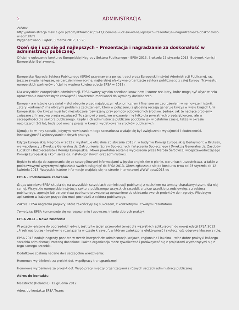 ADMINISTRACJA Źródło: http://administracja.mswia.gov.pl/adm/aktualnosci/5947,Ocen-sie-i-ucz-sie-od-najlepszych-Prezentacja-i-nagradzanie-za-doskonaloscw-adm.html Wygenerowano: Piątek, 3 marca 2017, 15:26 Oceń się i ucz się od najlepszych – Prezentacja i nagradzanie za doskonałość w administracji publicznej. Oficjalne ogłoszenie konkursu Europejskiej Nagrody Sektora Publicznego – EPSA 2013, Bruksela 25 stycznia 2013, Budynek Komisji Europejskiej Berlaymont. Europejska Nagroda Sektora Publicznego (EPSA) przyznawana po raz trzeci przez Europejski Instytut Administracji Publicznej, raz jeszcze skupia najlepsze, najbardziej innowacyjne, najbardziej efektywne organizacje sektora publicznego z całej Europy. Trzynastu europejskich partnerów oficjalnie wspiera kolejną edycję EPSA w 2013 r. Dla wszystkich europejskich administracji, EPSA tworzy wysoko oceniane know-how i istotne rezultaty, które mogą być użyte w celu opracowania nowoczesnych rozwiązań i stworzenia możliwości do wymiany doświadczeń. Europa – a w istocie cały świat – stoi obecnie przed najgłębszym ekonomicznym i finansowym zagrożeniem w najnowszej historii. „Stary kontynent” ma olbrzymi problem z zadłużeniem, który w połączeniu z globalną recesją generuje kryzys w wielu krajach Unii Europejskiej. Ów kryzys musi być niezwłocznie rozwiązany przy pomocy odpowiednich środków. Jednak, jak te naglące problemy związane z finansową presją rozwiązać? To stanowi prawdziwe wyzwanie, nie tylko dla prywatnych przedsiębiorców, ale w szczególności dla sektora publicznego. Rządy i ich administracje publiczne podobnie jak w ostatnim czasie, także w okresie najbliższych 3-5 lat, będą pod mocną presją w kwestii wydatkowania środków publicznych. Ujmując to w inny sposób, jedynym rozwiązaniem tego scenariusza wydaje się być zwiększenie wydajności i skuteczności, innowacyjność i wykorzystanie dobrych praktyk. Edycja Europejskiej Nagrody w 2013 r. wystartuje oficjalnie 25 stycznia 2013 r. w budynku Komisji Europejskiej Berlaymont w Brukseli, we współpracy z Dyrekcją Generalną ds. Zatrudnienia, Spraw Społecznych i Włączenia Społecznego i Dyrekcją Generalną ds. Zasobów Ludzkich i Bezpieczeństwa Komisji Europejskiej. Mowa powitalna zostanie wygłoszona przez Maroša Šefčoviča, wiceprzewodniczącego Komisji Europejskiej i komisarza ds. instytucjonalnych oraz administracji. Będzie to okazja do zapoznania się ze szczegółowymi informacjami w języku angielskim o planie, warunkach uczestnictwa, a także z podstawowymi wytycznymi zgłaszania swoich osiągnięć do EPSA 2013. Okres zgłaszania się do konkursu trwa od 25 stycznia do 12 kwietnia 2013. Wszystkie istotne informacje znajdują się na stronie internetowej WWW.epsa2013.eu EPSA – Podstawowe założenia Grupa docelowa:EPSA skupia się na wszystkich szczeblach administracji publicznej z naciskiem na tematy charakterystyczne dla niej samej. Wszystkie europejskie instytucje sektora publicznego wszystkich szczebli, a także wszelkie przedsięwzięcia z sektora publicznego, agencje lub partnerstwa publiczno-prywatne są uprawnione do składania swoich projektów do nagrody. Wiodącym aplikantem w każdym przypadku musi pochodzić z sektora publicznego. Zakres: EPSA nagradza projekty, które zakończyły się sukcesem, z konkretnymi i trwałymi rezultatami. Tematyka: EPSA koncentruje się na rozpoznaniu i upowszechnianiu dobrych praktyk EPSA 2013 – Nowe założenia W przeciwieństwie do poprzednich edycji, jest tylko jeden przewodni temat dla wszystkich aplikujących do nowej edycji EPSA 2013 „Przetrwać burzę – kreatywne rozwiązania w czasie kryzysu”, w którym zwiększona efektywność i skuteczność odgrywa kluczową rolę. EPSA 2013 nadaje nagrody ponadto w trzech kategoriach: administracja krajowa, regionalna i lokalna – więc dobre praktyki każdego szczebla administracji zostaną docenione i każda organizacja może rywalizować i porównywać się z projektami wywodzącymi się z tego samego szczebla. Dodatkowo zostaną nadane dwa szczególne wyróżnienia: Honorowe wyróżnienie za projekt dot. współpracy transgranicznej Honorowe wyróżnienie za projekt dot. Współpracy między organizacjami z różnych szczebli administracji publicznej Adres do kontaktu Maastricht (Holandia), 12 grudnia 2012 Adres do kontaktu EPSA Team: Pan Claude Rongione, Information Officer EPSA 2013 Europejski Instytut Administracji Publicznej tel.: +31 (0)43 32 96 278; email: [email protected] www.epsa2013.eu Oficjalni PartnerzyEPSA 2013: Komisja Europejska Austria Dania Niemcy Węgry Włochy Przy wsparciu miasta Maastricht i Prowincji Limburgii. Wstecz Drukuj PDF Powiadom znajomego Luksemburg Holandia Norwegia Polska Szwajcaria