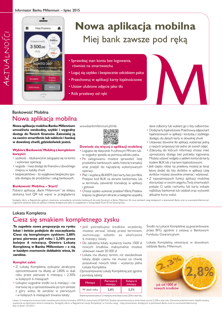 Informator Banku Millennium – lipiec 2015 AKTUALNOŚCI Nowa aplikacja mobilna Miej bank zawsze pod ręką •Sprawdzaj stan konta bez logowania, również na smartwatchu • Loguj się szybko i bezpiecznie odciskiem palca • Przechowuj w aplikacji karty lojalnościowe • Ustaw ulubione zdjęcie jako tło • Rób przelewy od ręki Bankowość Mobilna Nowa aplikacja mobilna Nowa aplikacja mobilna Banku Millennium umożliwia swobodny, szybki i wygodny dostęp do Twoich finansów. Zainstaluj ją na swoim smartfonie lub tablecie i bankuj w dowolnej chwili, gdziekolwiek jesteś. Wybierz Bankowość Mobilną z kompletem korzyści: •szybkość – błyskawicznie zalogujesz się na konto i wykonasz operację •wygoda – masz dostęp do finansów z dowolnego miejsca, w każdej chwili •bezpieczeństwo – to wyjątkowo bezpieczny sposób dostępu do produktów i usług bankowych. Bankowość Mobilna – Start! Pobierz aplikację „Bank Millennium” ze sklepu, zeskanuj kod QR lub wpisz w przeglądarce www.bankmillennium.pl/mb Dowiedz się więcej o aplikacji mobilnej •Logujesz się klasycznie 4-cyfrowym PIN-em lub w wygodny sposób, za pomocą odcisku palca. •Po zalogowaniu możesz sprawdzić listę produktów bankowych, saldo, historię transakcji oraz przejść do najczęściej wykonywanych operacji. •Płać i wypłacaj BLIKIEM, bez karty, bez portfela. Przepisz kod BLIK na ekranie bankomatu lub w terminalu, zatwierdź transakcję w aplikacji i gotowe. •Chcesz szybko wykonać przelew? Kliknij Przelew krajowy na głównym ekranie, a następnie uzupełnij dane odbiorcy lub wybierz go z listy odbiorców. •Dodaj karty lojalnościowe. Przechowuj zdjęcia kart lojalnościowych w aplikacji i korzystaj z szybkiego dostępu do danych karty w dowolnej chwili. •Ustawiasz dowolne tło aplikacji, wybierasz jedną z naszych propozycji lub jedno ze swoich zdjęć. •Zdecyduj, do których informacji chcesz mieć uproszczony dostęp, bez potrzeby logowania. Możesz ustawić widgety z saldem konta lub karty, kodem BLIK lub z kartami lojalnościowymi. • Jeśli często robisz np. przelewy, możesz je teraz łatwo dodać do listy skrótów w aplikacji. Listę skrótów możesz dowolnie zmieniać i edytować. •Z najważniejszych funkcji aplikacji mobilnej skorzystasz w swoim zegarku.Twój smartwatch pokaże Ci saldo rachunku lub karty, wskaże najbliższy bankomat lub oddział oraz wyświetli aktualne kursy walut. Szczegóły oferty w Regulaminie ogólnym otwierania i prowadzenia rachunków bankowych dla osób fizycznych w Banku Millennium SA oraz cennikach usług dostępnych w placówkach Banku oraz na www.bankmillennium.pl. Logowanie odciskiem palca do aplikacji mobilnej dostępne jest tylko na urządzeniach z funkcją Apple Touch ID lub Samsung Pass. Lokata Kompletna Ciesz się smakiem kompletnego zysku To zupełnie nowa propozycja na rynku lokat i świeże podejście do oszczędzania. Ciesz się kompletnym zyskiem: 2,80% przez pierwsze pół roku i 2,30% przez kolejne 6 miesięcy. Otwórz Lokatę Kompletną w Banku Millennium – z nią w każdym momencie dokładnie wiesz, ile zarobisz. Komplet zalet: • Z Lokatą Kompletną zyskujesz atrakcyjne oprocentowanie na dłużej: aż 2,80% w skali roku przez pierwsze 6 miesięcy, i 2,30% w kolejnych 6 miesiącach • Lokujesz wygodnie środki na 6 miesięcy i nie martwisz się o oprocentowanie po tym okresie: z góry wiesz, ile zarobisz w pierwszych i w kolejnych 6 miesiącach trwania lokaty • Jeśli potrzebujesz środków wcześniej, możesz zerwać lokatę przed terminem, zachowując odsetki za ukończone 6 miesięcy lokaty • Do założenia lokaty wystarczy kwota 1000 zł nowych środków, maksymalnie możesz ulokować nawet 50 000 zł • Lokata ma dłuższy termin, niż standardowe lokaty, dzięki czemu nie musisz co chwilę poszukiwać nowych lokat – wystarczy jedna Lokata Kompletna Oprocentowanie Lokaty Kompletnej jest zgodne z poniższą tabelą: Miesiące Pierwsze 6 miesięcy Kolejne 6 miesięcy W skali roku 2,8% 2,3% Środki na Lokacie Kompletnej są gwarantowane przez BFG, zgodnie z ustawą o Bankowym Funduszu Gwarancyjnym. Lokatę Kompletną otworzysz w dowolnym oddziale Banku Millennium. już od 1000 zł nowych środków Średnie oprocentowanie za 12-miesięczny okres lokaty wynosi 2,55% w skali roku. Lokata 12-miesięczna na nowe środki, nieodnawialna. Kwota minimalna 1000 PLN, maksymalna 50 000 PLN. Średnie oprocentowanie za okres lokaty wynosi 2,55% w skali roku. Zerwanie przed terminem: odsetki zostaną wypłacone za zakończony okres 6-miesięczny. Szczegóły oferty w Regulaminie Lokaty Kompletnej i w Cenniku usług – stopy procentowe, dostępnych w placówkach Banku oraz na www.bankmillennium.pl Stan na dzień 1.07.2015 r. Pożyczka Gtówkowa 5 składników doskonałej pożyczki Nie zapominaj o swoich planach i marzeniach. Dzięki Pożyczce Gotówkowej w Banku Millennium zrealizujesz je naprawdę szybko i łatwo. Myślisz o większych zakupach, nowym sprzęcie lub wyjeździe? Nie odkładaj planów na później. Dodatkowe pieniądze czekają! Warto skorzystać z Pożyczki Gotówkowej, bo… … oszczędzasz pieniądze Wraz z pożyczką otrzymasz Gwarancję Najniższego Oprocentowania. Jeśli w ciągu 30 dni po zawarciu umowy pożyczki znajdziesz tańszą ofertę dla tej samej kwoty i okresu kredytowania – obniżymy Twoje oprocentowanie i zwrócimy Ci różnicę już zapłaconych u nas odsetek. … realizujesz swoje marzenia i potrzeby Gotówka, której potrzebujesz, trafi na Twoje konto nawet w ciągu 1 dnia. A dodatkowo, w razie nieprzewidzianych wydatków lub … łatwiej zarządzasz budżetem domowym To Ty decydujesz o dniu spłaty raty, a jej wysokość możesz dopasować do swoich możliwości – raty możesz rozłożyć nawet na 7 lat! Jeśli płacisz raty innych pożyczek i kredytów, dzięki usłudze konsolidacji możesz je w prosty sposób przenieść do Banku Millennium, by zredukować koszty miesięc
