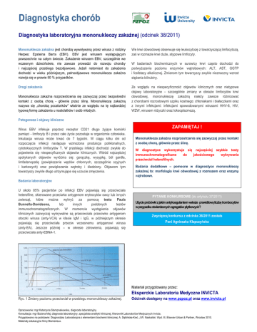 Diagnostyka chorób Diagnostyka laboratoryjna mononukleozy zakaźnej (odcinek 38/2011) Mononukleoza zakaźna jest chorobą wywoływaną przez wirusa z rodziny Herpes: Epsteina Barra (EBV). EBV jest wirusem występującym powszechnie na całym świecie. ZakaŜenie wirusem EBV, szczególnie we wczesnym dzieciństwie, nie zawsze prowadzi do rozwoju choroby i najczęściej przebiega bezobjawowo. JeŜeli natomiast do zakaŜenia dochodzi w wieku późniejszym, pełnoobjawowa mononukleoza zakaźna rozwija się w prawie 50 % przypadków. We krwi obwodowej obserwuje się leukocytozę z towarzyszącą limfocytozą, zaś w rozmazie krwi duŜe, atypowe limfocyty. Drogi zakaŜenia Ze względu na niespecyficzność objawów klinicznych oraz nietypowe objawy laboratoryjne – szczególnie zmiany w obrazie limfocytów krwi obwodowej, mononukleozę zakaźną naleŜy zawsze róŜnicować z chorobami rozrostowymi szpiku kostnego: chłoniakami i białaczkami oraz z innymi infekcjami: infekcjami spowodowanymi wirusami HHV-6, HIV, WZW, wirusem róŜyczki oraz toksoplazmozą. Mononukleoza zakaźna rozprzestrzenia się zazwyczaj przez bezpośredni kontakt z osobą chorą - głównie przez ślinę. Mononukleozę zakaźną nazywa się „chorobą pocałunków” właśnie ze względu na tę najbardziej typową formę zakaŜenia u nastolatków i osób młodych. W badaniach biochemicznych w surowicy krwi często dochodzi do podwyŜszenia poziomu enzymów wątrobowych: ALT, AST, GGTP i fosfatazy alkalicznej. Zmianom tym towarzyszy zwykle nieznaczny wzrost stęŜenia bilirubiny. Patogeneza i objawy kliniczne Wirus EBV infekuje poprzez receptor CD21 długo Ŝyjące komórki pamięci - limfocyty B i przez całe Ŝycie pozostaje w organizmie człowieka. Inkubacja wirusa moŜe trwać do 7 tygodni. W ciągu kilku dni od rozpoczęcia infekcji następuje wzmoŜona produkcja poliklonalnych, cytotoksycznych limfocytów T. W przebiegu infekcji dochodzi zwykle do pojawienia się niespecyficznych objawów klinicznych. Wśród najczęściej spotykanych objawów wyróŜnia się: gorączkę, wysypkę, ból gardła, limfadenopatię (powiększenie węzłów chłonnych, szczególnie szyjnych i karkowych) oraz powiększenie wątroby i śledziony. Objawom tym towarzyszy zwykle długo utrzymujące się uczucie zmęczenia. ZAPAMIĘTAJ ! Mononukleoza zakaźna rozprzestrzenia się zazwyczaj przez kontakt z osobą chorą, głównie przez ślinę. W diagnostyce wykorzystuje się najczęściej szybkie testy immunochromatograficzne do jakościowego wykrywania przeciwciał heterofilnych. Badania dodatkowe – pomocne w diagnostyce mononukleozy zakaźnej to: morfologia krwi obwodowej z rozmazem oraz enzymy wątrobowe. Badania laboratoryjne U około 85% pacjentów po infekcji EBV pojawiają się przeciwciała heterofilne, skierowane przeciwko antygenom erytrocytów owcy lub innych zwierząt, które moŜna wykryć za pomocą testu Paula Bunnella-Davidsona, lub innych podobnych testów immunochromatograficznych. W momencie wystąpienia objawów klinicznych zazwyczaj wykrywalne są przeciwciała przeciwko antygenom otoczki wirusa (anty-VCA) w klasie IgM i IgG, w późniejszym okresie pojawiają się przeciwciała przeciw wczesnemu antygenowi wirusa (anty-EA). Jeszcze później – w okresie zdrowienia, pojawiają się przeciwciała anty-EBNA-1. PYTANIE KONKURSOWE (do artykułu 37/2011) UŜycie probówki z jakim antykoagulantem wskaŜe prawidłową liczbę trombocytów w przypadku stwierdzonych agregatów płytkowych? Zwycięzcą konkursu z odcinka 36/2011 została Pani Agnieszka Klapczyńska Materiał przygotowany przez: Eksperckie Laboratoria Medyczne INVICTA Ryc. 1 Zmiany poziomu przeciwciał w przebiegu mononukleozy zakaźnej. Odcinek dostępny na www.pzpoz.pl oraz www.invicta.pl Opracowanie: mgr Katarzyna Stempnakowska, diagnosta laboratoryjny. Konsultacja: mgr BoŜena Maj, diagnosta laboratoryjny, specjalista analityki klinicznej, Kierownik Laboratoriów Medycznych Invicta. Przygotowano na podstawie: Diagnostyka Laboratoryjna z elementami biochemii klinicznej. A. Dębińska-Kieć, J.W. Naskalski. Wyd. III, Elsevier Urban & Partner, Wrocław 2010. Materiały edukacyjne firmy Biomerieux.