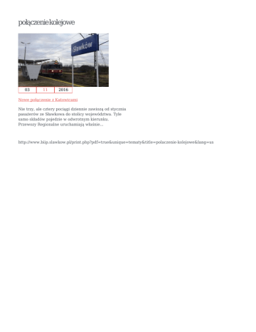 połączeniekolejowe 03 11 2016 Nowe połączenie z Katowicami Nie trzy, ale cztery pociągi dziennie zawiozą od stycznia pasażerów ze Sławkowa do stolicy województwa. Tyle samo składów pojedzie w odwrotnym kierunku. Przewozy Regionalne uruchamiają właśnie... http://www.biip.slawkow.pl/print.php?pdf=true&unique=tematy&title=polaczenie-kolejowe&lang=us