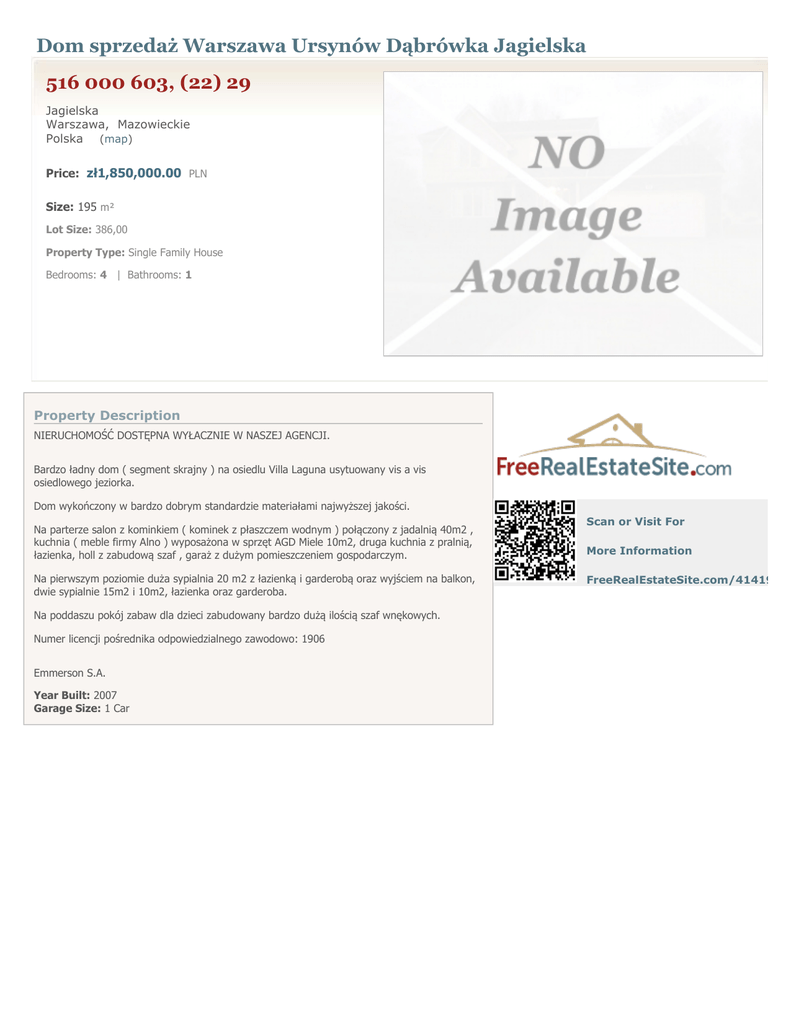 Dom sprzedaż Warszawa Ursynów Dąbrówka Jagielska 516 000 603, (22) 29 Jagielska Warszawa, Mazowieckie Polska (map) Price: zł1,850,000.00 PLN Size: 195 m² Lot Size: 386,00 Property Type: Single Family House Bedrooms: 4 | Bathrooms: 1 Property Description NIERUCHOMOŚĆ DOSTĘPNA WYŁACZNIE W NASZEJ AGENCJI. Bardzo ładny dom ( segment skrajny ) na osiedlu Villa Laguna usytuowany vis a vis osiedlowego jeziorka. Dom wykończony w bardzo dobrym standardzie materiałami najwyższej jakości. Na parterze salon z kominkiem ( kominek z płaszczem wodnym ) połączony z jadalnią 40m2 , kuchnia ( meble firmy Alno ) wyposażona w sprzęt AGD Miele 10m2, druga kuchnia z pralnią, łazienka, holl z zabudową szaf , garaż z dużym pomieszczeniem gospodarczym. Na pierwszym poziomie duża sypialnia 20 m2 z łazienką i garderobą oraz wyjściem na balkon, dwie sypialnie 15m2 i 10m2, łazienka oraz garderoba. Na poddaszu pokój zabaw dla dzieci zabudowany bardzo dużą ilością szaf wnękowych. Numer licencji pośrednika odpowiedzialnego zawodowo: 1906 Emmerson S.A. Year Built: 2007 Garage Size: 1 Car Scan or Visit For More Information FreeRealEstateSite.com/414190