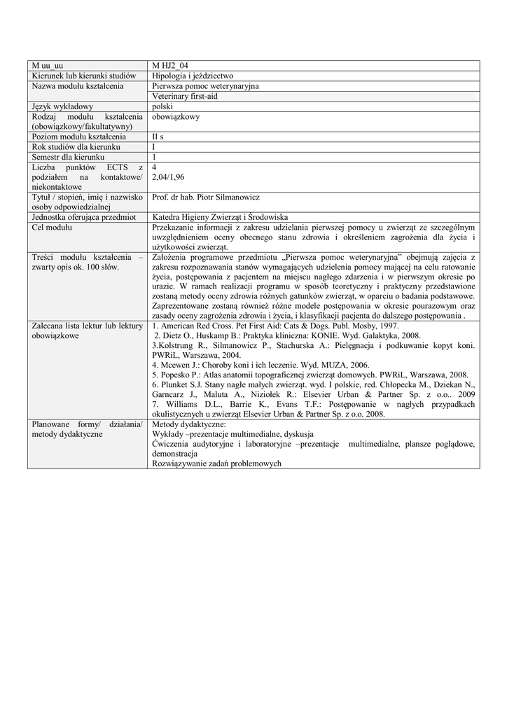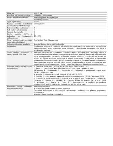 M uu_uu Kierunek lub kierunki studiów Nazwa modułu kształcenia Język wykładowy Rodzaj modułu kształcenia (obowiązkowy/fakultatywny) Poziom modułu kształcenia Rok studiów dla kierunku Semestr dla kierunku Liczba punktów ECTS z podziałem na kontaktowe/ niekontaktowe Tytuł / stopień, imię i nazwisko osoby odpowiedzialnej Jednostka oferująca przedmiot Cel modułu Treści modułu kształcenia – zwarty opis ok. 100 słów. Zalecana lista lektur lub lektury obowiązkowe Planowane formy/ działania/ metody dydaktyczne M HJ2_04 Hipologia i jeździectwo Pierwsza pomoc weterynaryjna Veterinary first-aid polski obowiązkowy II s I 1 4 2,04/1,96 Prof. dr hab. Piotr Silmanowicz Katedra Higieny Zwierząt i Środowiska Przekazanie informacji z zakresu udzielania pierwszej pomocy u zwierząt ze szczególnym uwzględnieniem oceny obecnego stanu zdrowia i określeniem zagrożenia dla życia i użytkowości zwierząt. Założenia programowe przedmiotu „Pierwsza pomoc weterynaryjna” obejmują zajęcia z zakresu rozpoznawania stanów wymagających udzielenia pomocy mającej na celu ratowanie życia, postępowania z pacjentem na miejscu nagłego zdarzenia i w pierwszym okresie po urazie. W ramach realizacji programu w sposób teoretyczny i praktyczny przedstawione zostaną metody oceny zdrowia różnych gatunków zwierząt, w oparciu o badania podstawowe. Zaprezentowane zostaną również różne modele postępowania w okresie pourazowym oraz zasady oceny zagrożenia zdrowia i życia, i klasyfikacji pacjenta do dalszego postępowania . 1. American Red Cross. Pet First Aid: Cats & Dogs. Publ. Mosby, 1997. 2. Dietz O., Huskamp B.: Praktyka kliniczna: KONIE. Wyd. Galaktyka, 2008. 3.Kolstrung R., Silmanowicz P., Stachurska A.: Pielęgnacja i podkuwanie kopyt koni. PWRiL, Warszawa, 2004. 4. Mcewen J.: Choroby koni i ich leczenie. Wyd. MUZA, 2006. 5. Popesko P.: Atlas anatomii topograficznej zwierząt domowych. PWRiL, Warszawa, 2008. 6. Plunket S.J. Stany nagłe małych zwierząt. wyd. I polskie, red. Chłopecka M., Dziekan N., Garncarz J., Maluta A., Niziołek R.: Elsevier Urban & Partner Sp. z o.o.. 2009 7. Williams D.L., Barrie K., Evans T.F.: Postępowanie w nagłych przypadkach okulistycznych u zwierząt Elsevier Urban & Partner Sp. z o.o. 2008. Metody dydaktyczne: Wykłady –prezentacje multimedialne, dyskusja Ćwiczenia audytoryjne i laboratoryjne –prezentacje multimedialne, plansze poglądowe, demonstracja Rozwiązywanie zadań problemowych