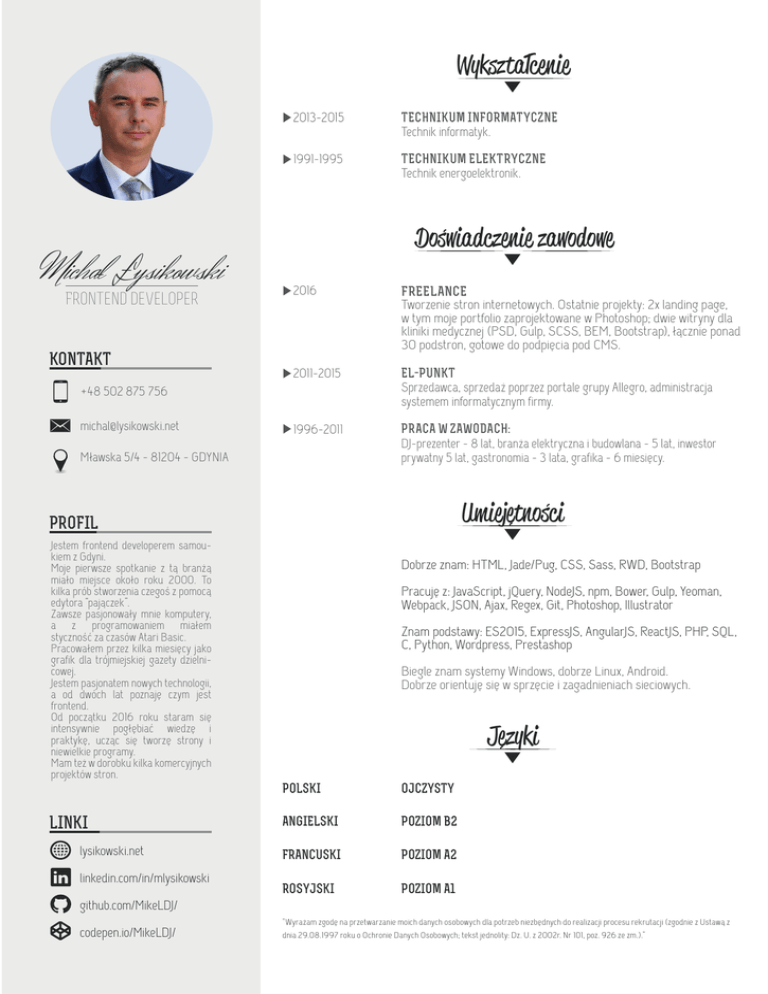 Wyksztalcenie Michał Łysikowski Frontend developer KONTAKT 2013-2015 TECHNIKUM INFORMATYCZNE Technik informatyk. 1991-1995 TECHNIKUM ELEKTRYCZNE Technik energoelektronik. Doswiadczenie zawodowe 2016 FREELANCE Tworzenie stron internetowych. Ostatnie projekty: 2x landing page, w tym moje portfolio zaprojektowane w Photoshop; dwie witryny dla kliniki medycznej (PSD, Gulp, SCSS, BEM, Bootstrap), łącznie ponad 30 podstron, gotowe do podpięcia pod CMS. 2011-2015 EL-PUNKT Sprzedawca, sprzedaż poprzez portale grupy Allegro, administracja systemem informatycznym firmy. 1996-2011 PRACA W ZAWODACH: DJ-prezenter - 8 lat, branża elektryczna i budowlana - 5 lat, inwestor prywatny 5 lat, gastronomia - 3 lata, grafika - 6 miesięcy. +48 502 875 756 [email protected] Mławska 5/4 - 81204 - GDYNIA Umiejetnosci PROFIL Jestem frontend developerem samoukiem z Gdyni. Moje pierwsze spotkanie z tą branżą miało miejsce około roku 2000. To kilka prób stworzenia czegoś z pomocą edytora “pajączek”. Zawsze pasjonowały mnie komputery, a z programowaniem miałem styczność za czasów Atari Basic. Pracowałem przez kilka miesięcy jako grafik dla trójmiejskiej gazety dzielnicowej. Jestem pasjonatem nowych technologii, a od dwóch lat poznaję czym jest frontend. Od początku 2016 roku staram się intensywnie pogłębiać wiedzę i praktykę, ucząc się tworzę strony i niewielkie programy. Mam też w dorobku kilka komercyjnych projektów stron. LINKI lysikowski.net linkedin.com/in/mlysikowski Dobrze znam: HTML, Jade/Pug, CSS, Sass, RWD, Bootstrap Pracuję z: JavaScript, jQuery, NodeJS, npm, Bower, Gulp, Yeoman, Webpack, JSON, Ajax, Regex, Git, Photoshop, Illustrator Znam podstawy: ES2015, ExpressJS, AngularJS, ReactJS, PHP, SQL, C, Python, Wordpress, Prestashop Biegle znam systemy Windows, dobrze Linux, Android. Dobrze orientuję się w sprzęcie i zagadnieniach sieciowych. Jezyki POLSKI OJCZYSTY ANGIELSKI POZIOM B2 FRANCUSKI POZIOM A2 ROSYJSKI POZIOM A1 github.com/MikeLDJ/ codepen.io/MikeLDJ/ “Wyrażam zgodę na przetwarzanie moich danych osobowych dla potrzeb niezbędnych do realizacji procesu rekrutacji (zgodnie z Ustawą z dnia 29.08.1997 roku o Ochronie Danych Osobowych; tekst jednolity: Dz. U. z 2002r. Nr 101, poz. 926 ze zm.).”