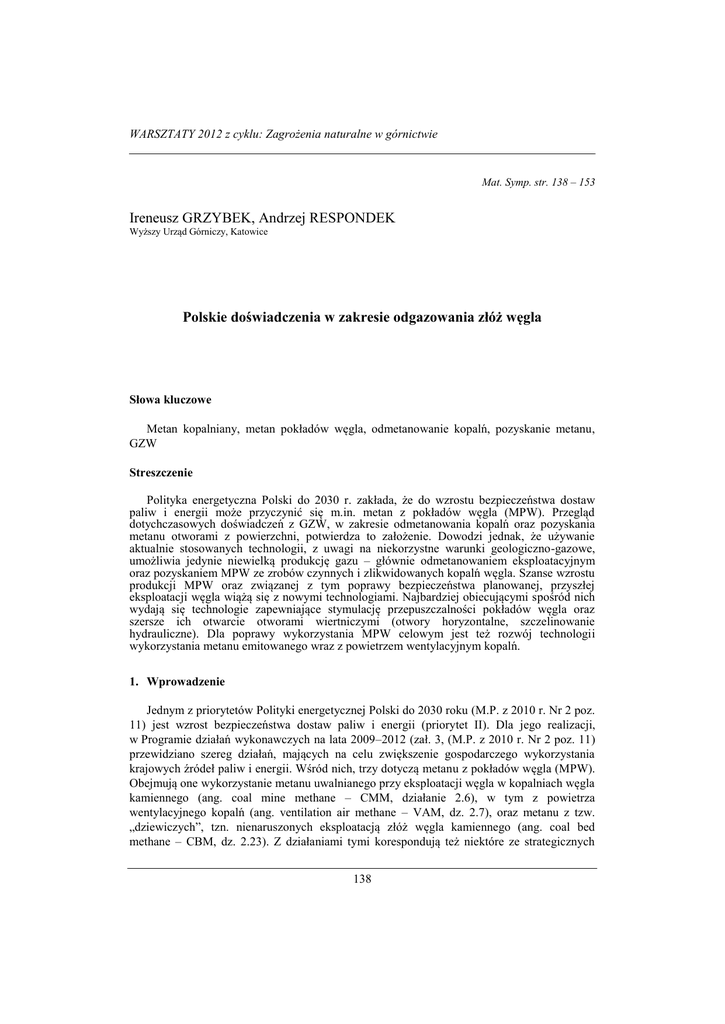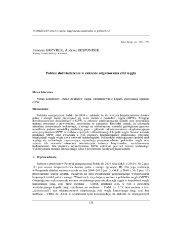 WARSZTATY 2012 z cyklu: Zagrożenia naturalne w górnictwie Mat. Symp. str. 138 – 153 Ireneusz GRZYBEK, Andrzej RESPONDEK Wyższy Urząd Górniczy, Katowice Polskie doświadczenia w zakresie odgazowania złóż węgla Słowa kluczowe Metan kopalniany, metan pokładów węgla, odmetanowanie kopalń, pozyskanie metanu, GZW Streszczenie Polityka energetyczna Polski do 2030 r. zakłada, że do wzrostu bezpieczeństwa dostaw paliw i energii może przyczynić się m.in. metan z pokładów węgla (MPW). Przegląd dotychczasowych doświadczeń z GZW, w zakresie odmetanowania kopalń oraz pozyskania metanu otworami z powierzchni, potwierdza to założenie. Dowodzi jednak, że używanie aktualnie stosowanych technologii, z uwagi na niekorzystne warunki geologiczno-gazowe, umożliwia jedynie niewielką produkcję gazu – głównie odmetanowaniem eksploatacyjnym oraz pozyskaniem MPW ze zrobów czynnych i zlikwidowanych kopalń węgla. Szanse wzrostu produkcji MPW oraz związanej z tym poprawy bezpieczeństwa planowanej, przyszłej eksploatacji węgla wiążą się z nowymi technologiami. Najbardziej obiecującymi spośród nich wydają się technologie zapewniające stymulację przepuszczalności pokładów węgla oraz szersze ich otwarcie otworami wiertniczymi (otwory horyzontalne, szczelinowanie hydrauliczne). Dla poprawy wykorzystania MPW celowym jest też rozwój technologii wykorzystania metanu emitowanego wraz z powietrzem wentylacyjnym kopalń. 1. Wprowadzenie Jednym z priorytetów Polityki energetycznej Polski do 2030 roku (M.P. z 2010 r. Nr 2 poz. 11) jest wzrost bezpieczeństwa dostaw paliw i energii (priorytet II). Dla jego realizacji, w Programie działań wykonawczych na lata 2009–2012 (zał. 3, (M.P. z 2010 r. Nr 2 poz. 11) przewidziano szereg działań, mających na celu zwiększenie gospodarczego wykorzystania krajowych źródeł paliw i energii. Wśród nich, trzy dotyczą metanu z pokładów węgla (MPW). Obejmują one wykorzystanie metanu uwalnianego przy eksploatacji węgla w kopalniach węgla kamiennego (ang. coal mine methane – CMM, działanie 2.6), w tym z powietrza wentylacyjnego kopalń (ang. ventilation air methane – VAM, dz. 2.7), oraz metanu z tzw. „dziewiczych”, tzn. nienaruszonych eksploatacją złóż węgla kamiennego (ang. coal bed methane – CBM, dz. 2.23). Z działaniami tymi korespondują też niektóre ze strategicznych 138 I. GRZYBEK, A. RESPONDEK– Polskie doświadczenia w zakresie odgazowania złóż węgla projektów badawczych Narodowego Centrum Badań i Rozwoju, jak na przykład zadanie „Poprawa efektywności odmetanowania górotworu w warunkach dużej koncentracji wydobycia w podziemnych zakładach górniczych wydobywających węgiel kamienny”, realizowane w ramach projektu „Poprawa bezpieczeństwa pracy w kopalniach”, ogłoszonego przez NCBiR w 2010 r., na wniosek Prezesa Wyższego Urzędu Górniczego. W powyższym kontekście, przed sfinalizowaniem podejmowanych projektów badawczych oraz prac pilotowych i wdrożeniowych, celowym wydaje się uświadomienie sobie, jakimi doświadczeniami w tym zakresie już dysponujemy w Polsce. Konstatacja takiej potrzeby stała się inspiracją do podjęcia próby podsumowania tych doświadczeń, jaką podjęto w prezentowanym artykule. Przedstawiono ją w oparciu o: wyniki wcześniejszych, własnych badań, dostępną literaturę przedmiotu oraz dane przemysłowe, zebrane i zweryfikowane przez autorów w trakcie wieloletniego nadzoru nad zakładami górniczymi i zakładami prowadzącymi roboty geologiczne. Krótką, ograniczoną ramami artykułu, prezentację przedmiotowych zagadnień poprzedzono charakterystyką warunków geologiczno-gazowych najważniejszego z polskich basenów węglowych, w zakresie niezbędnym do lepszego zrozumienia rezultatów dotychczasowych robót górniczych i geologicznych, zmierzających do – odpowiednio: odmetanowania górotworu i pozyskania MPW. 2. Warunki geologiczno-gazowe Górnośląskiego Zagłębia Węglowego Z punktu widzenia obecności metanu, wśród polskich basenów węglowych, najważniejszym jest Górnośląskie Zagłębie Węglowe (GZW). Metanonośność węgla osiąga tu wartości do ponad 25 m3/Mg cdaf (cdaf oznacza czystą substancję węglową), a całkowite zasoby geologiczne metanu do głębokości 1000 m szacowane są na 350–707 mld m3 (Pilcher i in. 1991; Kotas 1994). Analiza metodyki ich oszacowania wskazuje, że niższą z tych wartości można, w przybliżeniu, odnieść do metanu sorbowanego w pokładach węgla, natomiast wyższą do całkowitych zasobów metanu wolnego i sorbowanego, nagromadzonego we wszystkich typach litologicznych skał karbońskich. Cechy budowy geologicznej GZW, w powiązaniu z jego historią geologiczną, wywierają znaczny wpływ na aktualny rozkład przestrzenny metanonośności (Grzybek 2012). W ich konsekwencji obserwowany obecnie wertykalny trend zmian tego parametru polega, w pewnym uproszczeniu, na występowaniu, wraz z rosnącą głębokością, kolejno następujących stref gazowych (Grzybek 2012): - allochtonicznej strefy wysokometanowej, o metanonośnościach do ok. 18 m3/Mg cdaf, - autochtoniczno-allochtonicznej strefy odgazowanej, o metanonośnościach nie przekraczających 4,5 m3/Mg cdaf, - autochtonicznej strefy wysokometanowej, o najwyższych metanonośnościach obserwowanych w GZW (do ok. 25 m3/Mg cdaf). W obrębie strefy allochtonicznej, w obszarach wyniesień stropu karbonu metanowi sorbowanemu w węglu często towarzyszy także metan wolny, nagromadzony w porach skał płonnych karbonu i przykrywających karbon zwietrzelin. Analiza warunków geologiczno-górniczych, przeprowadzona przez M. Kotarbę i innych (Kotarba i in. 1995) pozwoliła podzielić GZW na kilka rejonów, przedstawionych na rysunku 2.1. Rozkłady głębokościowe metanonośności w poszczególnych rejonach wykazują, że: - dla położonych na południu zagłębia rejonów IV i V, a lokalnie także III i VI, charakterystyczne je
