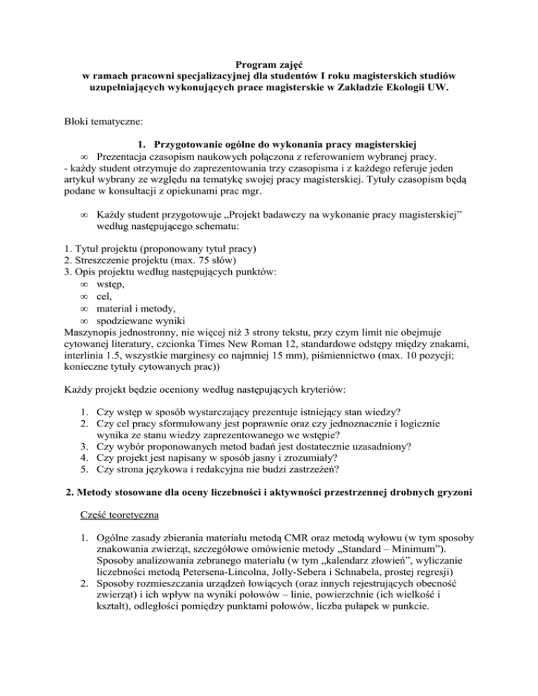 uzupełniających wykonujących prace magisterskie w Zakładzie Ekologii UW.