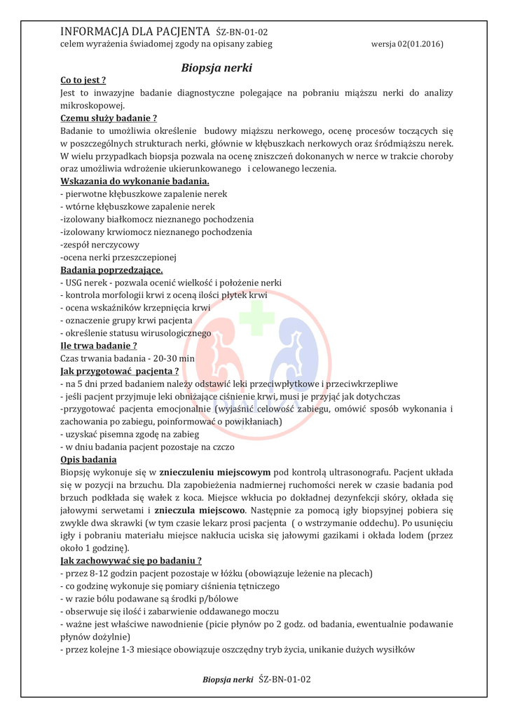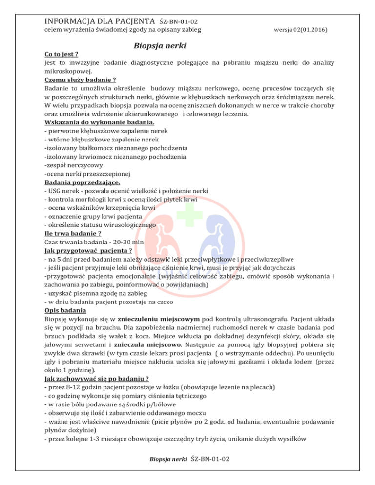 INFORMACJA DLA PACJENTA ŚZ-BN-01-02 Biopsja nerki