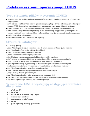 Podstawy systemu operacyjnego LINUX Typy systemów plików w systemie LINUX: ■ ■ ■ ■ ■ ■ ReiserFS – bardzo szybki i stabilny system plików, szczególnie dobrze radzi sobie z dużą liczbą małych plików. XFS – również szybki system plików, głównie za sprawą tego, iż wiele informacji przechowuje w pamięci RAM. Niestety jest przez to podatny na awaryjne przerwanie działania systemu. ext4 ? następca ext3, obecnie jeden z najpopularniejszych systemów plików dla Linuksa. ext3 – w zasadzie jest to ext2 z tą różnicą, że ma mechanizmy księgowania operacji przez co wzrosła stabilność tego systemu plików i odporność na awaryjne przerwanie działania systemu. ext2 – nie zawiera księgowania. ext – starsza wersja ext2. Aktualnie nie używany. Struktura katalogów ■ ■ ■ ■ ■ ■ ■ ■ ■ ■ ■ ■ ■ ■ ■ / – katalog główny /boot ? katalog zawierający pliki niezbędne do uruchomienia systemu (jądro systemu) /etc ? katalog konfiguracyjny większości aplikacji /root ? prywatny katalog super użytkownika /home ? standardowy katalog użytkowników /dev ? katalog przechowujący odnośniki do sterowników urządzeń /lib ? katalog zawierający biblioteki procedur i modułów używanych przez aplikacje /mnt ? katalog przeznaczony do montowania innych pamięci masowych /proc ? pseudokatalog dający dostęp do zaawansowanych funkcji diagnostycznych i konfiguracyjnych (katalog tworzony od nowa po każdym uruchomieniu systemu) /bin ? katalog zawierający narzędzia administracyjne /sbin ? katalog zawierający systemowe narzędzia administracyjne /tmp ? katalog danych tymczasowych /var ? katalog zawierający pliki tworzone przez programy (logi) /usr ? katalog z programami dostępnymi dla wszystkich użytkowników systemu /opt ? katalog w którym instalują się niektóre aplikacje W systemie LINUX występują następujące wartości dla plików: d b c l p s - plik zwykły katalog urządzenie blokowe (np. dysk) urządzenie znakowe dowiązanie symboliczne potok plik wymiany miedzy procesami Projekt logiczny sieci. Projekt logiczny sieci powinien zawierać schemat sieci obejmujący strukturę organizacyjną oraz usług sieciowych. Urządzenia końcowe – komputery, serwery, drukarki itp. Urządzenia sieciowe – routery, przełączniki itp. Dla urządzeń końcowych zaleca się automatyczną konfigurację protokołu IP za pomocą DHCP. Dzielenie sieci na podsieci. Cel: ■ ■ zarządzanie ruchem rozgłoszeniowym, zwiększenie bezpieczeństwa. Na etapie projektowania można wykonać ogólny schemat nadawania adresów IP np: Pierwszy adres IP sieci jest zarezerwowany dla bramy domyślnej. Adresy IP serwerów x.x.x.10 do x.x.x.49 Adresy IP urządzeń końcowych x.x.x.100 do x.x.x.199 Adresy IP urządzeń sieciowych mieszczą się w zakresie x.x.x.210 do x.x.x 230 Analiza biznesowa potrzeb zamawiającego 1. 2. 3. 4. 5. 6. Informacje o firmie (wielkość, rodzaj prowadzonej działalności, rozwój firmy). Struktura organizacyjna firmy (liczba pracowników, ilość działów). Określenie pomieszczeń oraz budynków, rozmieszczenie stanowisk komputerowych. Plany budynków,stan instalacji elektrycznej, parametry pracy sieci. Klimatyzacja. Wymagania funkcjonalne dotyczące sieci (aplikacje, usługi).. Zalecenia dotyczące okablowania Okablowanie strukturalne umożliwia wykorzystanie w ramach jednej instalacji wielu systemów komputerowych i telefonicznych (również różnych producentów) oraz udostępnienie dostępowych punktów telekomunikacyjnych (gniazd abonenckich). Systemy takie są skalowalne i pozwalają na elastyczne modyfikowanie bieżących konfiguracji połączeń. Maksymalne długości odcinków kablowych. Odcinek kablowy Długość Kabel pionowy : 100? UTP/STP 90 m Kabel pionowy : 150? STP 90 m Światłowód w okablowaniu pionowym : MM 2000 m Światłowód w okablowaniu pionowym : SM 3000 m Kabel poziomy (pomiędzy panelem a gniazdem) ? dotyczy także światłowodu 90 m Kabel przyłączeniowy (pomiędzy gniazdem a stacją roboczą) nie więcej niż 3 m Kabel krosowy i kabel przyłączeniowy (łącznie) 10 m Minimalne odległości od źródeł zakłóceń. Rodzaj zakłócenia Minimalna odległość oświetlenie wysokonapięciowe 30 cm przewody elektryczne 5kVA (lub więcej) 90 cm transformatory i silniki 100 cm Zalecenia dotyczące projektownia sieci Normy określają szereg czynników, które mają wpływ na jakość transmisji w sieci. Wyszukaj informacje na pytania: Jak oznaczamy elementy sieci, czy te informacje muszą być zawarte w dokumentacji sieci? Pod jakim kątem powinny przecinać się przewody zasilające i sieciowe? Jaki może być promień zgięcia kabla miedzianego? Jaki może być promień zgięcia kabla światłowodowego? Na jaką powierzchnię biurową wystarczy jeden piętrowy punkt rozdzielczy? Czy obszary robocze mogą być obsłużone z innego piętrowego punktu rozdzielczego? Jaki obszar obejmuje jeden punkt abonencki wyposażony w 2 gniazda RJ-45? Jakie są ograniczenia stosowania kabli teleinformatycznych w pomieszczeniach przemysłowych? Jakie są normy wykonania okablowania w podniesionej podłodze lub podwieszanym suficie?