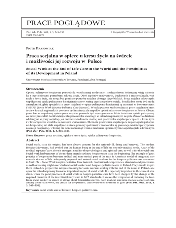 prace poglądowe Piel. Zdr. Publ. 2011, 1, 3, 245–250 ISSN 2082-9876 © Copyright by Wroclaw Medical University Piotr Krakowiak Praca socjalna w opiece u kresu życia na świecie i możliwości jej rozwoju w Polsce Social Work at the End of Life Care in the World and the Possibilities of its Development in Poland Uniwersytet Mikołaja Kopernika w Toruniu, Fundacja Lubię Pomagać Streszczenie Opieka paliatywno-hospicyjna przywróciła współczesnej medycynie i społeczeństwu holistyczną wizję człowieka z jego złożonymi potrzebami u kresu życia. Obok aspektów medycznych, duchowych i emocjonalnych, ważnych u kresu życia, nie mogą być pomijane potrzeby socjalne chorego i jego bliskich. Praca socjalna od początku współczesnej opieki paliatywno-hospicyjnej stanowi ważną część zespołowej opieki. Przykładem może być model amerykański, gdzie specjaliści z pracy socjalnej w opiece paliatywno-hospicyjnej są zrzeszeni w Stowarzyszeniu SWHPN (Social Work Hospice-Palliative Care Network). Wysoki poziom profesjonalizacji pracy socjalnej u kresu życia w krajach anglosaskich powinien być inspiracją dla zespołów opieki paliatywno-hospicyjnej w Polsce. Obecna przez lata w zespołowej opiece praca socjalna przestała być wymaganiem na liście świadczeń opieki paliatywnej, co może prowadzić do likwidacji etatu pracownika socjalnego w interdyscyplinarnym zespole. Zarówno działania edukacyjne w pracy socjalnej, jak również świadomość istotnej roli pracownika socjalnego w opiece u kresu życia i w towarzyszeniu w żałobie są ważnymi wyzwaniami. Obecność pracownika socjalnego w zespole opieki paliatywno-hospicyjnej lub stała współpraca z siecią pomocy społecznej w środowisku są gwarancją właściwego wypełniania misji hospicyjnej, w której nie może zabraknąć troski o medyczne i pozamedyczne aspekty opieki u kresu życia (Piel. Zdr. Publ. 2011, 1, 3, 245–250). Słowa kluczowe: praca socjalna, opieka u kresu życia, opieka paliatywno-hospicyjna. Abstract Social work, since it’s origins, has been always concern for the seriously ill, dying and bereaved. The modern Hospice Movement, had evoked that the human being at the end of life has not only medical needs. Apart of the medical aspects of care, there is an urgent need for the psychological and spiritual care, as well as for the social care. Social work has been part of the modern interdisciplinary hospice team since the beginning. The example of good practice of cooperation between medical and non-medical part of the team is American model of integrated care towards the end of life. Adequately prepared and trained social workers for the hospice-palliative care are united in SWHPN – Social Work Hospice-Palliative Care Network. Professional competencies, standards and procedures, as well as training might overwhelmed social workers and hospice-palliative teams in Poland. They should inspire them instead, to prepare the adequate training for social workers dealing with the end of life issues in Poland, and open the interdisciplinary teams for important impact of social work. It is especially important in the current situation, when the good practices of social work in hospice-palliative care have been stopped by the change of the required members of the interdisciplinary team in NFZ standards. It creates the temptation of reducing the team from social worker in search of always short financial resources. Both medical, and non-medical aspects of care, among them social work, are crucial for the patients, their loved ones and those in grief (Piel. Zdr. Publ. 2011, 1, 3, 245–250). Key words: social work, end of life care, hospice-palliative care. 246 P. Krakowiak Troska o człowieka umierającego od zawsze była zadaniem, z którym musieli się zmierzyć jego najbliżsi i przedstawiciele lokalnej społeczności, troszczącej się zarówno o medyczne, jak i socjalne oraz duchowe aspekty opieki. Od XIX w., w związku z gwałtownym rozwojem medycyny i stopniową izolacją człowieka ciężko chorego od społeczeństwa, umieranie stawało się coraz bardziej problemem czysto medycznym. Dzięki współczes nemu ruchowi hospicyjnemu, stopniowo przestaje być ono jednak wyłącznie domeną zespołu medycznego, stając się wyzwaniem dla grupy profesjonalistów różnych dziedzin, współpracujących z rodziną w opiece u kresu życia [1]. W zespole opiekuńczym ważne miejsce zajmuje pracownik socjalny, odpowiadający na potrzeby chorego i jego bliskich. Przypomnienie genezy pracy socjalnej jako dyscypliny opieki, a następnie przedstawienie współczesnego ruchu hospicyjnego pozwolą ukazać istniejącą współpracę dla dobra człowieka u kresu życia na świecie i możliwości podobnych działań w Polsce. Praca socjalna i jej zadania w opiece u kresu życia (end of life care) Praca socjalna (social work) jako dyscyplina powstała w świecie anglosaskim, gdzie została podzielona na liczne grupy profesjonalne [2]. W Polsce jej rozwój wiązał się z teoretycznymi pracami i ich praktycznymi aplikacjami, zainicjowanymi przez Helenę Radlińską [3]. Istotnym elementem wpływającym na współczesny obraz pracy socjalnej miały również prace nestora pedagogiki społecznej – Aleksandra Kamińskiego. Choć główny akcent pracy społecznej był związany z troską o rozwój dzieci i młodzieży lub los rodzin i osób wykluczonych, to u podstaw pracy socjalnej w Polsce była także troska o chorych i osoby osierocone [4]. Obecnie w kreowaniu modelu pracy socjalnej zwraca się szczególną uwagę na kwestie integralnego oddziaływania pomocowego oraz kreowania postaw i modelu kształcenia pracownika socjalnego [5]. Istotnym elementem działań związanych z integracją opieki medycznej i pomocy społecznej jest zaangażowanie organizacji pozarządowych i wolontariatu w działaniach pomocowo-opiekuńczych. Powstają programy, w których elementy pracy socjalnej są prezentowane wolontariuszom jako pola