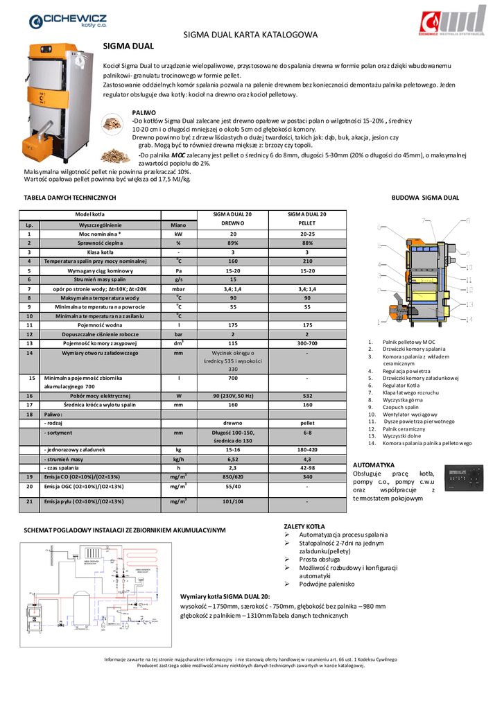 SIGMA DUAL KARTA KATALOGOWA SIGMA DUAL Kocioł Sigma Dual to urządzenie wielopaliwowe, przystosowane do spalania drewna w formie polan oraz dzięki wbudowanemu palnikowi- granulatu trocinowego w formie pellet. Zastosowanie oddzielnych komór spalania pozwala na palenie drewnem bez konieczności demontażu palnika peletowego. Jeden regulator obsługuje dwa kotły: kocioł na drewno oraz kocioł pelletowy. PALIWO -Do kotłów Sigma Dual zalecane jest drewno opałowe w postaci polan o wilgotności 15-20% , średnicy 10-20 cm i o długości mniejszej o około 5cm od głębokości komory. Drewno powinno być z drzew liściastych o dużej twardości, takich jak: dąb, buk, akacja, jesion czy grab. Mogą być to również drewna miększe z: brzozy czy topoli. -Do palnika MOC zalecany jest pellet o średnicy 6 do 8mm, długości 5-30mm (20% o długości do 45mm), o maksymalnej zawartości popiołu do 2%. Maksymalna wilgotność pellet nie powinna przekraczać 10%. Wartość opałowa pellet powinna być większa od 17,5 MJ/kg. TABELA DANYCH TECHNICZNYCH BUDOWA SIGMA DUAL Model kotła Lp. SIGM A DUAL 20 SIGM A DUAL 20 DREWN O PELLET kW 20 20-25 % 89% 88% - 3 3 o C 160 210 15-20 Wyszczególnienie Miano 1 Moc nomin aln a * 2 Sprawność ciepln a 3 Klasa kotła 4 Temperatura spalin przy mocy nomin alnej 5 Wymagan y ciąg kominow y Pa 15-20 6 Stru mień masy sp alin g/s 15 7 opór po stronie wody; ∆t=10K ; ∆t=20K mbar 3,4; 1,4 3,4; 1,4 8 Maksymaln a temperatura wod y o 90 90 9 Minimaln a te mperatu ra n a powrocie o 55 55 10 Minimaln a te mperatu ra n a z asilan iu o 175 C C C 11 Pojemność wodna l 175 12 Dopuszczalne ciśnienie robocze bar 2 2 13 Pojemność ko mory z asypowej dm 115 300-700 14 Wymiary otwo ru załadowczego mm Wycinek okręgu o średnicy 535 i wysokości 330 - l 700 - 15 Minimaln a poje mność zbiornika aku mulacyjnego 700 3 16 Pobór mocy elektrycznej W 90 (230V, 50 Hz) 532 17 Średnica króćc a wylo tu spalin mm 160 160 drewno pellet mm Długość 100-150, średnica do 130 6-8 180-420 18 Paliwo : - rodzaj - sortyment - jednorazowy z aładunek - strumień masy - czas spalan ia kg 15-16 kg/h 6,52 4,3 h 2,3 42-98 3 850/620 340 3 55/40 - 3 101/104 - 19 Emis ja C O (O2=10%)/(O2=13%) mg/ m 20 Emis ja OGC (O2=10%)/(O2=13%) mg/ m 21 Emis ja p yłu ( O2=10%)/(O2=13%) mg/ m SCHEMAT POGLADOWY INSTALACJI ZE ZBIORNIKIEM AKUMULACYJNYM 1. 2. 3. 4. 5. 6. 7. 8. 9. 10. 11. 12. 13. 14. Palnik pelleto wy M OC Drzwiczki komory spalani a Komora spal ania z wkładem ceramicznym Regul acja po wi etrza Drzwiczki komory załadunkowej Regul ator Kotl a Klapa łat wego rozruchu Wyczystka gó rna Czopuch spalin Wentyl ator wyci ągo wy Dysze powietrza pi erwotnego Palnik ceramiczny Wyczystki dolne Komora spal ania p alnika pel leto wego AUTOMATYKA Obsługuje pracę kotła, pompy c.o., pompy c.w.u oraz współpracuje z termostatem pokojowym ZALETY KOTŁA Automatyzacja procesu spalania Stałopalność 2-7dni na jednym załadunku(pellety) Prosta obsługa Możliwość rozbudowy i konfiguracji automatyki Podwójne palenisko Wymiary kotła SIGMA DUAL 20: wysokość – 1750mm, szerokość - 750mm, głębokość bez palnika – 980 mm głębokość z palnikiem – 1310mmTabela danych technicznych Informacje zawarte na tej stronie mają charakter informacyjny i nie stanowią oferty handlowej w rozumieniu art. 66 ust. 1 Kodeksu Cywilnego Producent zastrzega sobie możliwość zmiany niektórych danych technicznych zawartych w karcie katalogowej.