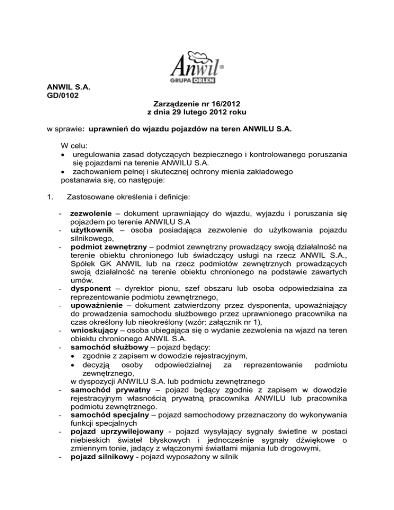 ANWIL S.A. GD/0102 Zarządzenie nr 16/2012 z dnia 29 lutego 2012 roku w sprawie: uprawnień do wjazdu pojazdów na teren ANWILU S.A. W celu: uregulowania zasad dotyczących bezpiecznego i kontrolowanego poruszania się pojazdami na terenie ANWILU S.A. zachowaniem pełnej i skutecznej ochrony mienia zakładowego postanawia się, co następuje: 1. Zastosowane określenia i definicje: - - - - - - zezwolenie – dokument uprawniający do wjazdu, wyjazdu i poruszania się pojazdem po terenie ANWILU S.A użytkownik – osoba posiadająca zezwolenie do użytkowania pojazdu silnikowego, podmiot zewnętrzny – podmiot zewnętrzny prowadzący swoją działalność na terenie obiektu chronionego lub świadczący usługi na rzecz ANWIL S.A., Spółek GK ANWIL lub na rzecz podmiotów zewnętrznych prowadzących swoją działalność na terenie obiektu chronionego na podstawie zawartych umów. dysponent – dyrektor pionu, szef obszaru lub osoba odpowiedzialna za reprezentowanie podmiotu zewnętrznego, upoważnienie – dokument zatwierdzony przez dysponenta, upoważniający do prowadzenia samochodu służbowego przez uprawnionego pracownika na czas określony lub nieokreślony (wzór: załącznik nr 1), wnioskujący – osoba ubiegająca się o wydanie zezwolenia na wjazd na teren obiektu chronionego ANWIL S.A. samochód służbowy – pojazd będący: zgodnie z zapisem w dowodzie rejestracyjnym, decyzją osoby odpowiedzialnej za reprezentowanie podmiotu zewnętrznego, w dyspozycji ANWILU S.A. lub podmiotu zewnętrznego samochód prywatny – pojazd będący zgodnie z zapisem w dowodzie rejestracyjnym własnością prywatną pracownika ANWILU lub pracownika podmiotu zewnętrznego. samochód specjalny – pojazd samochodowy przeznaczony do wykonywania funkcji specjalnych pojazd uprzywilejowany - pojazd wysyłający sygnały świetlne w postaci niebieskich świateł błyskowych i jednocześnie sygnały dźwiękowe o zmiennym tonie, jadący z włączonymi światłami mijania lub drogowymi, pojazd silnikowy - pojazd wyposażony w silnik - - - - - pojazd samochodowy – pojazd silnikowy, którego konstrukcja umożliwia jazdę z prędkością przekraczającą 25 km/h; określenie to nie obejmuje ciągnika rolniczego; pojazd wolnobieżny – pojazd silnikowy, którego konstrukcja ogranicza prędkość jazdy do 25 km/h, z wyłączeniem ciągnika rolniczego; obiekt chroniony – teren ANWILU S.A., który zgodnie z ustawą z dnia 22 sierpnia 1997 r. o ochronie osób i mienia (Dz.U. z 2005 r Nr 145, poz. 1221, z późniejszymi zmianami) podlega obowiązkowej ochronie, ochrona ANWILU S.A. – podmiot, który na podstawie zawartych umów realizuje usługę ochrony osób i mienia na rzecz ANWILU S.A. Biuro Przepustek – jednostka organizacyjna ochrony ANWIL S.A., zlokalizowana na bramie wejściowej nr 1a i nr 2, zajmująca się m.in. wystawianiem, przyjmowaniem, ewidencjonowaniem i rozliczaniem przepustek osobowych i materiałowych, Szef Ochrony – pracownik podmiotu świadczącego usługi ochrony osób i mienia nadzorujący realizację zadań ochrony, pracownik ochrony – pracownik firmy świadczącej na rzecz ANWILU S.A. usługę ochrony osób i mienia obiektów i terenów stanowiących własność ANWILU S.A. Generalny Dyrektor – Prezes ANWILU S.A., który zgodnie z ustawą o ochronie osób i mienia pełni funkcję kierownika obiektu podlegającego obowiązkowej ochronione 2. Zarządzenie dotyczy samochodów osobowych, ciężarowych, specjalnych, pojazdów wolnobieżnych i ciągników - służbowych i prywatnych. 3. Ze względów bezpieczeństwa nie przewiduje się wjazdu i poruszania się po ogrodzonym terenie ANWILU S.A. motocykli i motorowerów. 4. Korzystanie z rowerów na terenie ANWILU S.A. nie wymaga zezwolenia lecz wprowadza się obowiązek stosowania kamizelek odblaskowych i dodatkowo od zmroku do świtu używania oświetlenia roweru. 5. Wjazdy, wyjazdy samochodów w ramach obrotu towarowego regulują odrębne Zarządzenia dotyczące: - funkcjonowania systemu przepustek materiałowych w ANWILU S.A. - wprowadzenia elektronicznego systemu wydawania towarów z ANWILU S.A. 6. Wprowadza się następujące formy zezwoleń uprawniających do wjazdu, wyjazdu i poruszania się po terenie ANWILU S.A. 6.1 Zezwolenia na wjazd stałe, ważne na okres roku kalendarzowego. a) Zezwolenia stałe są dokumentami imiennymi zezwalającymi na wjazd określonego pojazdu na teren obiektu chronionego ANWILU S.A. Ważne są na dany rok kalendarzowy łącznie z przepustką osobową, a udostępnienie ich osobom nieupoważnionym jest zabronione. b) Zezwolenia stałe wymagane są dla: samochodów prywatnych w ramach limitów przyznawanych przez Generalnego Dyrektora ANWILU S.A. Zezwolenia stałe wystawiane są na wniosek dysponenta mającego siedzibę na terenie ANWILU S.A. w ramach przyznanych limitów, dla samochodów służbowych, nie objętych limitem. c) Zezwolenia stałe nadawane są tylko osobom, które decyzją dysponenta powinny posiadać uprawnienia do wjazdu na teren ANWILU S.A. Dysponent występuje z pisemnym wnioskiem - wzór według załącznika nr 1 i 2 do Szefa Prewencji. Wniosek zawierać musi uzasadnienie nadania uprawnień do wjazdu pojazdów. d) Nadanie uprawnienia do prowadzenia pojazdu służbowego na terenie zakładu osobie innej niż dysponent, wymaga wystawienia przez dysponenta dokumentu upoważnienia - wzór według załącznika nr 3 e) Wjazd/wyjazd na/z terenu zakładu wymaga wylegitymowania się na bramie jednocześnie zezwoleniem stałym i przepustką osobową oraz dodatkowo upoważnieniem w przypadku samochodu służbowego. 6.2 Zezwolenia okresowe na wjazd, ważne na czas wykonywania prac. a) Zezwolenia okresowe są dokumentami imiennymi zezwalającymi na okresowy wjazd pojazdu na teren obiektu chronionego ANWILU S.A. Ważne są łącznie z przepustką osobową, a udostępnianie ich osobom nieupoważnionym jest zabronione. b) Zezwolenia okresowe wystawiane są na ściśle określony czas, na wn