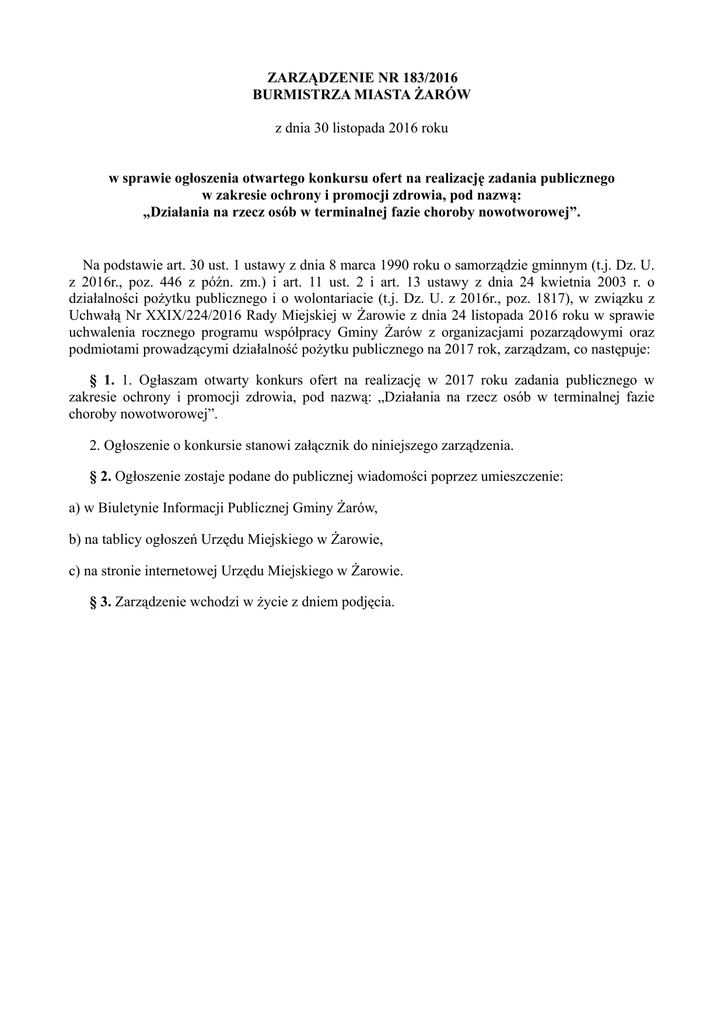 ZARZĄDZENIE NR 183/2016 BURMISTRZA MIASTA ŻARÓW z dnia 30 listopada 2016 roku w sprawie ogłoszenia otwartego konkursu ofert na realizację zadania publicznego w zakresie ochrony i promocji zdrowia, pod nazwą: „Działania na rzecz osób w terminalnej fazie choroby nowotworowej”. Na podstawie art. 30 ust. 1 ustawy z dnia 8 marca 1990 roku o samorządzie gminnym (t.j. Dz. U. z 2016r., poz. 446 z późn. zm.) i art. 11 ust. 2 i art. 13 ustawy z dnia 24 kwietnia 2003 r. o działalności pożytku publicznego i o wolontariacie (t.j. Dz. U. z 2016r., poz. 1817), w związku z Uchwałą Nr XXIX/224/2016 Rady Miejskiej w Żarowie z dnia 24 listopada 2016 roku w sprawie uchwalenia rocznego programu współpracy Gminy Żarów z organizacjami pozarządowymi oraz podmiotami prowadzącymi działalność pożytku publicznego na 2017 rok, zarządzam, co następuje: § 1. 1. Ogłaszam otwarty konkurs ofert na realizację w 2017 roku zadania publicznego w zakresie ochrony i promocji zdrowia, pod nazwą: „Działania na rzecz osób w terminalnej fazie choroby nowotworowej”. 2. Ogłoszenie o konkursie stanowi załącznik do niniejszego zarządzenia. § 2. Ogłoszenie zostaje podane do publicznej wiadomości poprzez umieszczenie: a) w Biuletynie Informacji Publicznej Gminy Żarów, b) na tablicy ogłoszeń Urzędu Miejskiego w Żarowie, c) na stronie internetowej Urzędu Miejskiego w Żarowie. § 3. Zarządzenie wchodzi w życie z dniem podjęcia. Uzasadnienie Zgodnie z art. 13 ustawy z dnia 24 kwietnia 2003r. o działalności pożytku publicznego i o wolontariacie (t.j. Dz. U. z 2016r., poz. 1817) organ administracji publicznej zamierzający zlecić realizację zadania publicznego organizacjom pozarządowym lub podmiotom wymienionym w art. 3 ust. 3, ogłasza otwarty konkurs ofert. Ogłoszenie otwartego konkursu ofert na realizację zadań publicznych w roku następnym może nastąpić na podstawie projektu uchwały budżetowej przekazanego organowi stanowiącemu jednostki samorządu terytorialnego na zasadach określonych w przepisach ustawy o finansach publicznych. W związku z powyższym uzasadnionym jest podjęcie niniejszego zarządzenia. Załącznik do Zarządzenia Nr 183/2016 Burmistrza Miasta Żarów z dnia 30 listopada 2016 roku Ogłoszenie Na podstawie art. 13 ustawy z dnia 24 kwietnia 2003 roku o działalności pożytku publicznego i o wolontariacie (tekst jednolity Dz. U. z 2016r., poz. 1817), w związku z Uchwałą nr XXIX/224/2016 Rady Miejskiej w Żarowie z dnia 24 listopada 2016 roku w sprawie uchwalenia rocznego programu współpracy Gminy Żarów z organizacjami pozarządowymi oraz podmiotami prowadzącymi działalność pożytku publicznego na 2017 rok, a także w związku z Projektem Uchwały Budżetowej na rok 2017, Burmistrz Miasta Żarów ogłasza otwarty konkurs ofert na realizację zadania publicznego w zakresie ochrony i promocji zdrowia, pod nazwą: „Działania na rzecz osób w terminalnej fazie choroby nowotworowej”. Proponowana kwota dotacji na realizację zadania wynosi 12.200,00 zł (słownie: dwanaście tysięcy dwieście złotych). Zakres zadania: - zapewnienie osobom w terminalnej fazie choroby nowotworowej opieki lekarskiej, pielęgniarskiej, duchowej i psychologicznej w domu chorego, - zapewnienie sprzętu medycznego niezbędnego w pielęgnacji osób w terminalnej fazie choroby, - zapewnienie wsparcia duchowego, psychologicznego, socjalnego i medycznego rodzinom osób chorych i osieroconych, - integrowanie ludzi gotowych nieść pomoc chorym, ich rodzinom i osieroconym. Zasady przyznania dotacji: 1. W konkursie mogą brać udział organizacje i podmioty określone w art. 11 ust. 3 ustawy z dnia 24 kwietnia 2003 r. o działalności pożytku publicznego i o wolontariacie (tekst jednolity Dz. U. z 2016r., poz. 1817), realizujące zadania statutowe w dziedzinie objętej konkursem oraz zamierzają realizować zadania na rzecz mieszkańców Gminy Żarów. 2. Powierzenie lub wsparcie realizacji zadania publicznego może zostać przekazane tylko podmiotom wyłonionym w drodze otwartego konkursu ofert. 3. Złożenie oferty o dofinansowanie nie jest równoznaczne z przyznaniem dotacji. 4. Warunkiem przystąpienia do konkursu jest złożenie w formie pisemnej wypełnionej oferty na druku stanowiącym załącznik do rozporządzenia Ministra Rodziny, Pracy i Polityki Społecznej z dnia 17 sierpnia 2016 roku w sprawie wzorów ofert i ramowych wzorów umów dotyczących realizacji zadań publicznych oraz wzorów sprawozdań z wykonania tych zadań (Dz. U. z 2016r., poz. 1300). 5. Po rozstrzygnięciu konkursu ofert z wybranym oferentem zostanie podpisana stosowna umowa. Termin i warunki realizacji zadania: 1. Zadanie winno być wykonane w 2017 roku. Szczegółowy termin będzie określony w umowie z wybranym podmiotem. 2. Zadanie winno być realizowane z najwyższą starannością, zgodnie z zawartą umową. 3. Podmioty ubiegające o realizację zadania publicznego objętego konkursem zobowiązane są : - prowadzić działalność statutową w zakresie objętym konkursem, - dysponować odpowiednio wyszkoloną kadrą, zdolną do realizacji zadania objętego konkursem, - posiadać doświadczenie niezbędne do realizacji zadania objętego konkursem, - spełniać wymogi formalne określone w ustawie z dnia 24 kwietnia 2003r. o działalności pożytku publicznego i o wolontariacie (tekst jednolity Dz. U. z 2016r., poz. 1817) oraz w rozporządzeniu Ministra Rodziny, Pracy i Polityki Społecznej z dnia 17 sierpnia 2016 roku w sprawie wzorów ofert i ramowych wzorów umów dotyczących realizacji zadań publicznych oraz wzorów sprawozdań z wykonania tych zadań (Dz. U. z 2016r., poz. 1300). Termin i warunki składania ofert: 1. Kompletne oferty należy składać w zaklejonych kopertach w terminie do dnia 22 grudnia 2016 roku do godz.12:00 z adnotacją ”KONKURS – nazwa zadania publicznego” w Biurze Obsługi Klienta Urzędu Miejskiego w Żarowie, ul. Zamkowa. O zachowaniu term