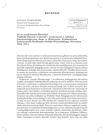 RECENZJE WITOLD STARNAWSKI Wydział Nauk Pedagogicznych Uniwersytet Kardynała Stefana Wyszyńskiego Warszawa Forum Pedagogiczne 2016/2 cz. 1 Wpłynęło: 2.11.2016 Zatwierdzono do druku: 24.05.2016 DOI: 10.21697/fp.2016.2.23 Po co wychowaniu filozofia? Naděžda Pelcová. Człowiek i wychowanie w ref leksji fenomenologicznej, tłum. A. Bystrzycka. Wydawnictwo Uniwersytetu Kardynała Stefana Wyszyńskiego, Warszawa 2014, 263 s. Od czasu do czasu zawarte w tytule pytanie powraca, głównie za sprawą filozofów, którzy próbują upominać się o dowartościowanie w wychowaniu najbardziej fundamentalnych pytań dotyczących natury człowieka, sensu życia, dróg i kierunków rozwoju. Zwykle takie apele bywają ignorowane. Część winy za to ponoszą sami filozofowie, którzy formułują swe twierdzenia zbyt apodyktycznie, bez zrozumienia specyfiki zagadnień pedagogicznych. Czasem za tymi zabiegami kryją się zakusy ideologiczne, niekiedy chęć promowania „własnej filozofii”. Rzadko zdarza się tak, że mamy do czynienia z rzetelnymi rozważaniami filozoficznymi, skupiającymi się na tematach istotnych filozoficznie, a zarazem doniosłych z pedagogicznego punktu widzenia. Połączenie „zmysłu filozoficznego” z wrażliwością pedagogiczną jest bardzo rzadkie, ale książka Nadĕždy Pelcovej pokazuje, że jest to możliwe. Nosi ona tytuł Człowiek i wychowanie w refleksji fenomenologicznej, co jest pewnym zawężeniem wobec jej treści, jak sama Autorka zresztą przyznaje. Jest to zbiór rozważań skupiających się na fenomenie wychowania, rozumianym filozoficznie, stanowiącym pewną całość, choć każdy z rozdziałów może być potraktowany jako odrębny tekst. Jak podkreśla Autorka, powstanie tych szkiców związane jest z faktem prowadzenia przez nią cyklu wykładów na Wydziale Nauk Pedagogicznych Uniwersytetu Kardynała Stefana Wyszyńskiego w 2013 roku (przy okazji warto chyba sprostować, że były na nich obecne nie tylko słuchaczki, znalazł się tam zapewne niejeden słuchacz, choć może trudno go było dostrzec wśród przedstawicieli tej nazbyt chyba sfeminizowanej profesji). Pierwsza część zbioru dotyczy zagadnień ontologicznych (nie w rozumieniu fenomenologicznym, a więc właściwie metafizycznych) i antropologicznych, przy czym Autorka wybrała stanowiska filozoficzne, które nie traktują wychowania instrumentalnie. Są to koncepcje Wilhelma Diltheya, Maxa Schelera, Martina Bubera, Edmunda Husserla, Martina Heideggera, Eugena Finka, Emanuela Levinasa, Hannah Arendt i Jana Patočki. Są to więc nie tylko 338 RECENZJE [2] fenomenologowie w wąskim rozumieniu znaczenia tego słowa. Na szczególną uwagę zasługują poglądy Jana Patočki, które Autorka przedstawia ze szczególną wnikliwością, a nawet można rzec, z pietyzmem. Ten filozof, niestety mało w Polsce znany, zasługuje na przypomnienie i ponowne odkrycie, choćby ze względu na to, że prezentuje taki typ wrażliwości, który może być przez polskiego czytelnika dobrze rozumiany – chodzi tu zarówno o podobny typ doświadczeń historycznych, jak i swoiste personalistyczne podejście – niezakorzenione w idealistycznej filozofii, lecz odwołujące się do doświadczeń jednostkowych. Część druga zatytułowana Filozofia wychowania jest wyrazem zdziwień czy zadziwień wobec napięć, przeciwności, wręcz paradoksów kryjących się w wychowaniu. Kryje się w tym postawa poszukiwacza, który zatrzymuje się, pyta, kwestionuje to, co uważane jest za oczywistość, wzbudza niepokój, odkrywa przed nami długą listę pytań i problemów. Czyni tak nie dlatego, aby podważać i burzyć, lecz aby odnawiać i odświeżać sprawę wychowania – gdyby stała się tylko rutyną, metodą czy wręcz techniką, byłaby to oznaka jej obumierania, a więc braku zainteresowania nią samą (któż interesuje się wiedzą, w której wszystko jest znane) i jej rzeczywistym upadkiem – człowiek nie jest produktem ani maszyną i nie da się nigdy opisać w pełni przez kategorie spoza świata ludzkiego. Tak widzę główną wartość pracy. Przedstawiane problemy – niektóre z nich zdawałoby się nierozwiązywalne, inne rozpisane w wielu wariantach, których nie sposób zredukować do jednej odpowiedzi, tak jak trudno z wielu filozofii uczynić jedną, a wiele wątków i punktów widzenia zredukować do jednego przekazu – świadczą o żywotności problematyki wychowania. Dopóki będziemy pytali o to, czym jest wychowanie, toczyli o nie spory, dopóty pozostanie ono czymś ludzkim, nie stanie się zagadnieniem technicznym. W tym sporze człowieka przeciw rzeczom, bezinteresowności przeciw instrumentalizacji, widzę najważniejszą wartość propozycji przedstawionej przez Autorkę. (Trudno mi się jednak zgodzić z zawartym we wstępie zdaniem: „Naszym najważniejszym zadaniem nie jest rozwiązywanie problemów dotyczących wychowania, lecz zrozumienie ich znaczenia w życiu” – rzeczą filozofia jest rozumieć, rzeczą pedagoga – rozwiązywać problemy lub próbować to robić. Temu, kto podejmuje się pracy z dziedziny filozofii wychowania, nie powinien ujść z pola uwagi praktyczny aspekt wychowania, powinno to być więc połączenie theoria i praxis w arystotelesowskim rozumieniu). Po tych uwagach ogólnych pora przejść do bardziej szczegółowej analizy prezentowanych w książce problemów. Chciałbym sformułować kilka spostrzeżeń, które posłużą jako podstawa do dalszej dyskusji. We wstępie Autorka kreśląc podstawowe pytania, które pojawiają się w wyniku refleksji nad wychowaniem, stwierdza, iż „wychowanie trzeba zakwestionować, gdyż jego celem jest to, żeby wychowanek (…) stał się w końcu samodzielnym i niezależnym człowiekiem, którego nikt nie ma prawa w nieskończoność wychowywać” (s. 10). To stwierdzenie, w części prowokacyjne, zawiera jednak niepokojącą interpretację samowychowania – bo o nie, jak sądzę, tu idzie. Mi