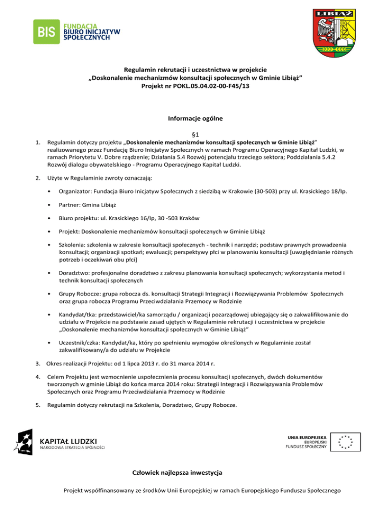 Regulamin rekrutacji i uczestnictwa w projekcie „Doskonalenie mechanizmów konsultacji społecznych w Gminie Libiąż” Projekt nr POKL.05.04.02-00-F45/13 Informacje ogólne §1 1. Regulamin dotyczy projektu „Doskonalenie mechanizmów konsultacji społecznych w Gminie Libiąż” realizowanego przez Fundację Biuro Inicjatyw Społecznych w ramach Programu Operacyjnego Kapitał Ludzki, w ramach Priorytetu V. Dobre rządzenie; Działania 5.4 Rozwój potencjału trzeciego sektora; Poddziałania 5.4.2 Rozwój dialogu obywatelskiego - Programu Operacyjnego Kapitał Ludzki. 2. Użyte w Regulaminie zwroty oznaczają: • Organizator: Fundacja Biuro Inicjatyw Społecznych z siedzibą w Krakowie (30-503) przy ul. Krasickiego 18/Ip. • Partner: Gmina Libiąż • Biuro projektu: ul. Krasickiego 16/Ip, 30 -503 Kraków • Projekt: Doskonalenie mechanizmów konsultacji społecznych w Gminie Libiąż • Szkolenia: szkolenia w zakresie konsultacji społecznych - technik i narzędzi; podstaw prawnych prowadzenia konsultacji; organizacji spotkań; ewaluacji; perspektywy płci w planowaniu konsultacji [uwzględnianie różnych potrzeb i oczekiwań obu płci] • Doradztwo: profesjonalne doradztwo z zakresu planowania konsultacji społecznych; wykorzystania metod i technik konsultacji społecznych • Grupy Robocze: grupa robocza ds. konsultacji Strategii Integracji i Rozwiązywania Problemów Społecznych oraz grupa robocza Programu Przeciwdziałania Przemocy w Rodzinie • Kandydat/tka: przedstawiciel/ka samorządu / organizacji pozarządowej ubiegający się o zakwalifikowanie do udziału w Projekcie na podstawie zasad ujętych w Regulaminie rekrutacji i uczestnictwa w projekcie „Doskonalenie mechanizmów konsultacji społecznych w Gminie Libiąż” • Uczestnik/czka: Kandydat/ka, który po spełnieniu wymogów określonych w Regulaminie został zakwalifikowany/a do udziału w Projekcie 3. Okres realizacji Projektu: od 1 lipca 2013 r. do 31 marca 2014 r. 4. Celem Projektu jest wzmocnienie uspołecznienia procesu konsultacji społecznych, dwóch dokumentów tworzonych w gminie Libiąż do końca marca 2014 roku: Strategii Integracji i Rozwiązywania Problemów Społecznych oraz Programu Przeciwdziałania Przemocy w Rodzinie 5. Regulamin dotyczy rekrutacji na Szkolenia, Doradztwo, Grupy Robocze. Człowiek najlepsza inwestycja Projekt współfinansowany ze środków Unii Europejskiej w ramach Europejskiego Funduszu Społecznego Proces rekrutacji i zasady realizacji poszczególnych form wsparcia 1. 2. 3. 4. §2 Szkolenia Osoby chętne do wzięcia udziału w Szkoleniach realizowanych w ramach Projektu zgłaszają chęć uczestnictwa poprzez wypełnienie: formularza zgłoszeniowego, deklaracji przystąpienia do projektu, oświadczenia o wyrażeniu zgody na przetwarzanie danych osobowych Weryfikacji formalnej otrzymanych zgłoszeń dokonuje się na podstawie n/w kryteriów: 1) przedstawiciela/ka gm. Lubiąż lub pracownik jednostki samorządu terytorialnego gm. Libiąż (członek rady, członek komisji, pracownik Urzędu Miasta, pracownik jednostki samorządu terytorialnego - Miejski Zespół Administracyjny; Ośrodek Pomocy Społecznej; Libiąskie Centrum Kultury; Miejska Biblioteka Publiczna, Jednostki Oświatowe, Świetlica Środowiskowa) - odpowiedzialny za rozwiązywanie problemów społecznych w gm. Libiąż, przygotowanie dokumentów strategicznych i programów oraz ich konsultowanie 2) przedstawiciel/ka organizacji pozarządowej (członek, członek władz, pracownik lub stały wolontariusz organizacji) - odpowiedzialny za rozwiązywanie problemów społecznych w gm. Libiąż, przygotowanie dok. strategicznych i programów oraz ich konsultowanie, zainteresowany problematyką konsultacji społecznych 3) niski lub średni poziom wiedzy na temat konsultacji społecznych, w tym planowania konsultacji społecznych, podstaw prawnych, ewaluacji konsultacji społecznych 4) motywacja do wykorzystania - w praktyce - wiedzy nabytej podczas szkoleń Liczba miejsc jest ograniczona (16 os.), w związku z czym obowiązuje kolejność zgłoszeń. Okres realizacji rekrutacji na szkolenia: od 15 lipca do 16 sierpnia 2013 r. §3 Warunki realizacji Szkoleń 1. Organizator we współpracy z Partnerem zapewnia zaplecze lokalowe, techniczne i kadrowe, niezbędne do realizacji Szkoleń. 2. Udział w Szkoleniach jest bezpłatny. 3. Każdy uczestnik/ka otrzymuje komplet materiałów szkoleniowych oraz catering. 4. Organizator nie zwraca kosztów przejazdu ani kosztów noclegu. 5. Osoby, które nie zostały zakwalifikowane na Szkolenie, zostaną wpisane na listę rezerwową. W przypadku rezygnacji ze szkolenia osób zakwalifikowanych, mogą je zastąpić osoby z listy rezerwowej według kolejności, w jakiej znajdują się na liście. 6. Uczestnik/ka jest zobowiązany/a do udziału we wszystkich dniach szkoleniowych. 7. Szkolenie trwa 4 dni i obejmuje 32 godziny szkoleniowe, realizowane będzie w okresie VIII-IX.2013. 8. Rezygnacja z udziału w szkoleniu musi zostać zgłoszona najpóźniej na 7 dni roboczych przed datą pierwszego dnia szkolenia. 9. Warunkiem uzyskania zaświadczenia - certyfikatu o ukończeniu szkolenia - jest udział w całym bloku szkoleniowym. 10. Uczestnicy/czki szkoleń są zobowiązani do wypełnienia formularza będącego podstawą do stworzenia bazy Podsystemu Europejskiego Funduszu Społecznego (PEFS) stanowiącym wymóg realizacji szkolenia finansowanego z EFS. Jednocześnie uczestnicy składają oświadczenie o prawdziwości podawanych informacji i wyrażają zgodę na przetwarzanie tych danych. 11. W celu weryfikacji rezultatów oraz skuteczności działań projektu po zakończeniu realizacji projektu, uczestnicy/czki szkoleń są zobowiązani do udziału w systemie monitoringu obowiązującego w projekcie. Człowiek najlepsza inwestycja Projekt współfinansowany ze środków Unii Europejskiej w ramach Europejskiego Funduszu Społecznego §4 Doradztwo 1. Osoby chętne do wzięcia udzia