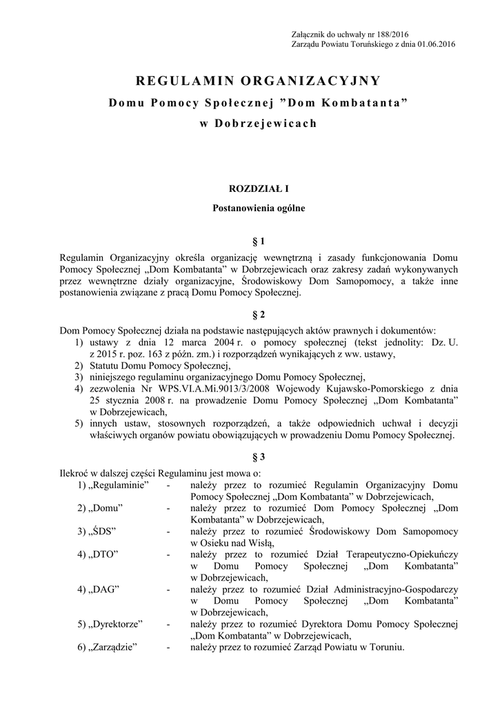 Załącznik do uchwały nr 188/2016 Zarządu Powiatu Toruńskiego z dnia 01.06.2016 REGULAMIN ORGANIZACYJNY Domu Pomocy Społecznej ”Dom Kombatanta” w Dobrzejewicach ROZDZIAŁ I Postanowienia ogólne §1 Regulamin Organizacyjny określa organizację wewnętrzną i zasady funkcjonowania Domu Pomocy Społecznej „Dom Kombatanta” w Dobrzejewicach oraz zakresy zadań wykonywanych przez wewnętrzne działy organizacyjne, Środowiskowy Dom Samopomocy, a także inne postanowienia związane z pracą Domu Pomocy Społecznej. §2 Dom Pomocy Społecznej działa na podstawie następujących aktów prawnych i dokumentów: 1) ustawy z dnia 12 marca 2004 r. o pomocy społecznej (tekst jednolity: Dz. U. z 2015 r. poz. 163 z późn. zm.) i rozporządzeń wynikających z ww. ustawy, 2) Statutu Domu Pomocy Społecznej, 3) niniejszego regulaminu organizacyjnego Domu Pomocy Społecznej, 4) zezwolenia Nr WPS.VI.A.Mi.9013/3/2008 Wojewody Kujawsko-Pomorskiego z dnia 25 stycznia 2008 r. na prowadzenie Domu Pomocy Społecznej „Dom Kombatanta” w Dobrzejewicach, 5) innych ustaw, stosownych rozporządzeń, a także odpowiednich uchwał i decyzji właściwych organów powiatu obowiązujących w prowadzeniu Domu Pomocy Społecznej. §3 Ilekroć w dalszej części Regulaminu jest mowa o: 1) „Regulaminie” należy przez to rozumieć Regulamin Organizacyjny Domu Pomocy Społecznej „Dom Kombatanta” w Dobrzejewicach, 2) „Domu” należy przez to rozumieć Dom Pomocy Społecznej „Dom Kombatanta” w Dobrzejewicach, 3) „ŚDS” należy przez to rozumieć Środowiskowy Dom Samopomocy w Osieku nad Wisłą, 4) „DTO” należy przez to rozumieć Dział Terapeutyczno-Opiekuńczy w Domu Pomocy Społecznej „Dom Kombatanta” w Dobrzejewicach, 4) „DAG” należy przez to rozumieć Dział Administracyjno-Gospodarczy w Domu Pomocy Społecznej „Dom Kombatanta” w Dobrzejewicach, 5) „Dyrektorze” należy przez to rozumieć Dyrektora Domu Pomocy Społecznej „Dom Kombatanta” w Dobrzejewicach, 6) „Zarządzie” należy przez to rozumieć Zarząd Powiatu w Toruniu. §4 1. Dom jest jednostką organizacyjną Powiatu Toruńskiego powołaną do wykonywania zadań publicznych w zakresie pomocy społecznej. 2. Dom przeznaczony jest dla 62 osób w podeszłym wieku, obu płci. Dom jest przystosowany dla potrzeb osób niepełnosprawnych, w tym poruszających się na wózkach inwalidzkich. 3. ŚDS przeznaczony jest dla 35 uczestników z zaburzeniami psychicznymi. ROZDZIAŁ II Organizacja Domu, podział zadań i kompetencji §5 1. Domem kieruje Dyrektor powoływany przez Zarząd. 2. Dyrektor kieruje Domem na zasadzie jednoosobowego kierownictwa i ponosi odpowiedzialność za wyniki pracy Domu. 3. Dyrektor kieruje Domem przy pomocy: 1) głównego księgowego, 2) kierownika ŚDS, 3) kierownika DTO, 4) kierownika DAG. 4. Dyrektora - w czasie jego nieobecności spowodowanej np. wyjazdem służbowym, urlopem wypoczynkowym - zastępuje kierownik DAG w zakresie zadań wskazanych w pełnomocnictwie. 5. W czasie długotrwałej nieobecności Dyrektora spowodowanej np. jego chorobą, Zarząd może powierzyć pełnienie obowiązków innej osobie, na czas tej nieobecności. 6. Dyrektor organizuje pracę, kieruje bieżącymi sprawami Domu oraz reprezentuje go na zewnątrz. 7. Dyrektor jest służbowym przełożonym wszystkich pracowników Domu. 8. Dyrektor Domu współdziała z organami samorządu terytorialnego w zakresie realizacji zadań pomocy społecznej, a w szczególności: 1) rozpatruje kierowane do niego inicjatywy, opinie i wnioski organów samorządu terytorialnego dotyczące pomocy społecznej, 2) uczestniczy w posiedzeniach organów samorządu terytorialnego dotyczących pomocy społecznej. 9. Do kompetencji Dyrektora należy w szczególności: 1) tworzenie warunków do realizacji zadań Domu określonych ustawami, aktami prawa wydanymi na ich podstawie oraz określonych w niniejszym Regulaminie, 2) określenie szczegółowej organizacji Domu, 3) dokonanie podziału zadań, kompetencji i odpowiedzialności pomiędzy głównego księgowego, kierownika DAG, kierownika DTO i kierownika ŚDS, 4) realizacja zasad polityki kadrowej i dbałość o należyty dobór pracowników, 5) zapewnienie skutecznej kontroli realizacji określonych zadań i przestrzegania przepisów prawa, 6) nawiązywanie i rozwiązywanie stosunków pracy z pracownikami Domu, 7) zapewnienie sprawnego funkcjonowania Domu, jego wszystkich obiektów oraz dbałość o ich stan techniczny i sanitarny. 10. Do wyłącznej kompetencji Dyrektora Domu należy: 1) wydawanie zarządzeń wewnętrznych, instrukcji i regulaminów regulujących organizację pracy Domu, str. 2 2) reprezentowanie Domu na zewnątrz, w tym składanie oświadczeń woli w imieniu Domu, 3) całokształt spraw obrony cywilnej związanych z funkcjonowaniem Domu, 4) utrzymywanie kontaktów z organami administracji państwowej i samorządowej oraz organizacjami społecznymi i pozarządowymi, 5) załatwianie spraw zgłaszanych w trybie skarg i wniosków. §6 1. Strukturę organizacyjną Domu stanowią: 1) Dział Terapeutyczno - Opiekuńczy, 2) Dział Ekonomiczno - Finansowy, 3) Dział Administracyjno - Gospodarczy, 4) Środowiskowy Dom Samopomocy. 2. Zadania z zakresu bezpieczeństwa i higieny pracy, w szczególności 1) monitorowanie i analizowanie stanu bezpieczeństwa i higieny pracy, 2) prowadzenie oceny ryzyka zawodowego, 3) opracowywanie programów szkoleń i prowadzenie szkoleń z zakresu bhp dla pracowników, 4) opracowanie instrukcji bhp i wdrażanie procedur bezpieczeństwa, 5) prowadzenie dokumentacji bhp, 6) nadzór nad sprawami dotyczącymi Bezpieczeństwa i Higieny Pracy oraz ochrony przeciwpożarowej jako usługa zostały zlecone – na podstawie umowy – podmiotowi zewnętrznemu. §7 1. Dyrektor Domu sprawuje bezpośredni nadzór nad: 1) Działem Opiekuńczo-Terapeutycznym, 2) Działem Finansowo-Księgowym, 3) Działem Administracyjno –Gospodarczym, 4) Środowiskowym Dome
