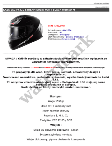 Informacje o produkcie Utworzono 03-03-2017 KASK LS2 FF320 STREAM SOLID MATT BLACK rozmiar M Cena : 333,00 zł er m ar k Nr katalogowy : AK41294 Producent : LS2 Dostępność : Dostępny Stan magazynowy : poniżej średniego Średnia ocena : brak recenzji UWAGA ! Odbiór osobisty w sklepie stacjonarnym jest możliwy wyłącznie po uprzednim kontakcie telefonicznym. Przedmiotem aukcji jest kask LS2 FF320 model STREAM SOLID kolor czarny matowy w rozmiarze M z wizjerem przeźroczystym w at To propozycja dla osób, które cenią, komfort, nowoczesny design i bezpieczeństwo. Nowoczesne wzornictwo, znakomite wykonanie, wysoka funkcjonalność to kaski LS2. To wszystko w bardzo atrakcyjnej cenie - dlatego kaski LS2 stają się coraz bardziej popularne w Europie. Kask idealny na każdy motocykl, skuter, motorower. Skorupa : Waga 1550gr Skład HPTT kompozytowe Jeden rozmiar skorupy Rozmiary S, M, L, XL Certyfikat ECE 22.05 / DOT WIZJER : Skład 3D optycznie poprawne - Lexan System szybkiego montażu Wizjer blokowany, płynne otwieranie i zamykanie Zabezpieczenie przed rysowaniem, zabezpieczenie przed promieniami UV Blenda przeciwsłoneczna Pinlock MAX WNĘTRZE : Laserowe cięcie pianki wyściółka dla doskonałego dopasowania. Pochłaniach wilgoci , anty - oder , antybakteryjne, wymienna wyjściółka, zmywalny, Szybkie osuszanie, miękkie tkaniny , osłona nosa , Ochraniacz podbrudka er m ar k WENTYLACJA : System In & Out - przednie wloty powietrza i wywietrzniki Tylne BEZPIECZEŃSTWO : w at System bardzo łatwy w obsłudze szybkiego zapięcia i odpięcia Quick release