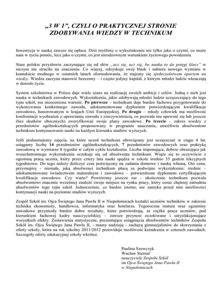 „3 W 1”, CZYLI O PRAKTYCZNEJ STRONIE ZDOBYWANIA WIEDZY W TECHNIKUM Inwestycja w naukę zawsze się opłaca. Dziś myślimy o wykształceniu nie tylko jako o czymś, co może nam w życiu pomóc, lecz jako o czymś, co jest nieodzownym warunkiem życiowego powodzenia. Stare polskie przysłowie zaczynające się od słów „ucz się, ucz się, bo nauka to do potęgi klucz” w niczym nie straciło na znaczeniu. Co więcej, odzyskuje swój blask i nabiera nowego wymiaru w kontekście modnego w ostatnich latach sformułowania, że stajemy się społeczeństwem opartym na wiedzy. Wiedza zaczyna stanowić bezcenny – i często jedyny kapitał, z którym młodzi ludzie wkraczają w dorosłe życie. System szkolnictwa w Polsce daje wiele szans na realizację swoich ambicji i celów. Jedną z nich jest nauka w technikach zawodowych. Wykształcenia, jakie zdobywają młodzi ludzie uczęszczający do tego typu szkół, ma nieoceniona wartość. Po pierwsze – technikum daje bardzo fachowe przygotowanie do wykonywania konkretnego zawodu, udokumentowane dyplomem potwierdzającym kwalifikacje zawodowe, honorowanym w krajach Unii Europejskiej. Po drugie – młody człowiek ma możliwość konfrontacji wyobrażeń o uprawianiu zawodu z rzeczywistością, co pozwala mu upewnić się lub jeszcze (bez skutków ubocznych) zweryfikować swoje plany zawodowe. Po trzecie – zakres wiedzy z przedmiotów ogólnokształcących proponowany w programie nauczania, umożliwia absolwentom technikum kontynuowanie nauki na każdym kierunku studiów wyższych. Jeśli podsumujemy zajęcia, na które uczeń technikum obowiązany jest uczęszczać w ciągu 4 lat, osiągamy liczbę 14 przedmiotów ogólnokształcących, 7 przedmiotów zawodowych oraz praktykę zawodową w wymiarze 8 tygodni w całym cyklu kształcenia. Liczba imponująca, dobrze obrazująca jak wszechstronnego wykształcenia oczekuje się od absolwenta technikum. Wiąże się to oczywiście z ogromną pracą ucznia, który przez cztery lata nauki spędza w szkole średnio 35 godzin lekcyjnych tygodniowo. Do tego należy doliczyć czas poświęcony na zadania domowe i naukę własną. Oto cena, przyznajmy - niemała, jaką absolwenci technikum płacą za podwójne wykształcenie: średnie – udokumentowane świadectwem maturalnym i zawodowe – potwierdzone dyplomem certyfikującym kwalifikacje zawodowe. Czy warto? Powtórzmy jeszcze raz - ukończenie technikum pozwala absolwentowi znacznie wcześniej znaleźć swoje miejsce na rynku pracy, który coraz chętniej zatrudnia absolwentów tego typu szkół. Jednocześnie, co bardzo istotne, nie zamyka przed nim możliwości kontynuacji nauki na poziomie studiów wyższych. Zespół Szkół im. Ojca Świętego Jana Pawła II w Niepołomicach kształci uczniów techników w zakresie technika ekonomisty, handlowca, informatyka oraz hotelarza. Tegoroczna matura oraz egzaminy zawodowe przyniosły bardzo dobre rezultaty, które potwierdzają, że ciężka praca uczniów, pod kierunkiem fachowej kadry nauczycielskiej – zawsze przynosi oczekiwane i satysfakcjonujące wszystkich efekty. Zestawienia statystyczne, prezentujące osiągnięcia absolwentów techników Zespołu Szkół im. Ojca Świętego Jana Pawła II, - mamy nadzieję - zachęcą gimnazjalistów do skorzystania z oferty szkoły, która na rok szkolny 2011/2012 przewiduje możliwość kształcenia w czterech zawodach. Szczegóły oferty edukacyjnej szkoły wkrótce. Paulina Szewczyk Wacław Sternal nauczyciele Zespołu Szkół im Ojca Świętego Jana Pawła II w Niepołomicach