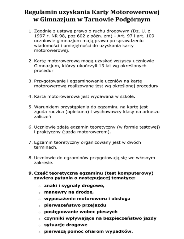 Regulamin uzyskania Karty Motorowerowej w Gimnazjum w