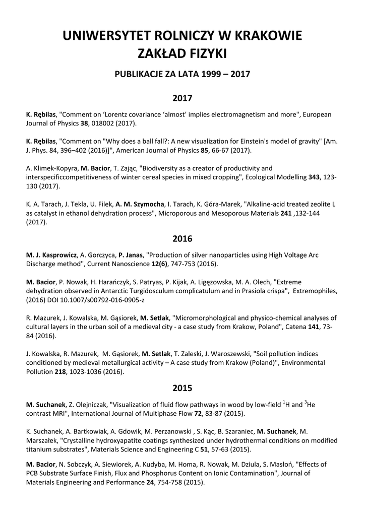 UNIWERSYTET ROLNICZY W KRAKOWIE ZAKŁAD FIZYKI PUBLIKACJE ZA LATA 1999 – 2017 2017 K. Rębilas, "Comment on ‘Lorentz covariance ‘almost’ implies electromagnetism and more", European Journal of Physics 38, 018002 (2017). K. Rębilas, "Comment on "Why does a ball fall?: A new visualization for Einstein's model of gravity" [Am. J. Phys. 84, 396–402 (2016)]", American Journal of Physics 85, 66-67 (2017). A. Klimek-Kopyra, M. Bacior, T. Zając, "Biodiversity as a creator of productivity and interspecificcompetitiveness of winter cereal species in mixed cropping", Ecological Modelling 343, 123130 (2017). K. A. Tarach, J. Tekla, U. Filek, A. M. Szymocha, I. Tarach, K. Góra-Marek, "Alkaline-acid treated zeolite L as catalyst in ethanol dehydration process", Microporous and Mesoporous Materials 241 ,132-144 (2017). 2016 M. J. Kasprowicz, A. Gorczyca, P. Janas, "Production of silver nanoparticles using High Voltage Arc Discharge method", Current Nanoscience 12(6), 747-753 (2016). M. Bacior, P. Nowak, H. Harańczyk, S. Patryas, P. Kijak, A. Ligęzowska, M. A. Olech, "Extreme dehydration observed in Antarctic Turgidosculum complicatulum and in Prasiola crispa", Extremophiles, (2016) DOI 10.1007/s00792-016-0905-z R. Mazurek, J. Kowalska, M. Gąsiorek, M. Setlak, "Micromorphological and physico-chemical analyses of cultural layers in the urban soil of a medieval city - a case study from Krakow, Poland", Catena 141, 7384 (2016). J. Kowalska, R. Mazurek, M. Gąsiorek, M. Setlak, T. Zaleski, J. Waroszewski, "Soil pollution indices conditioned by medieval metallurgical activity – A case study from Krakow (Poland)", Environmental Pollution 218, 1023-1036 (2016). 2015 M. Suchanek, Z. Olejniczak, "Visualization of fluid flow pathways in wood by low-field 1H and 3He contrast MRI", International Journal of Multiphase Flow 72, 83-87 (2015). K. Suchanek, A. Bartkowiak, A. Gdowik, M. Perzanowski , S. Kąc, B. Szaraniec, M. Suchanek, M. Marszałek, "Crystalline hydroxyapatite coatings synthesized under hydrothermal conditions on modified titanium substrates", Materials Science and Engineering C 51, 57-63 (2015). M. Bacior, N. Sobczyk, A. Siewiorek, A. Kudyba, M. Homa, R. Nowak, M. Dziula, S. Masłoń, "Effects of PCB Substrate Surface Finish, Flux and Phosphorus Content on Ionic Contamination", Journal of Materials Engineering and Performance 24, 754-758 (2015). K. Rębilas, "Thomas precession and torque", American Journal of Physics 83, 199-204 (2015). K. Rębilas, "Subtleties of the Thomas precession", European Journal of Physics 36, 045007 (2015). K. Rębilas, "Comment on "The pedagogical value of the four-dimensional picture: I. Relativistic mechanics of point particles" ", European Journal of Physics 36, 048002 (2015). A. Gorczyca, M. J. Kasprowicz, T. Lemek, "Bioactivity of MWCNT in Conidia of Entomopathogenic Fungus Isaria fumosorosea", Water, Air & Soil Pollution 226, 75 (2015). M. J. Kasprowicz, A. Gorczyca, A. M. Szymocha, "Physiological effects of nanosilver on vegetative mycelium, conidia and the development of the entomopathogenic fungus, Isaria fumosorosea", Biocontrol Science and Technology 25(8), 873-887 (2015). A. Gorczyca, E. Pociecha, M. J. Kasprowicz, M. Niemiec, "Effect of nanosilver in wheat seedlings and Fusarium culmorum culture systems", European Journal of Plant Pathology 142, 251-262 (2015). J. Mazurkiewicz, H. Kołoczek, P. Tomasik, "Effect of the external electric field on selected tripeptides", Amino Acids 47(7), 1399-1408 (2015). 2014 K. Rębilas, "Thomas precession: where is the torque? Another solution to the problem", European Journal of Physics 35, 065027 (2014). B. Głowacz, M. Suchanek, Z.Olejniczak, "Production of laser-polarized 3He gas via metastability exchange optical pumping for magnetic resonance imaging", Bio-Algorithms and Med-Systems 10(3), 129-137 (2014). A. M. Szymocha, A. Birczyński, Z. T. Lalowicz, G. Stoch, M. Krzystyniak, K. Góra-Marek, "Water Confinement in Faujasite Cages: A Deuteron NMR Investigation in a Wide Temperature Range. 1. Low Temperature Spectra", The Journal of Physical Chemistry A 118, 5359-5370 (2014). A. M. Szymocha, Z. T. Lalowicz, A. Birczyński, M. Krzystyniak, G. Stoch, K. Góra-Marek, "Water Confinement in Faujasite Cages: A Deuteron NMR Investigation in a Wide Temperature Range. 2. Spectra and Relaxation at High Temperature", The Journal of Physical Chemistry A 118, 5371-5380 (2014). A. Gorczyca, M. J. Kasprowicz, T. Lemek, "The physiological effects of multi-walled carbon nanotubes (MWCNTs) on conidia and the development of the entomopathogenic fungus, Metarhizium anisopliae (Metsch.) Sorok", Journal of Environmental Science and Health, Part A: Toxic/Hazardous Substances and Environmental Engineering 49, 741-752 (2014). A. Gorczyca, M. J. Kasprowicz, T. Lemek, "Physiological aspects of the interaction of multi-walled carbon nanotubes with Beauveria bassiana (Balsamo) Vuillem in entomopathogenic spores", Journal of Environmental Science and Health, Part A: Toxic/Hazardous Substances and Environmental Engineering 49, 863-868 (2014). J. Mazurkiewicz, P. Tomasik, "Effect of External Electric Field Upon Selected Model Dipeptides", Advances in Natural Science 7(1), 6-11 (2014). 2013 K. Rębilas, "Comment on "Elementary analysis of the special relativistic combination of velocities, Wigner rotation and Thomas precession" ", European Journal of Physics 34, L55-L61 (2013). K. Rębilas, "Optimal Ski Jump", The Physics Teacher 51, 108-109 (2013). A. Klimek-Kopyra, T. Zając, K. Rębilas, "A mathematical model for the evaluation of cooperation and competition effects in intercrops", European Journal of Agronomy 51, 9-17 (2013). M. J. Kasprowicz, A. Gorczyca, R. Frandsen, "The Effect of Nanosilver on Pigments Production by Fusarium culmorum (W. G. Sm.) Sacc.", Polish Journal of Microbiology 62(4), 365-37 (2013). T. Dohnalik, B. Głowacz, Z. Olejniczak, T. Pałasz, M. Suchanek, A. Wojna, "Spectroscopic issues in optical polarization of 3