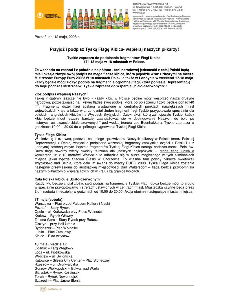 Poznań, dn. 12 maja, 2008 r. Przyjdź i podpisz Tyską Flagę Kibica- wspieraj naszych piłkarzy! Tyskie zaprasza do podpisania fragmentów Flagi Kibica. 17 i 18 maja w 18 miastach w Polsce. Ze wschodu na zachód i z południa na północ - fani narodowej jedenastki z całej Polski będą mieli okazje złożyć swój podpis na mega fladze kibica, która pojedzie wraz z Naszymi na mecze Mistrzostw Europy Euro 2008! W 18 miastach Polski a także w Londynie w weekend 17-18 maja każdy będzie mógł złożyć podpis na fragmencie ogromnej flagi, która poniesie Reprezentację do boju podczas Mistrzostw. Tyskie zaprasza do wsparcia „biało-czerwonych”! Złóż podpis i wspieraj Naszych! Takiej inicjatywy jeszcze nie było - każdy kibic w Polsce będzie mógł wesprzeć naszą drużynę narodową, pozostawiając na Tyskiej fladze swój podpis, która po połączeniu liczyć będzie ponad140 m2. Fragmenty dużej flagi zostaną wystawione w centralnych punktach największych miast wojewódzkich kraju a także w …Londynie! Jeden fragment flagi Tyskie przygotowało specjalnie dla polskich i angielskich kibiców na Wyspach Brytyjskich. Dzięki akcji, którą zainicjowało Tyskie, każdy kibic będzie mógł jeszcze bardziej zaangażować się w dopingowanie Naszych do boju po historycznym awansie „biało-czerwonych” pod wodzą trenera Leo Beenhakkera. Tyskie zaprasza w godzinach 10:00 – 20:00 do wspólnego sygnowania Tyskiej Flagi Kibica Tyska Flaga Kibica W niedzielę 1 czerwca, podczas ostatniego sprawdzianu Naszych piłkarzy w Polsce (mecz Polskiej Reprezentacji z Danią) wszystkie podpisane wcześniej fragmenty (wszystkie części z Polski i 1 z Londynu) zostaną zszyte. Łącznie fragmentów Tyskiej Flagi Kibica nastąpi podczas meczu Polaków. Duża flaga stworzy wtedy swoisty talizman dla „naszych najlepszych” – mega flagę kibica o wymiarach 12 x 12 metrów! Wszystko to odbędzie się w aurze magicznego w tych eliminacjach miejsca jakim będzie Stadion Śląski w Chorzowie. To właśnie tam polscy piłkarze świętowali zwycięstwo nad Belgią, które dało im awans do meczy EURO 2008. Tyska Flaga Kibica zostanie następnie przewieziona do austriackiej miejscowości Bad Waltersdorf – flaga będzie przypomniała naszym piłkarzom o wspierających ich w kraju i za granicą kibicach. Cała Polska kibicuje „biało-czerwonym” Każdy, kto będzie chciał złożyć swój podpis na fragmencie Tyskiej Flagi Kibica będzie mógł to zrobić w specjalnie przygotowanych strefach ustawionych w centrach miast. Miasteczka czynne będą przez 2 dni (sobota i niedziela) w godzinach od 10:00 do 20:00. Akcja obejmie następujące miasta i miejsca: 17 maja (sobota): Warszawa – Plac przed Pałacem Kultury i Nauki Poznań – Stary Rynek Opole – ul. Krakowska przy Placu Wolności Kraków – Rynek Główny Zielona Góra – Stary Rynek przy Ratuszu Olsztyn – przy Hali Urania Bydgoszcz – Plac Wolności Lublin – Plac Zamkowy Kielce – Plac Artystów 18 maja (niedziela): Gdańsk – Targ Węglowy Łodź – ul. Piotrkowska Wrocław – ul. Świdnicka Katowice – Silezia City Center – Plac Słoneczny Rzeszów – ul. Grunwaldzka Gorzów Wielkopolski – Bulwar nad Wartą Białystok – Rynek Kościuszki Toruń – Rynek Nowomiejski Szczecin – Plac Jasne Błonia „Tyskie wspiera Reprezentację Polski i jej trenera, Leo Beenhakkera. Dzięki tej społecznej inicjatywie każdy kibic będzie miał szanse wyrazić swoje poparcie dla naszej Reprezentacji a tym samym dodawać otuchy i sił drużynie ‘Latającego Holendra’. Podpiszmy fragmenty flagi i trzymajmy kciuki za ‘biało-czerwonych’ na Euro! Powodzenia i … Polska, ‘biało-czerwoni’ do boju” – powiedział Tomasz Kanton, Brand PR manager w Kompanii Piwowarskiej. Patronami medialnymi akcji są Radio ZET i telewizja TVN. Wesprzyj polską Reprezentację i podpisz Tyską Flagę Kibica! Więcej na www.nasinajlepsi.pl *** Tyskie. Nasze najlepsze. Od 2005 roku Tyskie wspiera zawodników Reprezentacji Polski (umowa jest kontynuacją, zapoczątkowanej w 1998 roku, współpracy z Reprezentacją Polski w piłce nożnej), jej trenera Leo Beenhakkera oraz kibiców, którzy z wiarą i oddaniem towarzyszom zmaganiom naszej "jedenastki". W związku z Mistrzostwami Świata w Niemczech marka Tyskie zorganizowała akcję "Wywieśmy flagi. Pomóżmy Naszym". Kibice solidaryzowali się z Reprezentacją Polski podczas Mudialu wywieszając spontanicznie w oknach i na balkonach swoich domów przygotowane specjalnie dla nich flagi kibica. Akcję kibicowania naszej reprezentacji wspierały czołowe polskie media, jak również znane osobistości świata kultury i sztuki. W czasie mundialu rozdano milion flag dla kibiców - akcja zakończyła się pełnym sukcesem. Tyskie to również czołowa marka Kompanii Piwowarskiej - jest niekwestionowanym liderem wśród wszystkich polskich marek piwa pod względem zarówno wielkości sprzedaży, jak i wygenerowanych wpływów. Tyskie wielokrotnie zostało uhonorowane najbardziej prestiżowymi nagrodami branży piwnej na całym świecie – w 2005 roku m.in. Złotym Medalem oraz Grand Prix podczas Międzynarodowego Konkursu Branży Piwowarskiej (The Brewing Industry International Awards), przeprowadzanego od roku 1886. Tyskie powtórzyło swój sukces z roku 2002 jako zdobywca tych obu wyjątkowych nagród. Kompania Piwowarska - Lider branży piwowarskiej w Polsce Kompania Piwowarska jest największym przedsiębiorstwem piwowarskim w Polsce. Kilkusetletnie doświadczenia w warzeniu piwa, nowoczesna technologia i rygorystyczne przestrzeganie zasad produkcji na światowym poziomie (World Class Manufacturing) gwarantują najwyższą jakość jej produktów. Do portfela marek należy TYSKIE (ulubione piwo Polaków), ŻUBR (druga marka w Polsce pod względem wielkości sprzedaży), LECH, Dębowe Mocne, Pilsner Urquell, Redd's, Dog in the Fog, Miller Genuine Draft, Peroni Nastro Azzurro oraz Wojak i 
