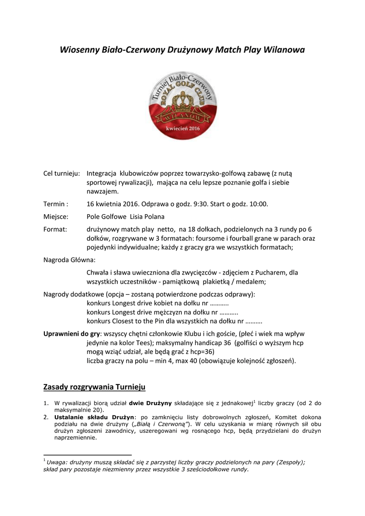 Wiosenny Biało-Czerwony Drużynowy Match Play Wilanowa Cel turnieju: Integracja klubowiczów poprzez towarzysko-golfową zabawę (z nutą sportowej rywalizacji), mająca na celu lepsze poznanie golfa i siebie nawzajem. Termin : 16 kwietnia 2016. Odprawa o godz. 9:30. Start o godz. 10:00. Miejsce: Pole Golfowe Lisia Polana Format: drużynowy match play netto, na 18 dołkach, podzielonych na 3 rundy po 6 dołków, rozgrywane w 3 formatach: foursome i fourball grane w parach oraz pojedynki indywidualne; każdy z graczy gra we wszystkich formatach; Nagroda Główna: Chwała i sława uwieczniona dla zwycięzców - zdjęciem z Pucharem, dla wszystkich uczestników - pamiątkową plakietką / medalem; Nagrody dodatkowe (opcja – zostaną potwierdzone podczas odprawy): konkurs Longest drive kobiet na dołku nr ……….. konkurs Longest drive mężczyzn na dołku nr ……….. konkurs Closest to the Pin dla wszystkich na dołku nr ………. Uprawnieni do gry: wszyscy chętni członkowie Klubu i ich goście, (płeć i wiek ma wpływ jedynie na kolor Tees); maksymalny handicap 36 (golfiści o wyższym hcp mogą wziąć udział, ale będą grać z hcp=36) liczba graczy na polu – min 4, max 40 (obowiązuje kolejność zgłoszeń). Zasady rozgrywania Turnieju 1. W rywalizacji biorą udział dwie Drużyny składające się z jednakowej1 liczby graczy (od 2 do maksymalnie 20). 2. Ustalanie składu Drużyn: po zamknięciu listy dobrowolnych zgłoszeń, Komitet dokona podziału na dwie drużyny („Białą i Czerwoną”). W celu uzyskania w miarę równych sił obu drużyn zgłoszeni zawodnicy, uszeregowani wg rosnącego hcp, będą przydzielani do drużyn naprzemiennie. 1 Uwaga: drużyny muszą składać się z parzystej liczby graczy podzielonych na pary (Zespoły); skład pary pozostaje niezmienny przez wszystkie 3 sześciodołkowe rundy. 3. Ustalenie składów Zespołów i flightów: w trosce o wyrównaną rywalizację i płynność gry, Komitet podzieli Drużyny na Zespoły o zbliżonej sumie handicapów i ustali składy flightów tak, by miały porównywalną „siłę gry”. 4. Mecz składa się z 3 rund po 6 dołków każda. W każdej rundzie grają wszyscy2 zawodnicy Runda I – Fourball: Zespoły dwuosobowe, każdy gracz Zespołu gra swoją piłką, liczy się wynik lepszego zawodnika z pary; Runda II – Foursome: Zespół dwuosobowy gra jedną piłką, uderzając ją naprzemiennie od tee do dołka; na zmianę także wykonywane są otwarcia z tee kolejnych dołków; Runda III – 2 Mecze Indywidualne: B1 vs C1 i B2 vs C2. 5. Gra Netto : - w meczach Fourball (Runda 1), do ustalenia ilości dodatkowych uderzeń Gracza na poszczególnych dołkach Rundy, zostanie uwzględniony jego handicap gry (HCPg), liczony ze 100% jego HCPd (dokładnego); [przykład: gracz o HCPd= 16,8 będzie grał z HCPg=18 czyli w Rundzie 1 będzie miał po jednym dodatkowym uderzeniu na każdym dołku; gracz o HCPd=12.2 będzie grał z HCPg=12 czyli w Rundzie 1 będzie miał po jednym dodatkowym uderzeniu na dołkach nr 2,3,5 i 6] - w meczach Foursome (Runda 2), Zespół otrzyma na tych 6 dołkach dodatkowe uderzenia równe 1/3 ilości wynikającej z handicapu gry Zespołu (HCPgz) określonego na podstawie wypadkowego handicapu dokładnego Zespołu (HCPdz) składającego się z 70% HCPd niższego i 30% HCPd wyższego. [przykład: Zespół B tworzą gracze o HCPd=12 i 24,3, więc HCPdz=0,70*12+0,30*24,3=15,7 co na Lisiej Polnie daje HCPgz=16, więc Zespół otrzyma 16/3=5,3 ~5 dodatkowych uderzeń; Zespół C ma HCPd= 16 i 36, więc HCPdz= 0,7*16+0,3*36=23,2 skąd HCPgz = 25 a ilość dodatkowych uderzeń na 6 dołkach wynosi 25/3=8,3~8; różnica między zespołami C i B wynosi 8-5=3 więc Zespół C będzie mógł odjąć od uzyskanego wyniku po 1 uderzeniu na 3 najtrudniejszych dołkach z 6-ki rozgrywanej w Rundzie 2. tj dołkach nr 8,9 i 11] - w meczach Indywidualnych (Runda 3), gracz o wyższym HCP otrzyma dodatkowe uderzenia na podstawie różnicy handicapów obliczonej dla 1/3 HCPg [ przykład: gracz B ma HCPg=18 , gracz C ma HCPg=12, różnica wynosi 1/3(18 – 12)=2, więc gracz B otrzyma po dodatkowym uderzeniu na dwóch najtrudniejszych dołkach tej rundy, czyli na Lisiej Polanie na dołkach nr 15 i 18]. 6. Przewidywany czas trwania Turnieju (18 dołków): ok. 4,5 godz., o ile będzie utrzymywane właściwe tempo gry (czas na wykonanie uderzenia i dojście do piłki), o co apeluje się do uczestników 7. Ustalanie wyników – zgodnie z ideą match play, każdy dołek w każdej z Rund, jest osobną rozgrywką i może być wygrany, przegrany lub zremisowany. Zespół otrzymuje „małe” punkty: 1 pkt za wygranie dołka i 0,5 pkt za remis. Wynik Zespołu za Rundę - Wynik Rundy każdego Zespołu jest sumą „małych” punktów za poszczególne dołki w Rundzie: wynik Rundy nazywa się „dużym punktem” i wynosi 1 pkt za wygranie Rundy nr 1 i 2 oraz 0,5pkt za jej zremisowanie. W Rundzie 3 toczą się dwa równoległe mecze, więc w tym etapie są do wygrania dwa „duże punkty”. Razem Zespół może uzyskać od 0 do 4 „dużych punktów” po rozegraniu wszystkich 18 dołków. Wynik końcowy Drużyny jest sumą „dużych punktów” uzyskanych we wszystkich 3 Rundach przez wszystkie Zespoły danej Drużyny; Zwycięzcą Turnieju jest Drużyna, która uzyska więcej „dużych” punktów po rozegraniu wszystkich trzech Rund. W przypadku końcowego remisu Zwycięską Drużynę wyłoni dogrywka na dołku nr 18, w której zmierzą się Kapitanowie Drużyn. Jeśli i ten pojedynek będzie remisowy, cały Turniej także będzie Zremisowany i nie będzie Drużyny Pokonanej. 8. Turniej rozgrywany jest w grupach (flightach) czteroosobowych, po dwie osoby (Zespół) z każdej Drużyny. 2 Uwaga: wprowadza się modyfikację systemu match play, polegającą na tym, że w każdej Rundzie Zespoły rozgrywają wszystkie 6 dołków, nawet jeśli wynik Rundy jest rozstrzygnięty wcześniej. Pozwoli to na przeprowa